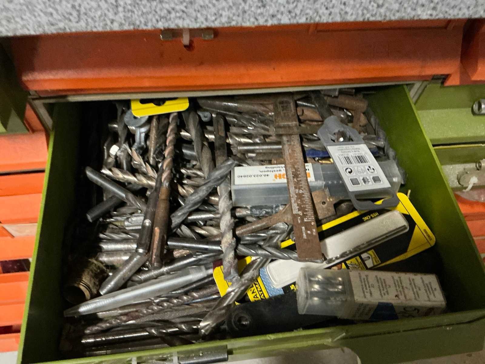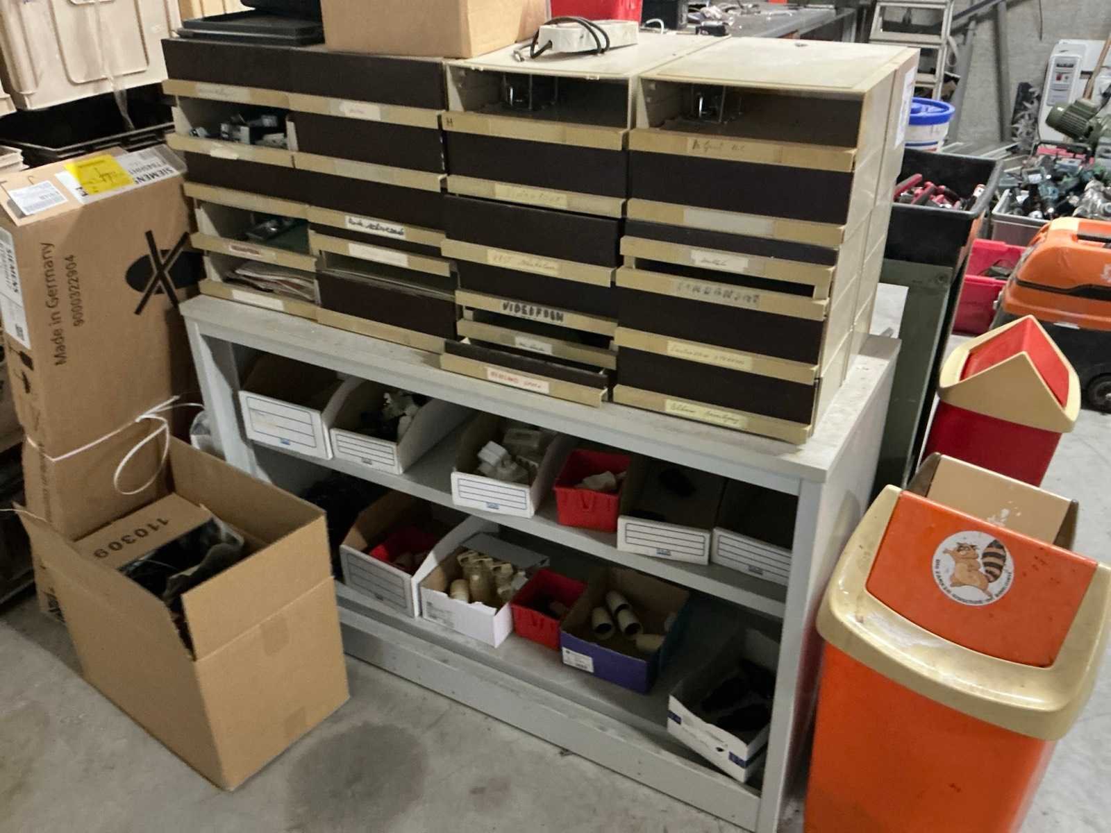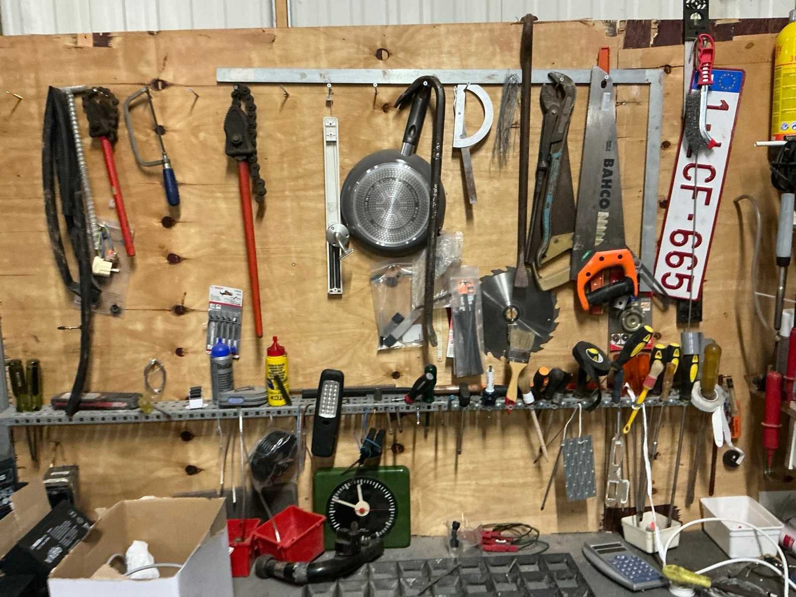 Allebei met bankschroef, inhoud bestaande uit handgereedschappen, voedingen, …. inclusief 2 rekjes en kast met diverse inhoud