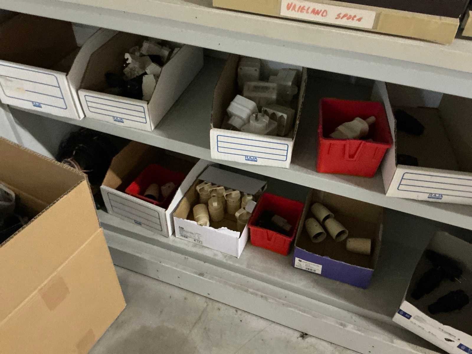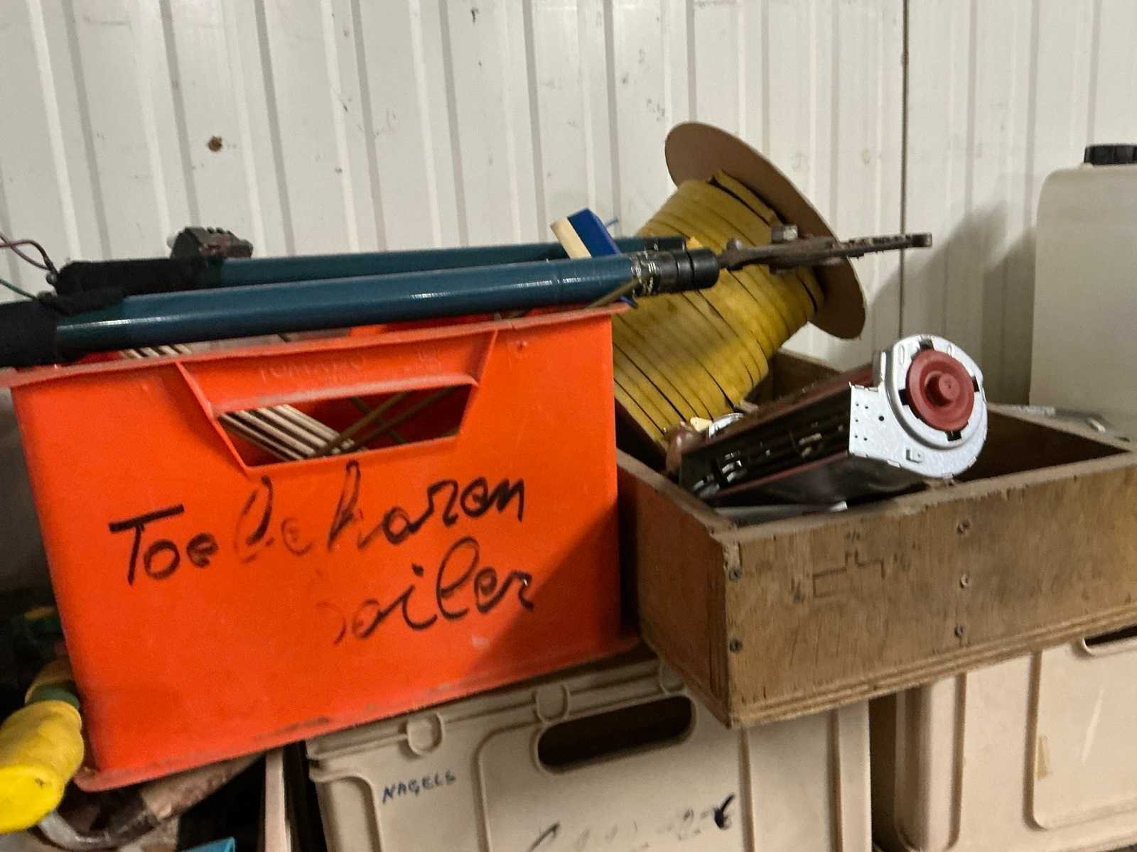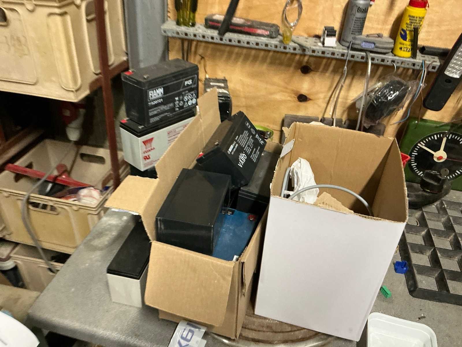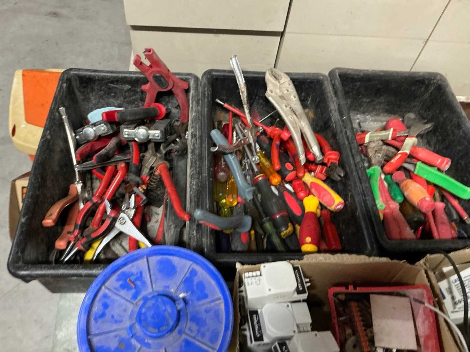 Allebei met bankschroef, inhoud bestaande uit handgereedschappen, voedingen, …. inclusief 2 rekjes en kast met diverse inhoud