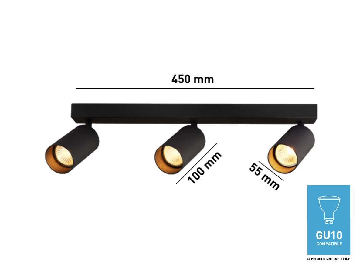 Afdichting IP20, product kleur zand zwart, afm. Ø 55 x 100mm, afm wandhouder 450 x 50mm, draaibaar 350° en kantelbaar 90°, materiaal aluminum en ijzer, bevestiging inclusief, fitting GU10, bulb niet inbegrepen, geschikt voor binnen, 3 x bulb invoer, voltage 220-240V, max 35 watt, SKU 00848 Merk: LAMPINNO Product type: Binnen Verstelbaar: true Fitting: GU10 Kleur: Zwart Lengte: 45cm Breedte: 5.5cm Hoogte: 10cm Materiaal: Aluminium