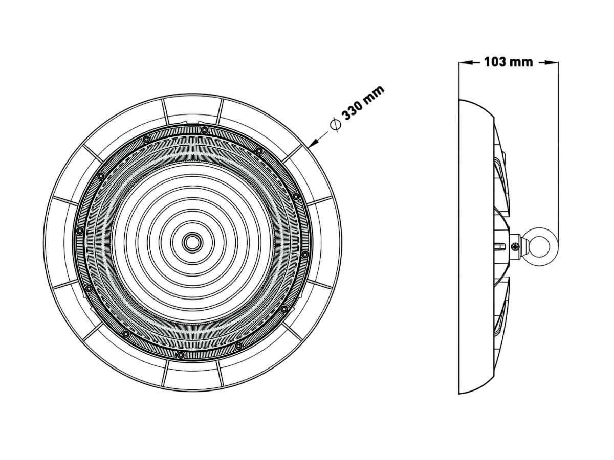 Lichtstroom 22000 lumen SMD LED, lichtkleur daglicht 5000K, afdichting IP65, Lineaire IC driver inbegrepen, flicker free, stralingshoek 90°, product kleur zand zwart, diam Ø 330 x 103mm, materiaal aluminum en PC lens, met lens nauwkeurige lichtbundels zonder verspilling voor maximale helderheid, bescherming tegen mechanische inslagen IK07, bevestigingsset niet inclusief, levensduur 30000 uren, voltage 200-240V, sku 1116 Merk: LAMPINNO Product type: Industrieel Spanning: 200-240V Kleurtemperatuur: 5000KK Lichtbron: LED Wattage: 200W Kleur: Zand Zwart Breedte: 33cm Hoogte: 10.3cm Materiaal: Aluminium en PC lens