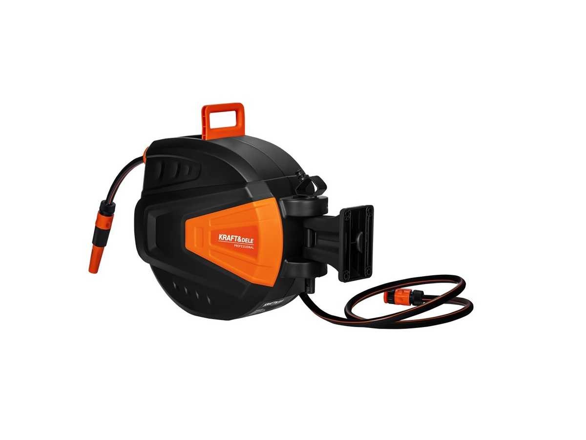 Intrekbare tuinslang 15 m + 1,5 m 1/2" Merk: KRAFT&DELE Handige tuinslanghaspel met automatische terugtrekking Kenmerken: . Automatische terugtrekking - snelle slangreiniging na het water geven . Wandmontage - ruimtebesparend en netjes in het tuingebied . Draaihendel - handige aanpassing van de werkrichting na installatie . Geïntegreerde slanggeleider - zelfs het lager zonder knopen of bochten . Vergrendel de slang op elke lengte - volledige controle tijdens het water geven . Remmechanisme - vermindert ongecontroleerde tipslagen . Weerbestendig - UV-bestendige en vorstbestendige kunststoffen Specificaties: . Lengte 15 m + 1,5 m . Buisdiameter 1/2" (11x15mm) . Connector diameter 3/4" . Bedrijfsdruk 8/24Bar . PVC-buismateriaal . Automatische opwinding Ja Conditie: Nieuw Merk: Kraft&dele