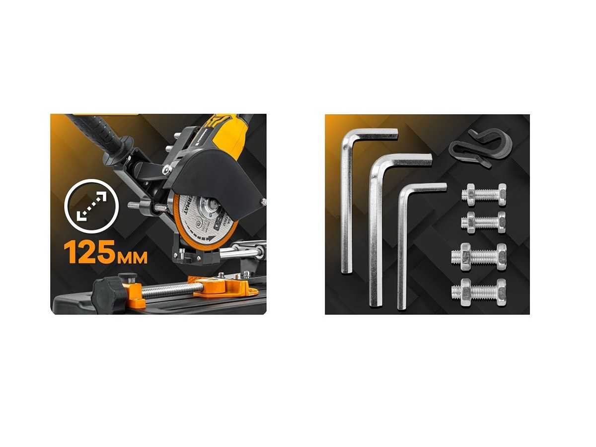 Haakse slijphouder Merk: POWERMAT Specificaties: . Maximale diameter van de wielschijf: 125 mm . Maximale snijdiepte: 65 mm . Maximale toevoer: 150 mm . Maximale klembreedte: 150 mm . Hellingshoek: 0 – 45 graden . Productgewicht: 3,7 kg . Productgewicht met verpakking: 4,2 kg . Productafmetingen (L / W / H): 49 cm x 26 cm x 31 cm Conditie: Nieuw
