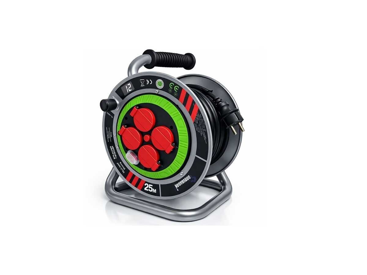 Verlengsnoer 20 m 3g x 2,5 mm Merk: ONDRAGON Specificaties: . Kabellengte: 25 m . Kabeldoorsnede: 3 x 2,5 mm . Aantal fittingen: 4 . Anchoring: Ja . Aan/uit-schakelaar: ja . Beschermingsklasse: IP44 . Spanning: 230V . Kabelmantel: natuurlijke PVC H05VV-F, bestand tegen mechanische schade, weersomstandigheden en chemicaliën (oliën, benzine en alcohol) . Maximale belasting (opgerold): 700W . Maximale belasting (verlengd): 2950W Ideaal voor bouwplaatsen, thuis en tuin Conditie: Nieuw