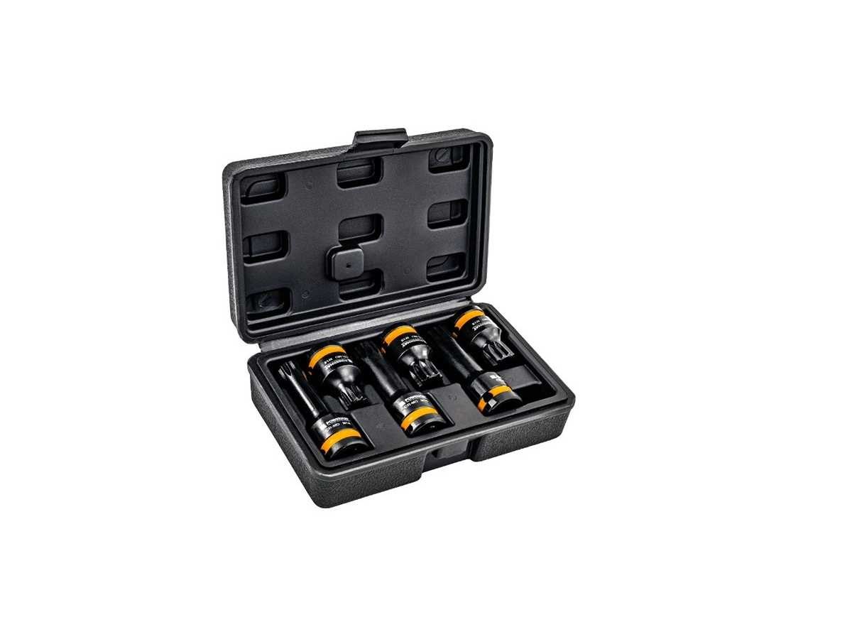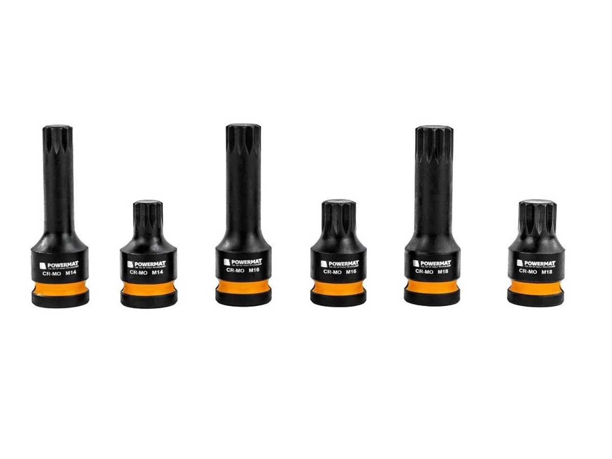Set impactdoppen in zijn koffer Merk: POWERMAT Specificaties: . Type: Spline Impact Socket Set . Aandrijf: 1/2" . Profiel: spline . Socketlengte: 78 mm en 45 mm . Materiaal: chroom-molybdeen staal Cr-Mo . Aantal stukken: 6 stukken . Socketmaten: M14, M16, M18 . Sockettype: Vierkant Conditie: Nieuw