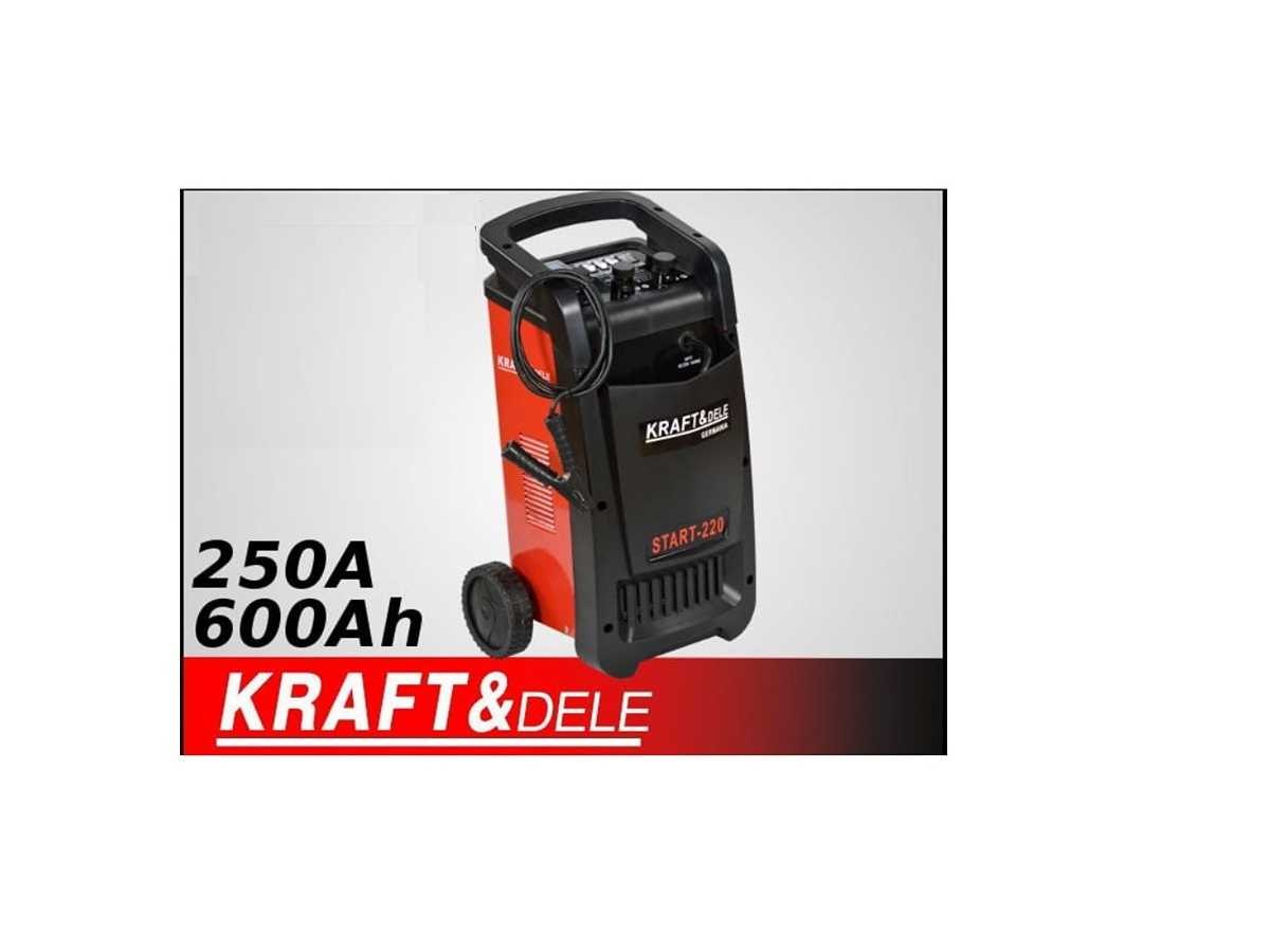 Lader met een 250A 12/24V startstation Merk: KRAFT&DELE Kenmerken: . Voeding: 1-fasige 230V 50/60Hz . Ondersteunde batterijen: 20Ah-600Ah . Laadspanning: 12/24V . Laadstroom: 40/55A . Starthuidig: 250A . Snel/langzaam opladen . Uitgerust met een ampèremeter . Gewicht: ca. 21 kg Conditie: Nieuw