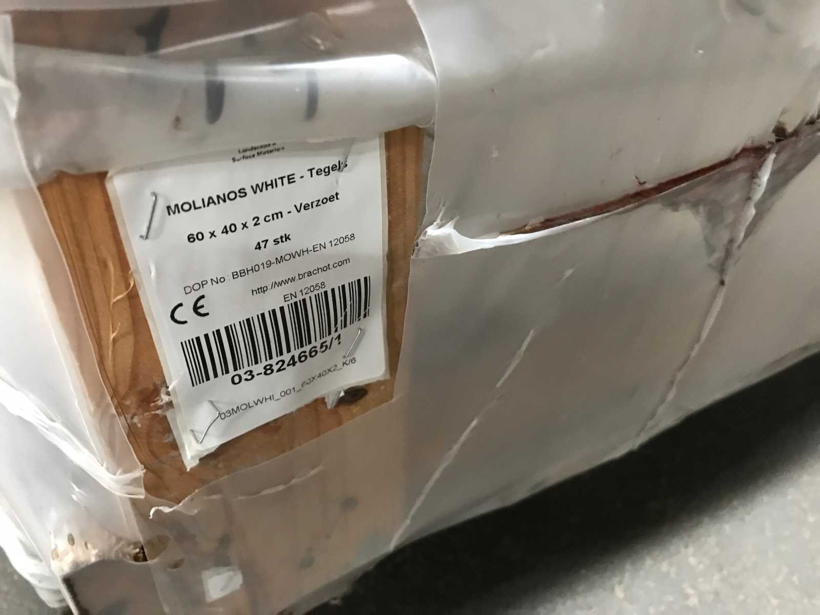Pallet: 1, afm.: 60x40x2, ca. 47stuks, ca. 11,28m2 Merk: Molianos White Verzoet