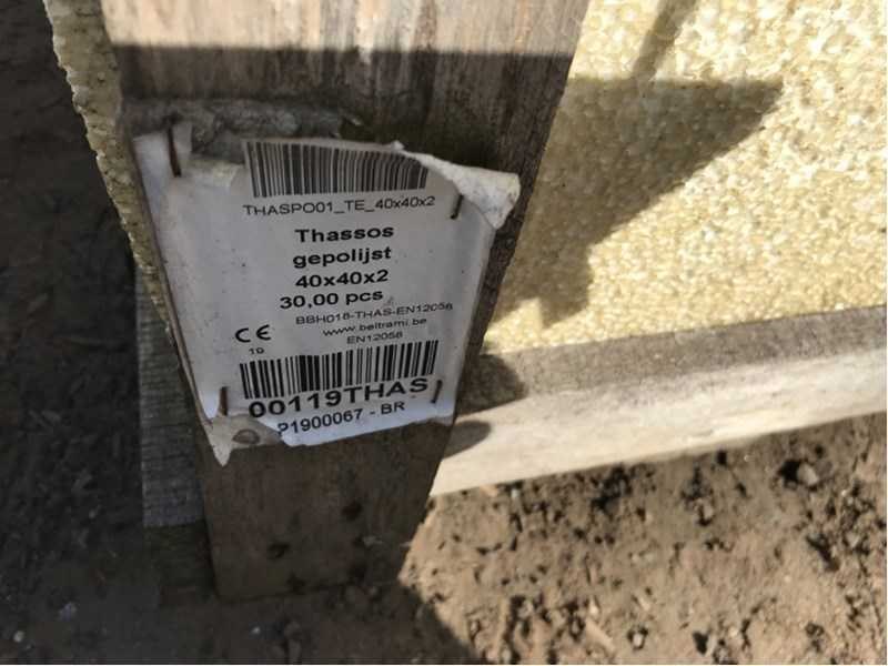 Palet: 2: Afm.: 40x40x2 cm; vloeroppervlakte: circa 11 m² Merk: Thassos gepolijst Model: Gepolijst