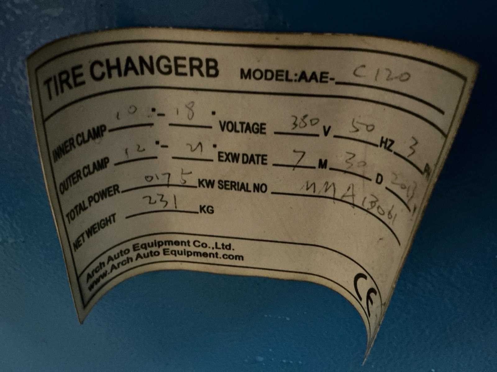 Merk: Arch Auto Equipment Type: AAE-C120 Capaciteit.: 21'' Aansluiting: 400V Eigen gewicht: 231kg Totale afmeting L: 1030mm Totale afmeting Breedte: 850mm Totale afmeting Hoogte: 1820mm
