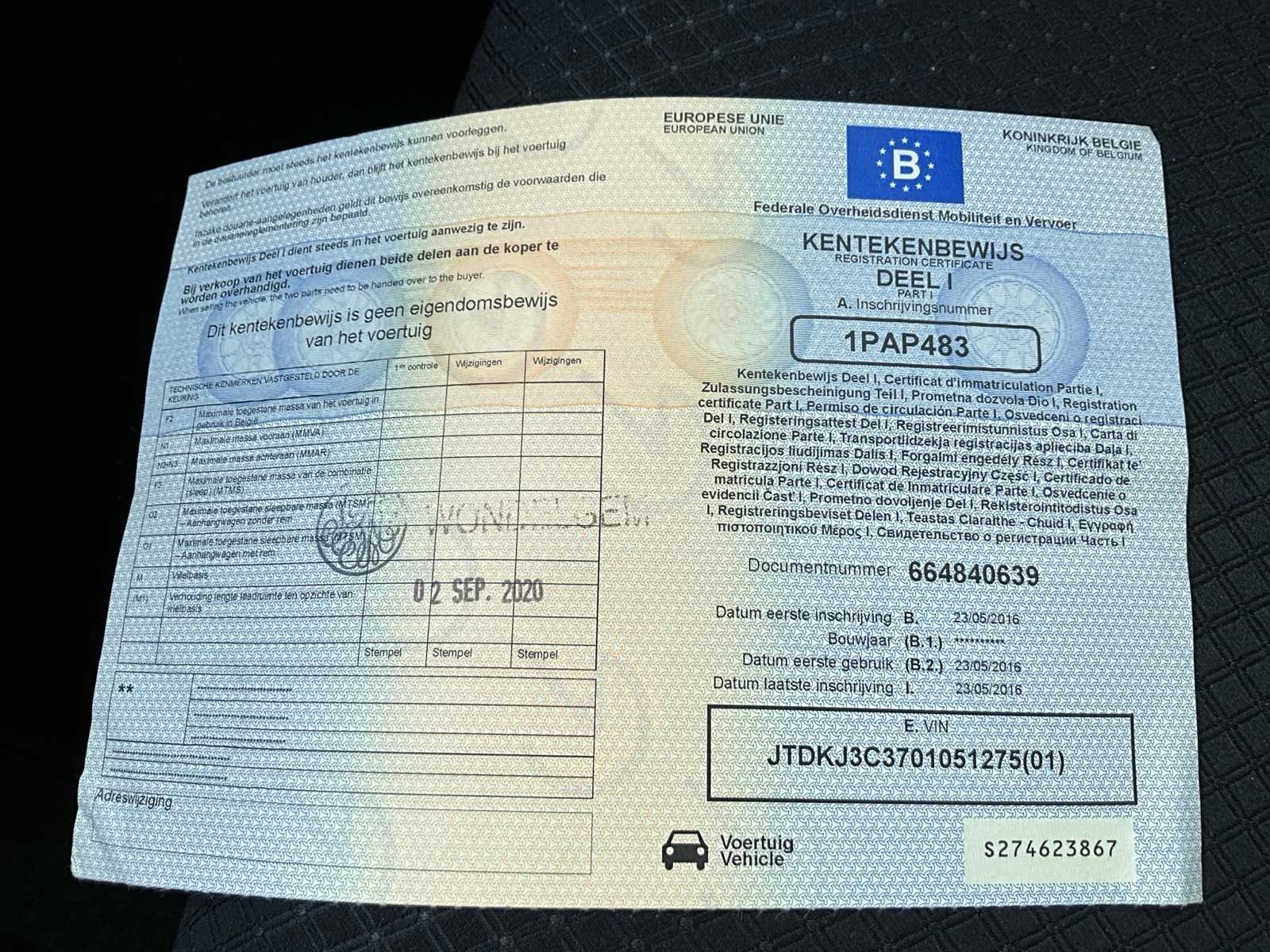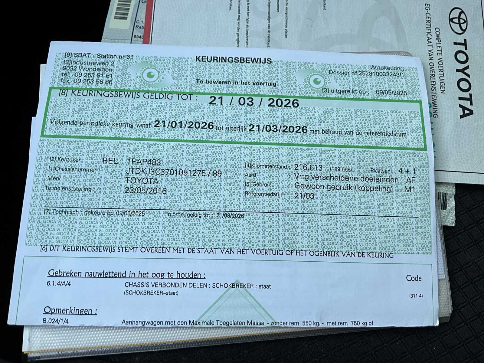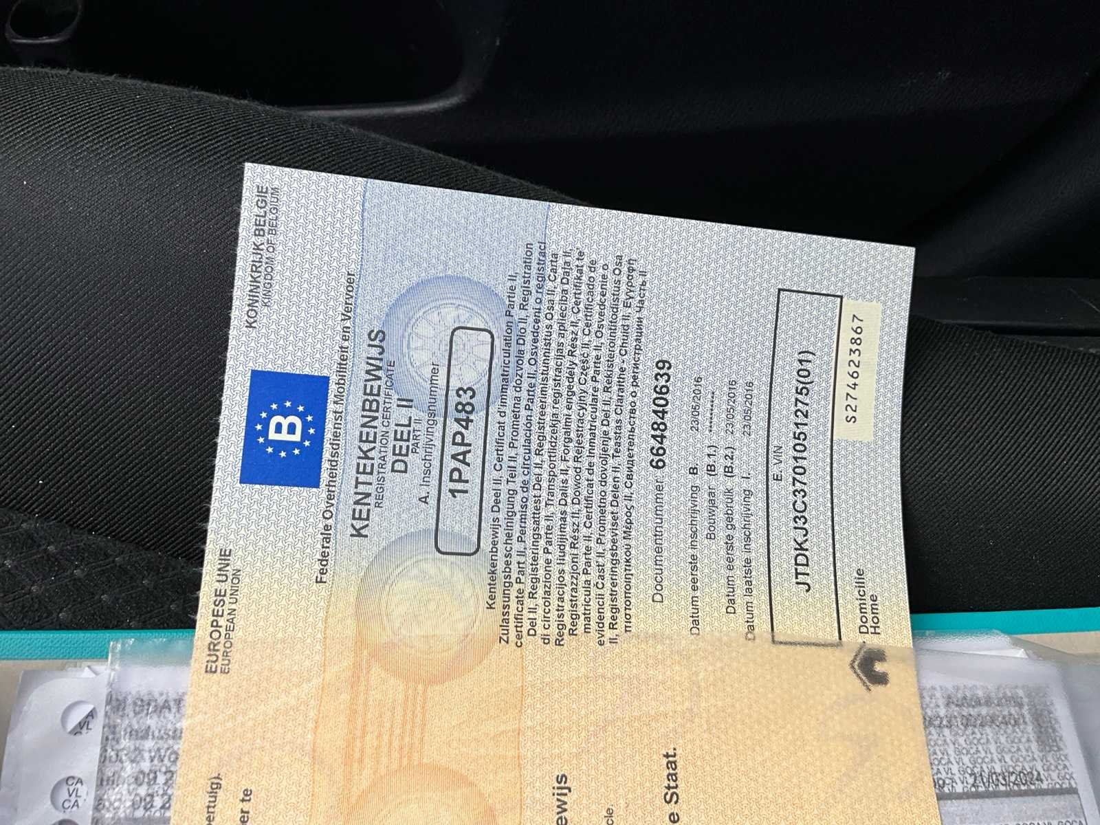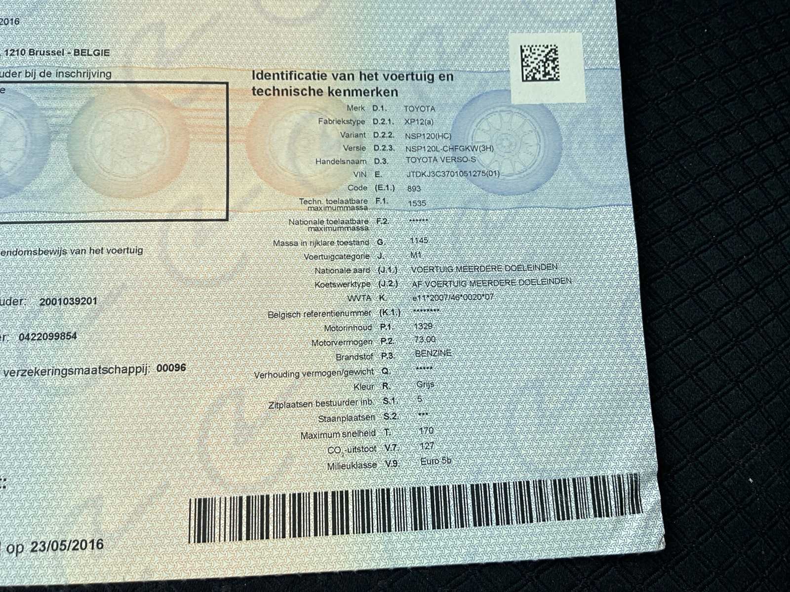 Aanwezige documenten: keuringsbewijs, kentekenbewijs I/II, certificaat van overeenstemming Merk: Toyota Model: Verso-S Bouwjaar: 2016 Afgelezen kilometerstand: 232910km Cilinderinhoud: 1329cc Vermogen (kW): 73kW Brandstof: benzine Chassisnummer: JTDKJ3C3701051275 Datum eerste toelating: 23/5/2016 Transmissie: Handgeschakeld Nationaliteit documenten: BE Gelijkvormigheidsattest aanwezig: true Start en rijdt: Ja Inschrijvingsbewijs - deel 1 : Aanwezig Inschrijvingsbewijs - deel 2: Aanwezig