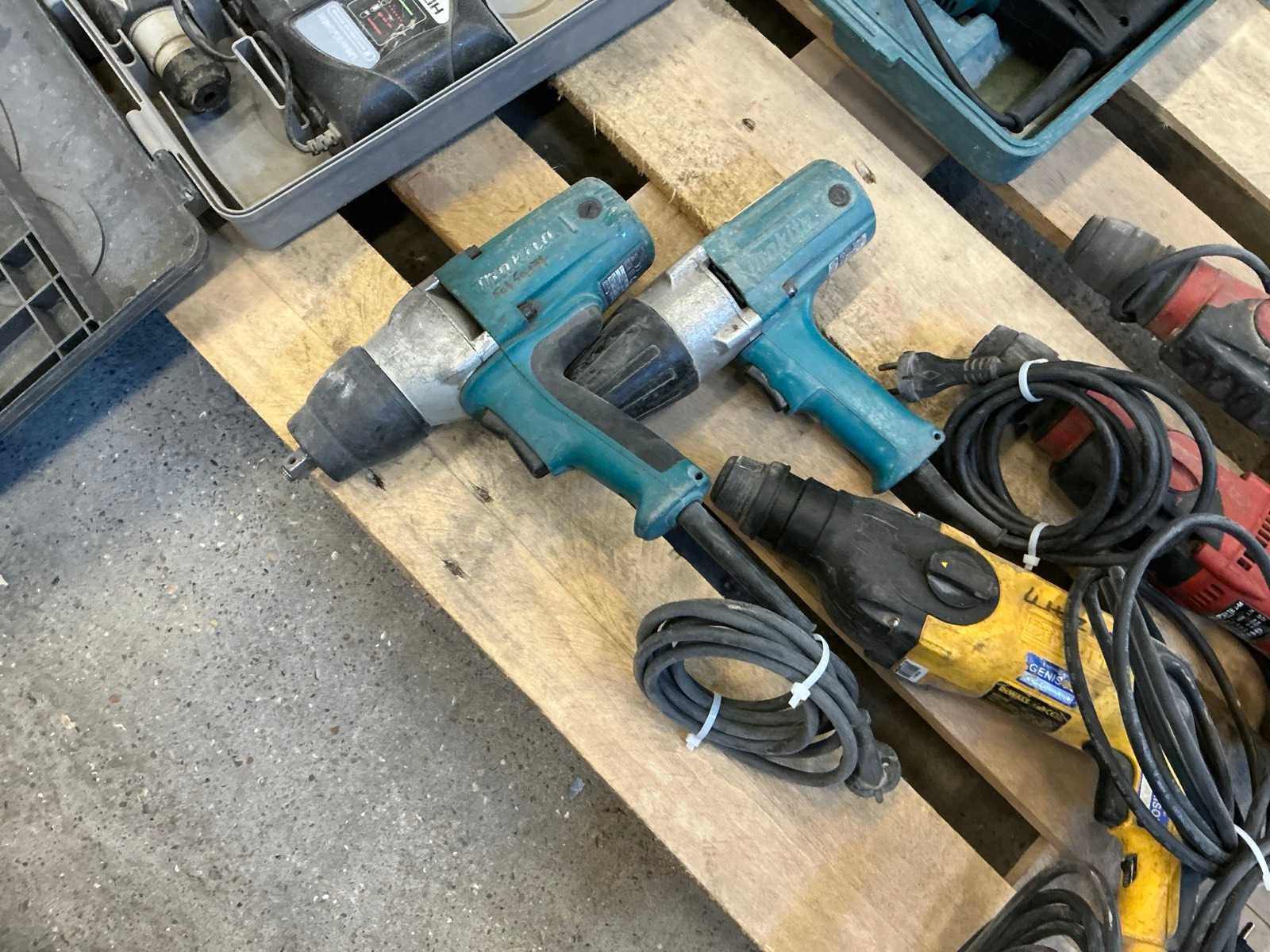 Waaronder boorhamers waaronder DeWalt DW25102, Hilti TE 2-M, Hitachi DH 14DSL, slagmoersleutels waaronder Makita TW0350 en hoekboormachine Bosch GWB 10RE. Liggende op 1x pallet.