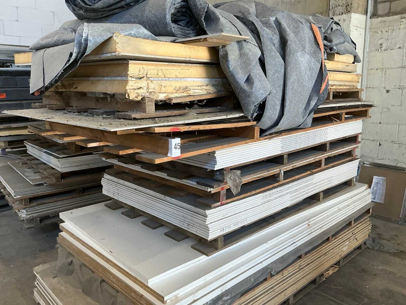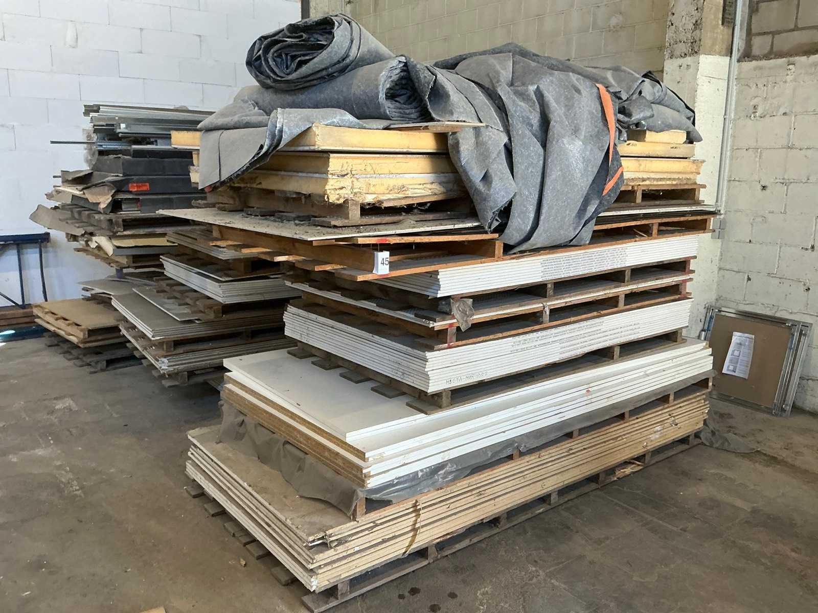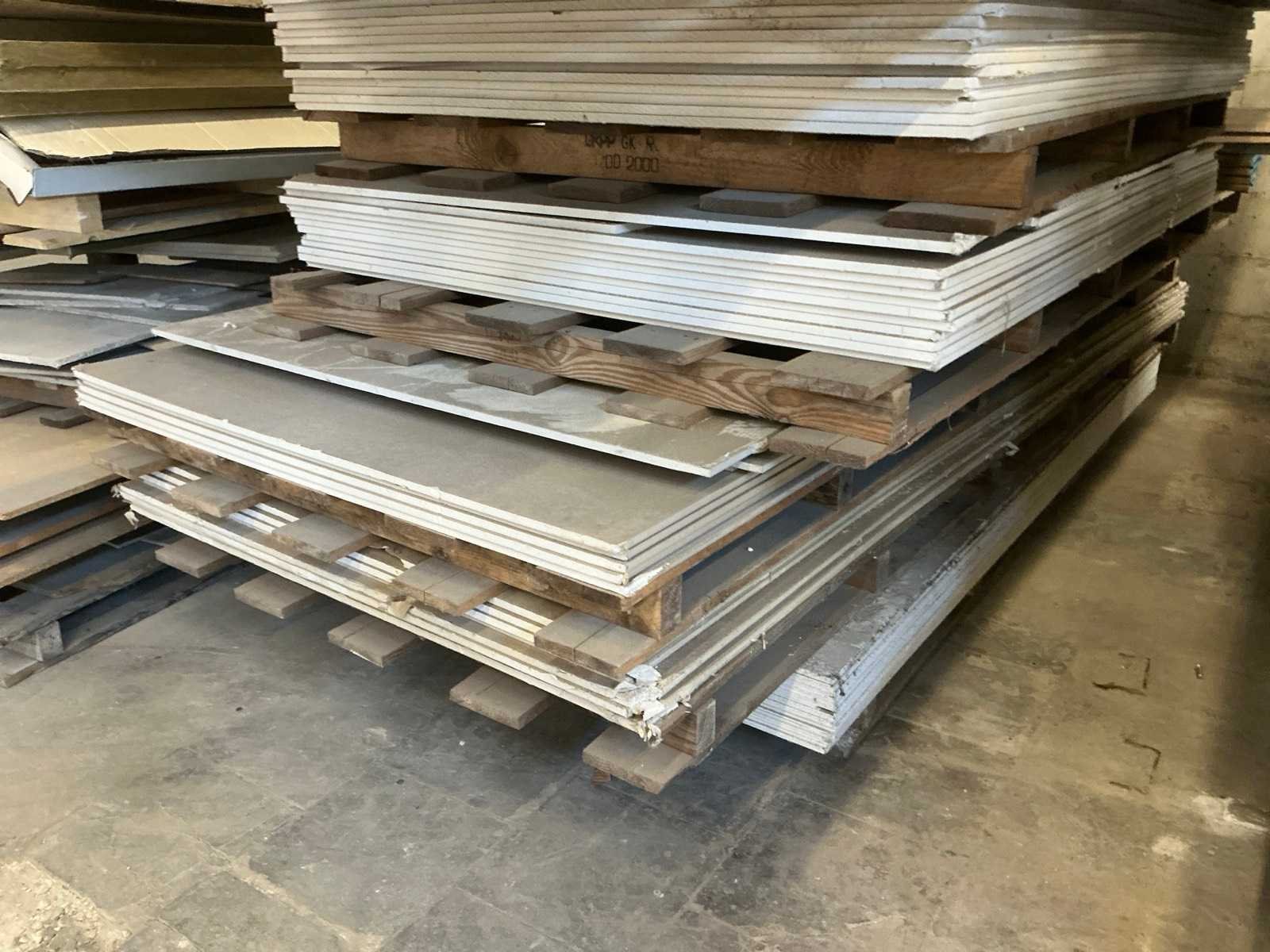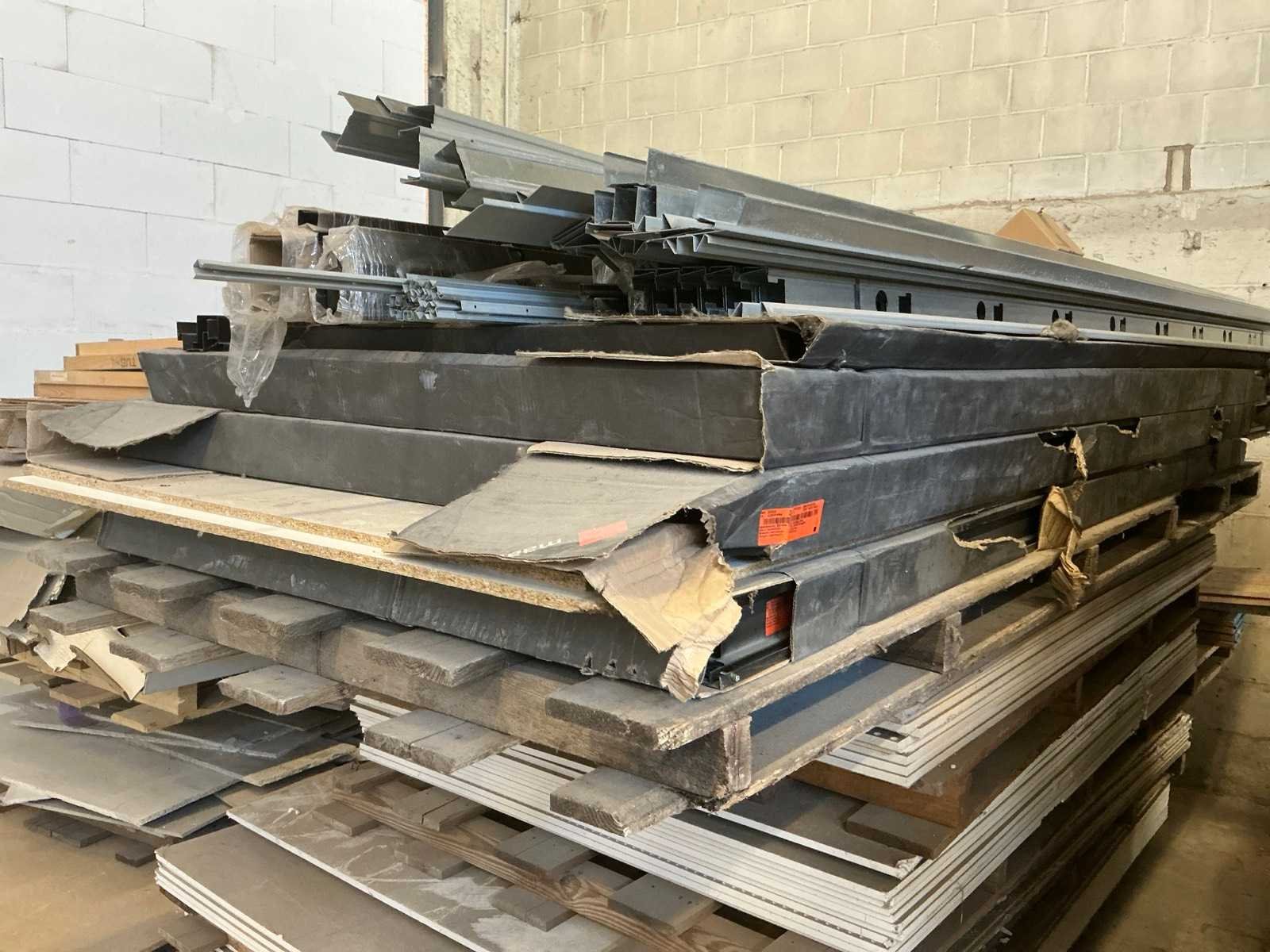 Waaronder gyprocplaten met afmetingen ca. 200 x 120cm, houten platen met afmetingen ca. 250 x 125cm, thermogyp platen met afmetingen ca. 250 x 120cm, stalen glaselementen met afmetingen ca. 260 x 120cm en tubespanen met afmetingen ca. 211,5 x 73cm