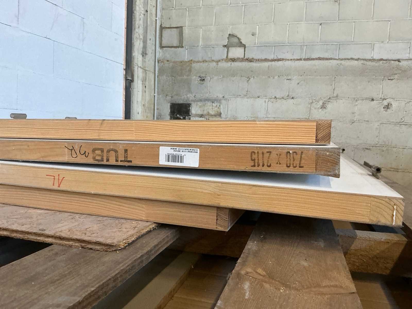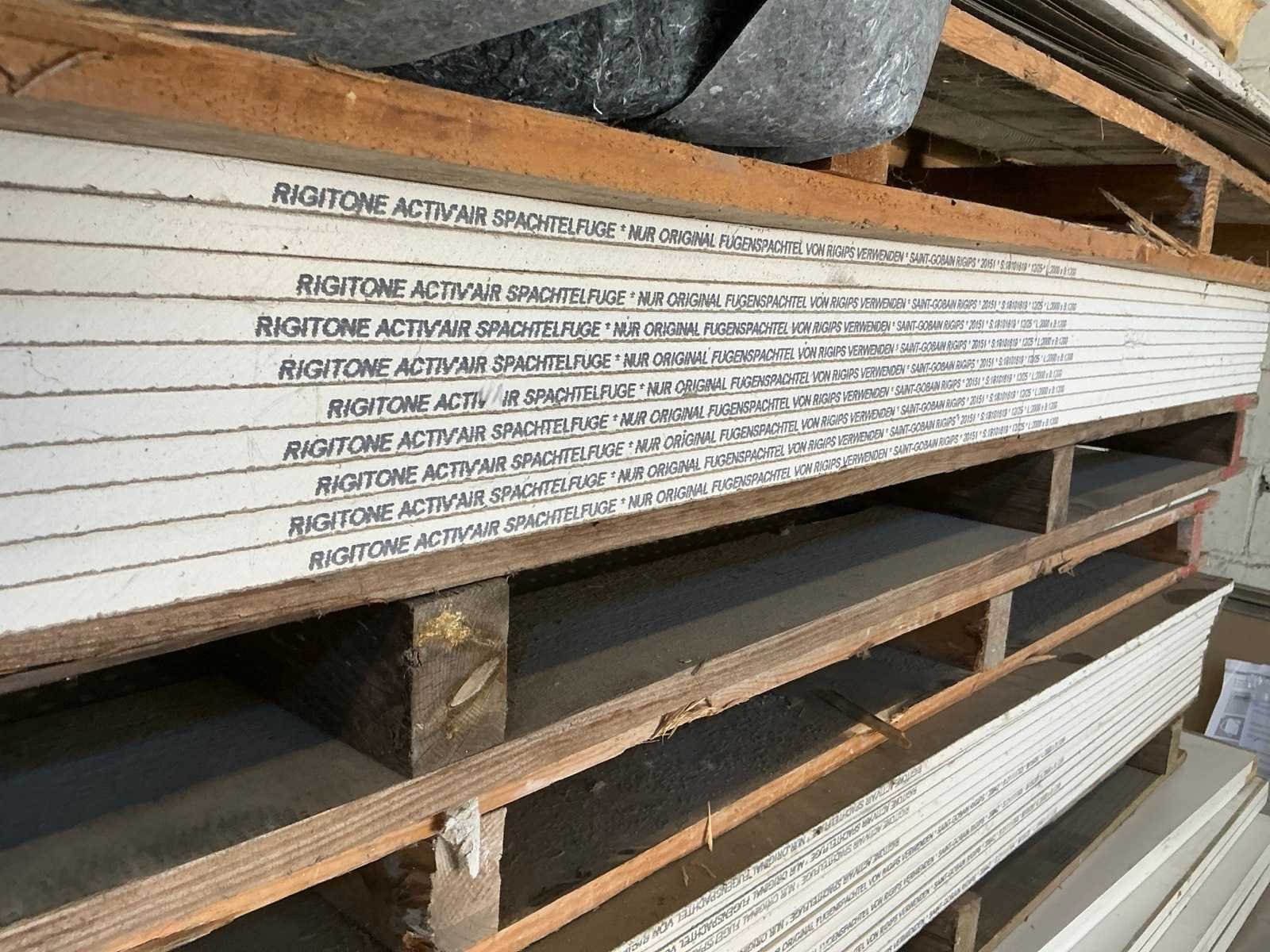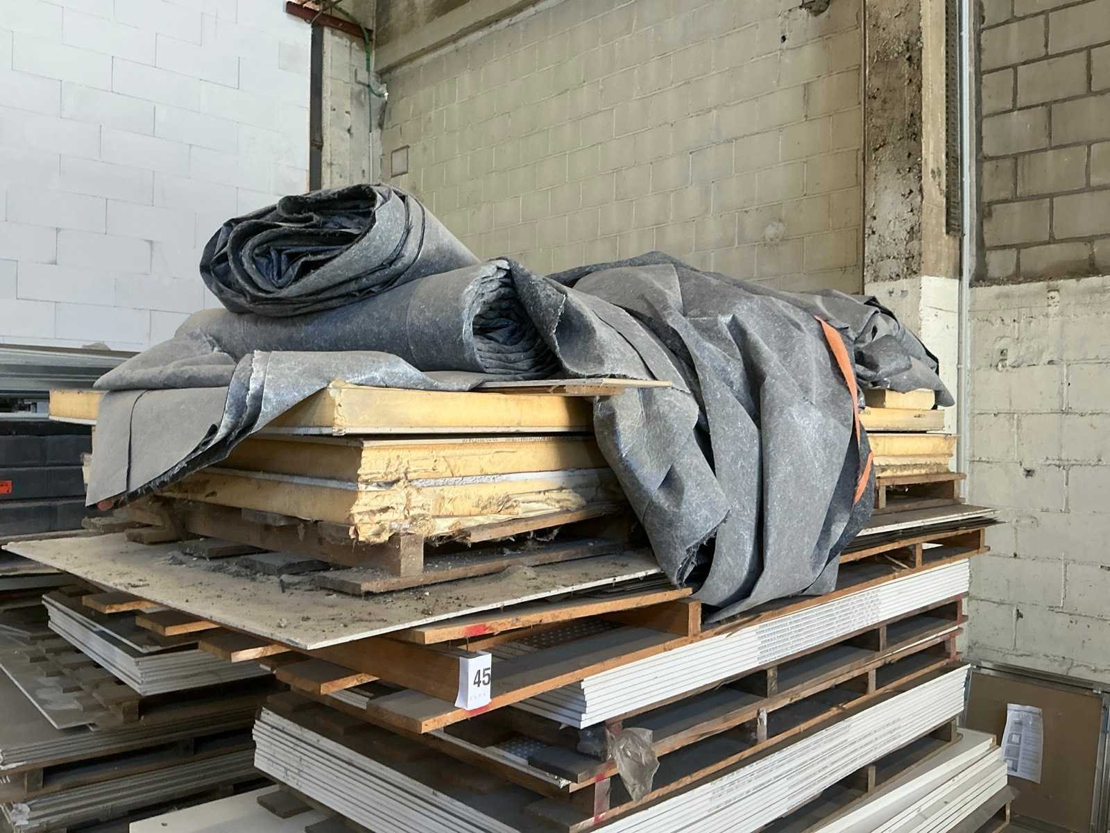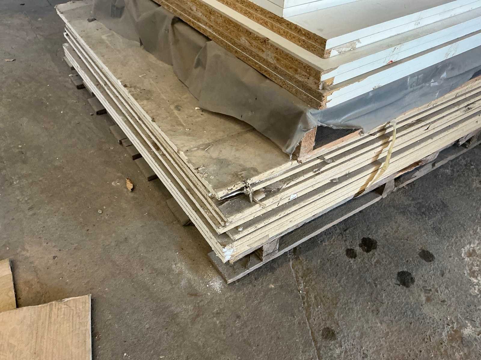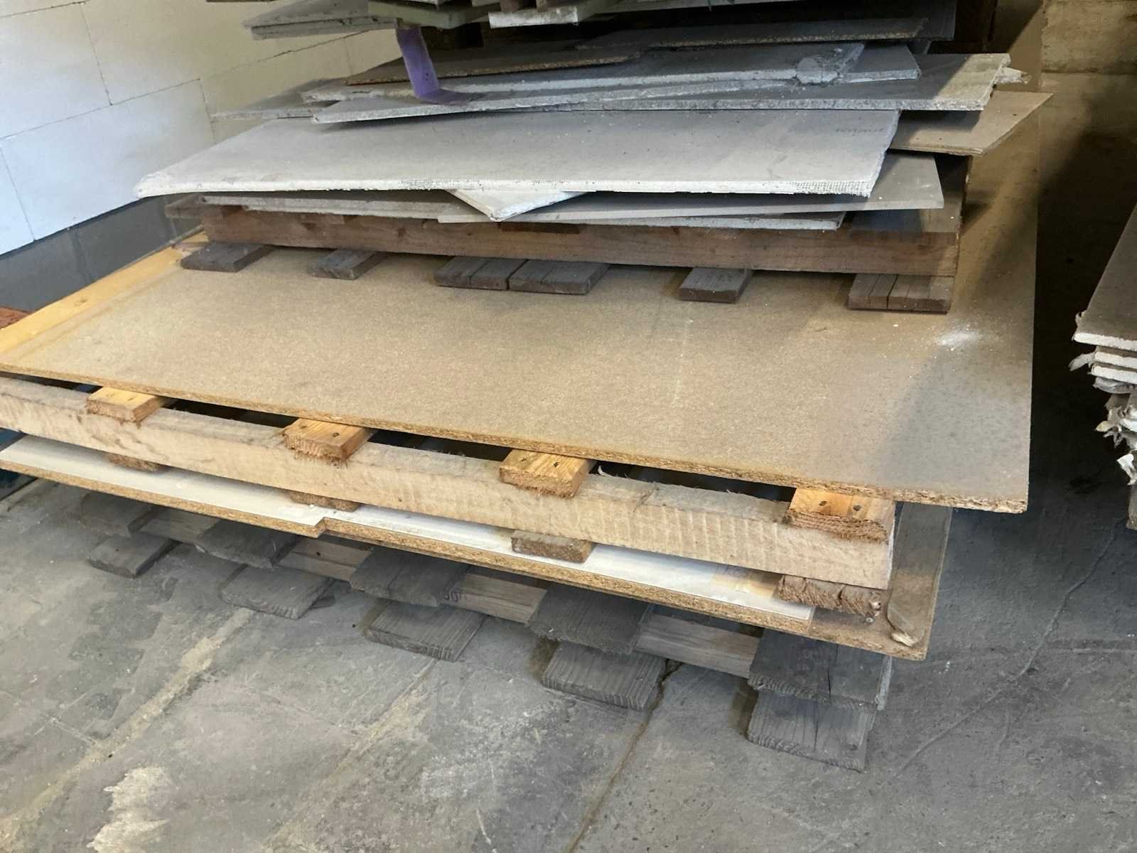 Waaronder gyprocplaten met afmetingen ca. 200 x 120cm, houten platen met afmetingen ca. 250 x 125cm, thermogyp platen met afmetingen ca. 250 x 120cm, stalen glaselementen met afmetingen ca. 260 x 120cm en tubespanen met afmetingen ca. 211,5 x 73cm