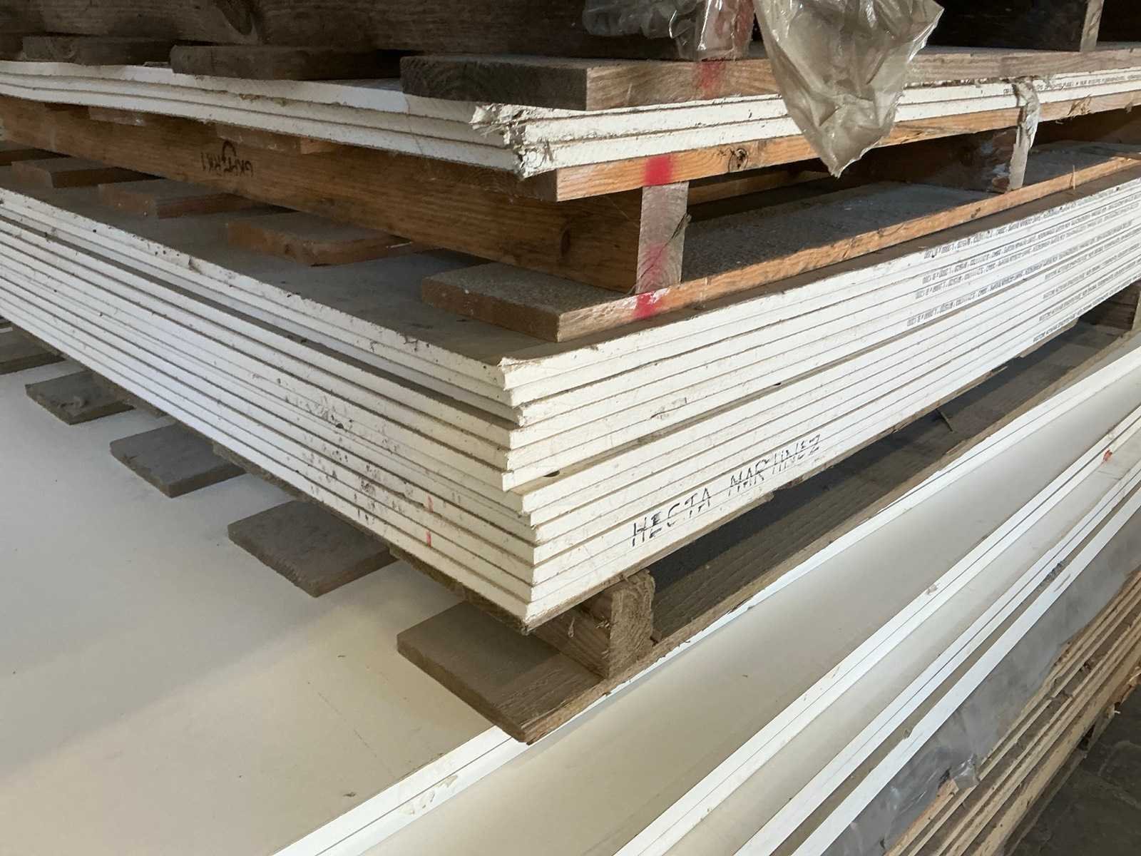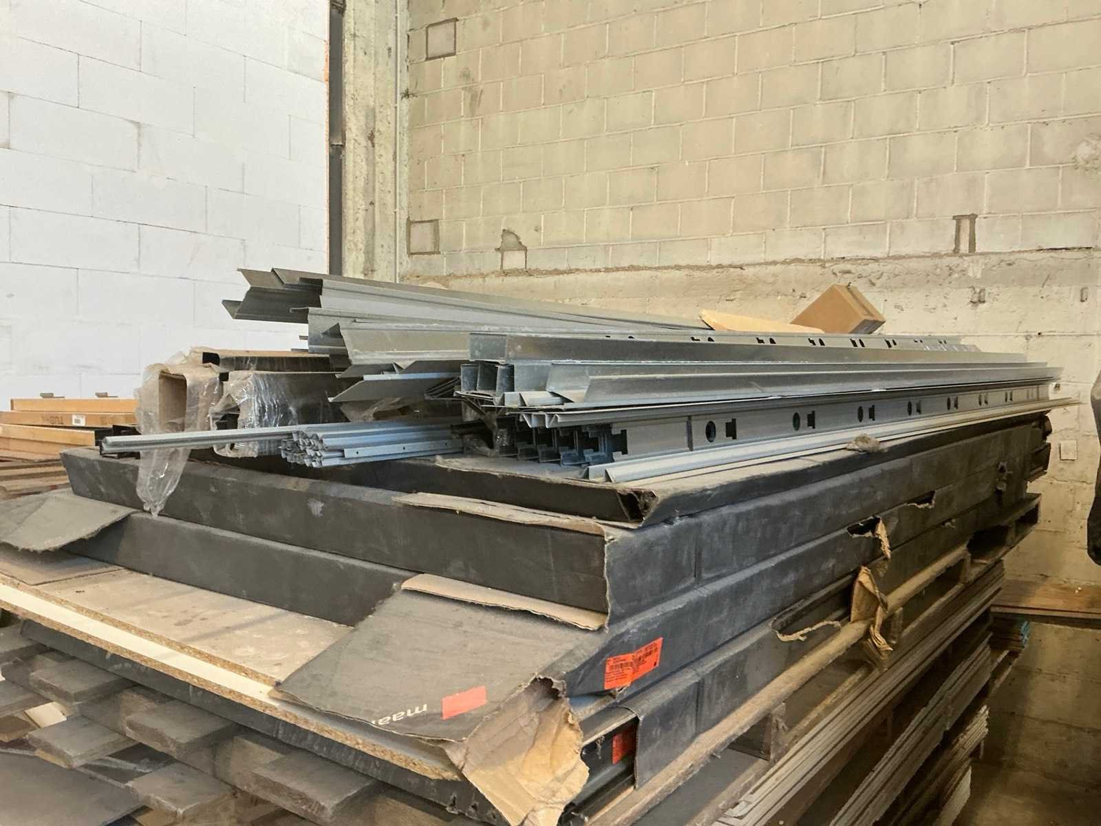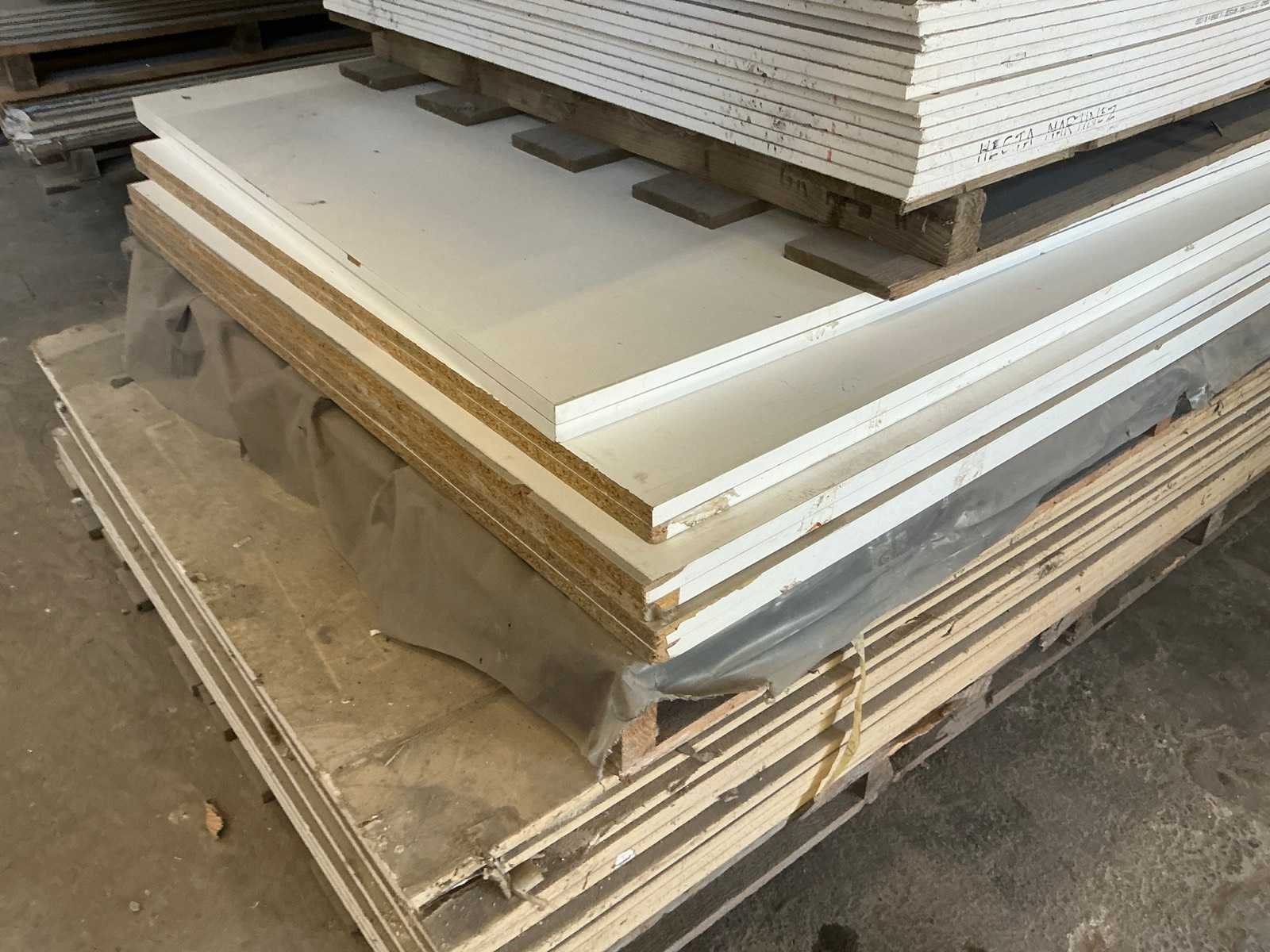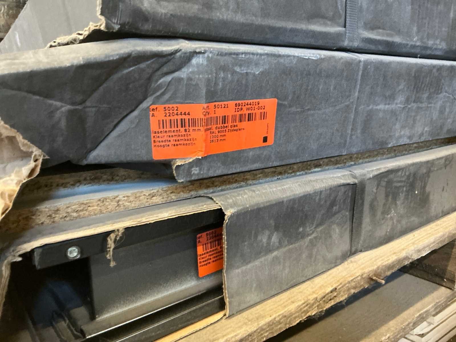 Waaronder gyprocplaten met afmetingen ca. 200 x 120cm, houten platen met afmetingen ca. 250 x 125cm, thermogyp platen met afmetingen ca. 250 x 120cm, stalen glaselementen met afmetingen ca. 260 x 120cm en tubespanen met afmetingen ca. 211,5 x 73cm