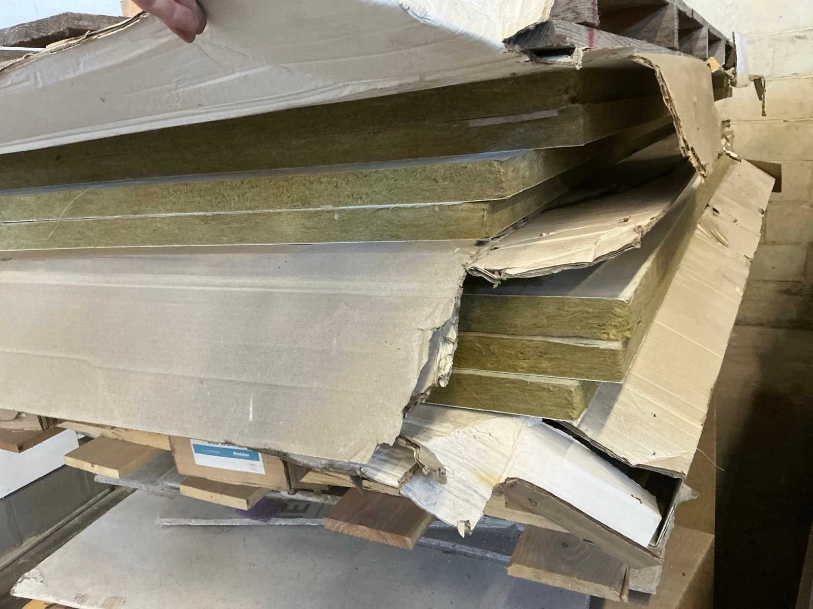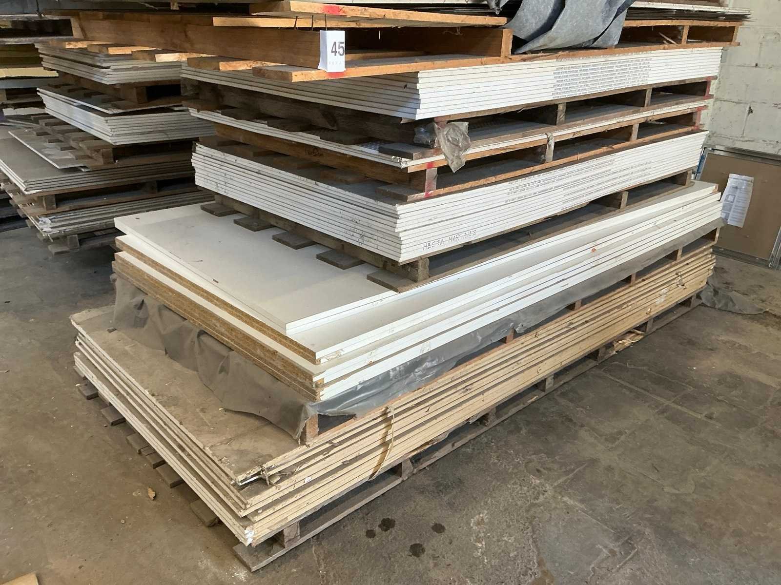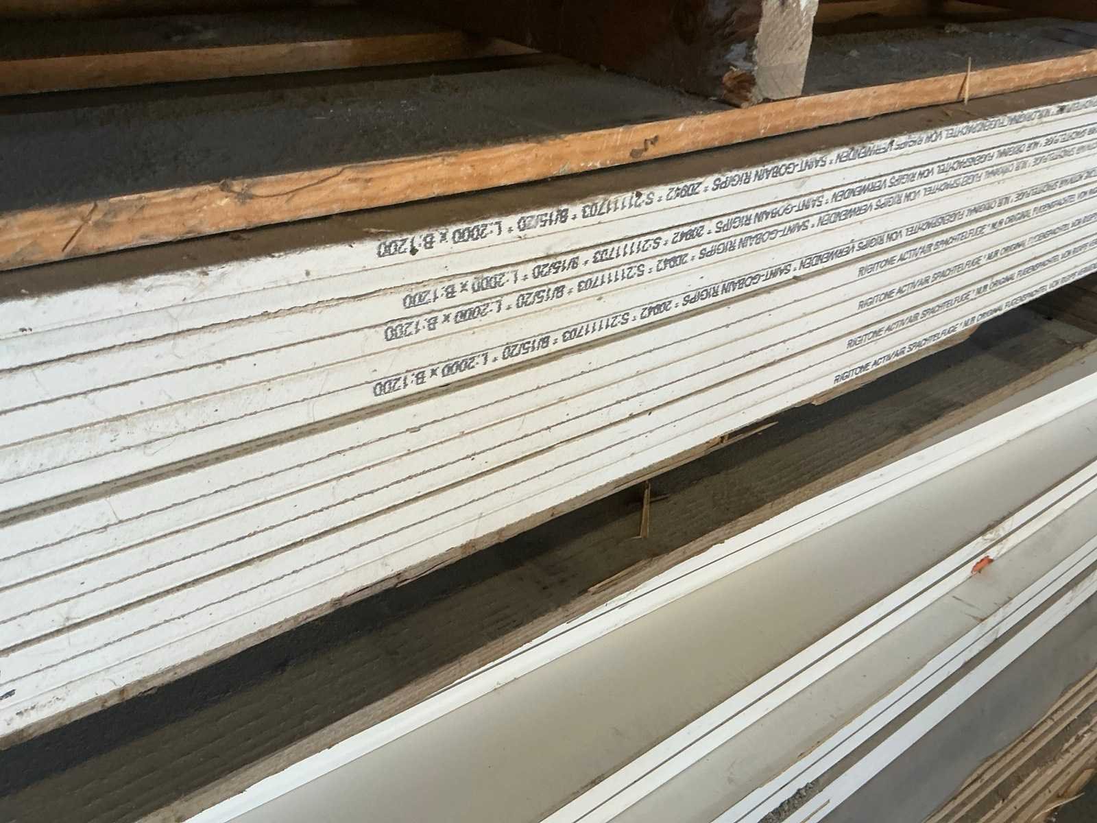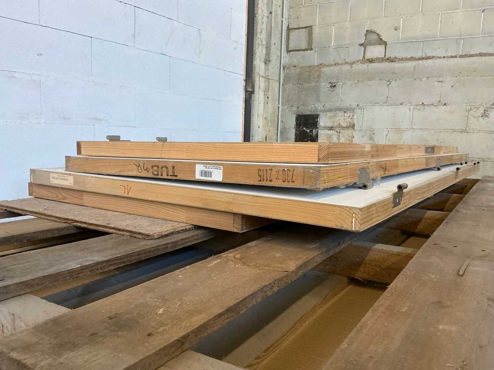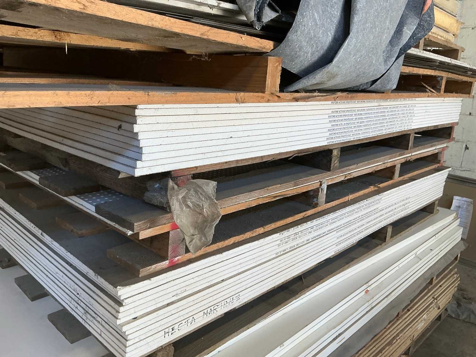 Waaronder gyprocplaten met afmetingen ca. 200 x 120cm, houten platen met afmetingen ca. 250 x 125cm, thermogyp platen met afmetingen ca. 250 x 120cm, stalen glaselementen met afmetingen ca. 260 x 120cm en tubespanen met afmetingen ca. 211,5 x 73cm