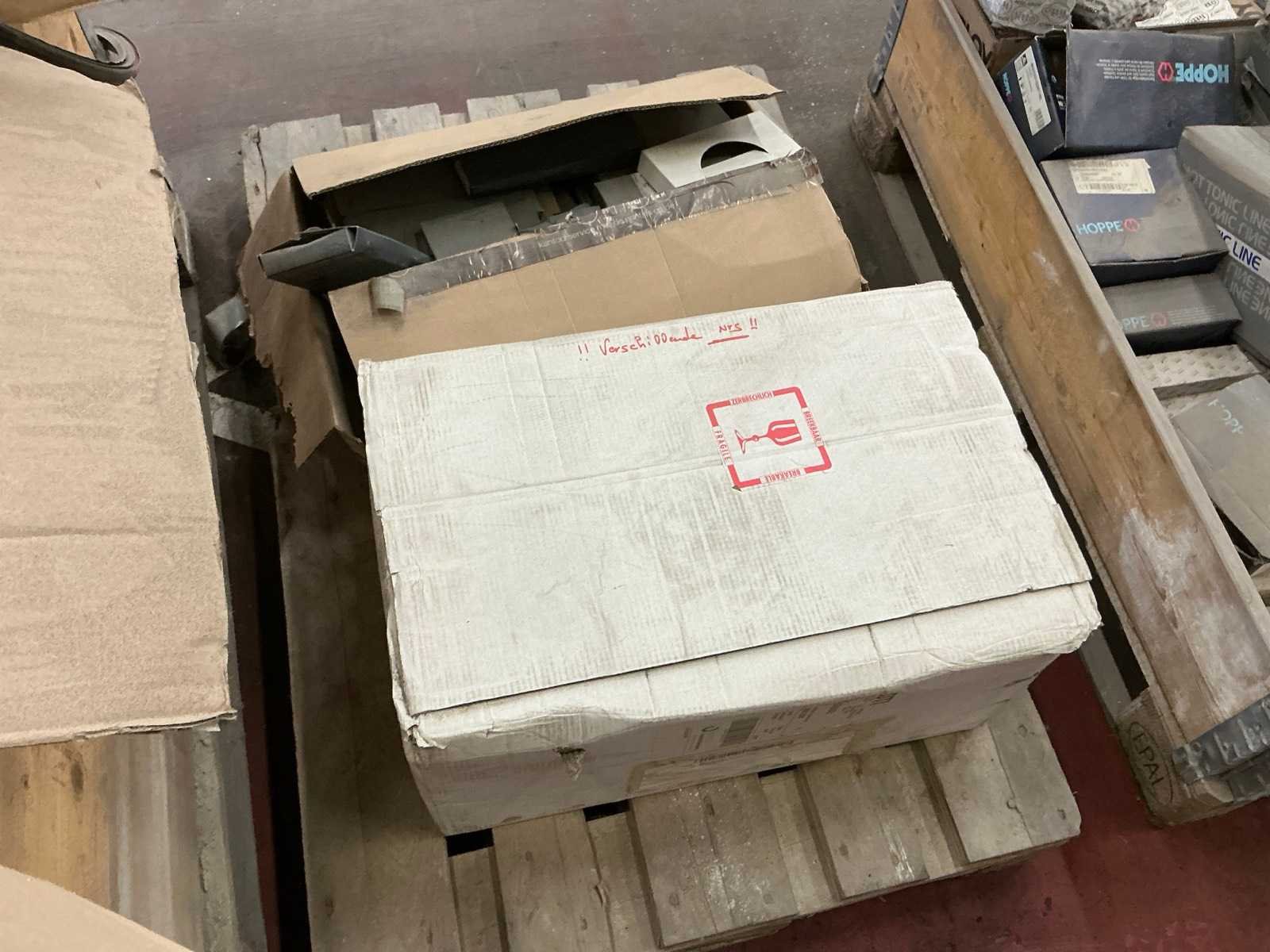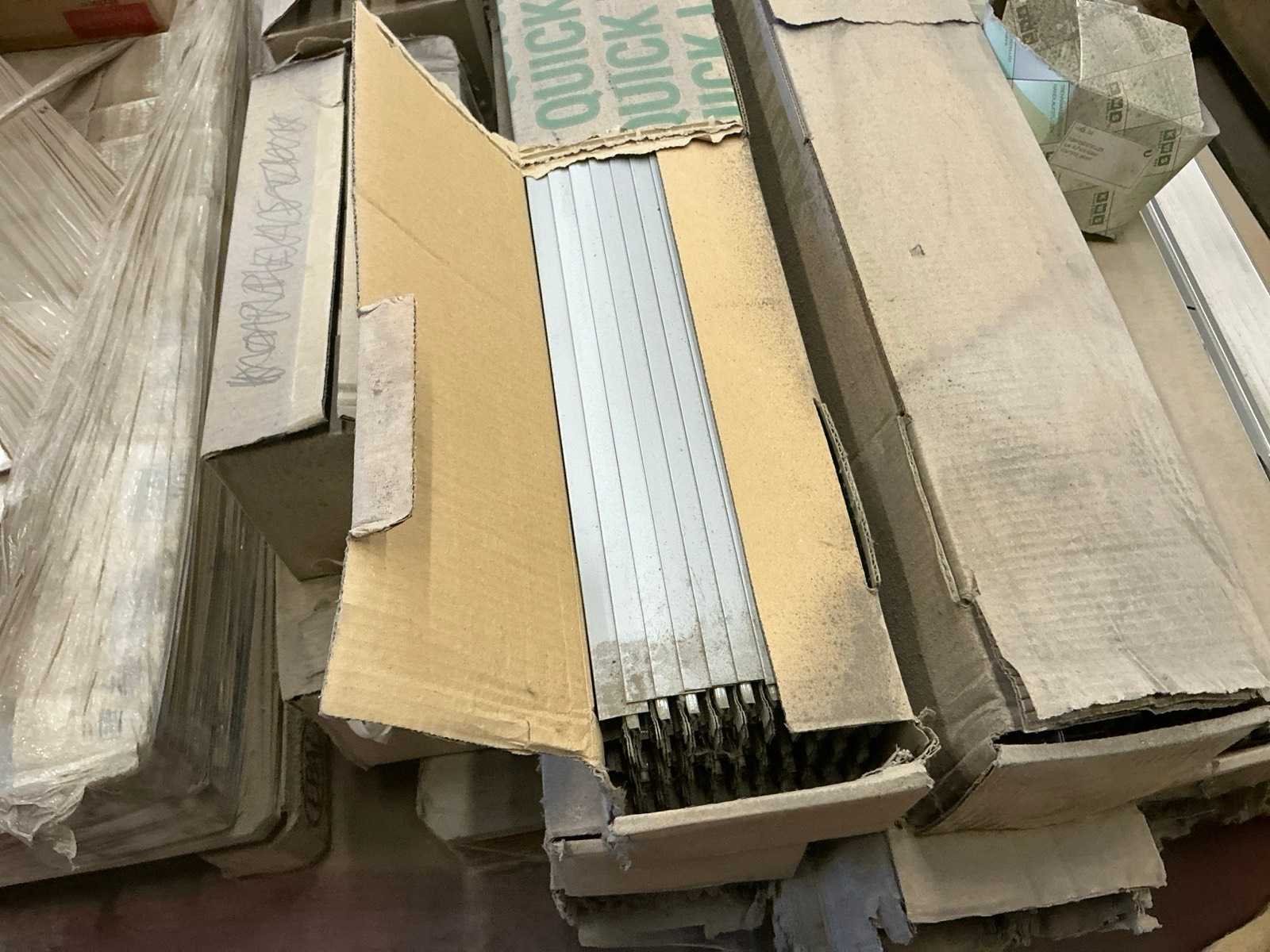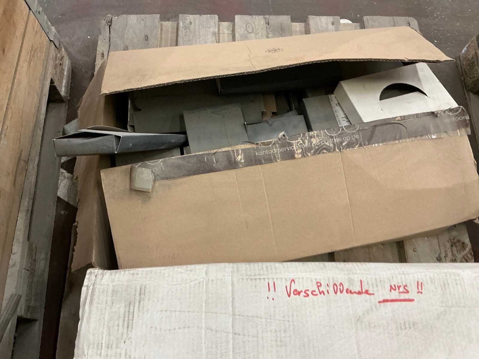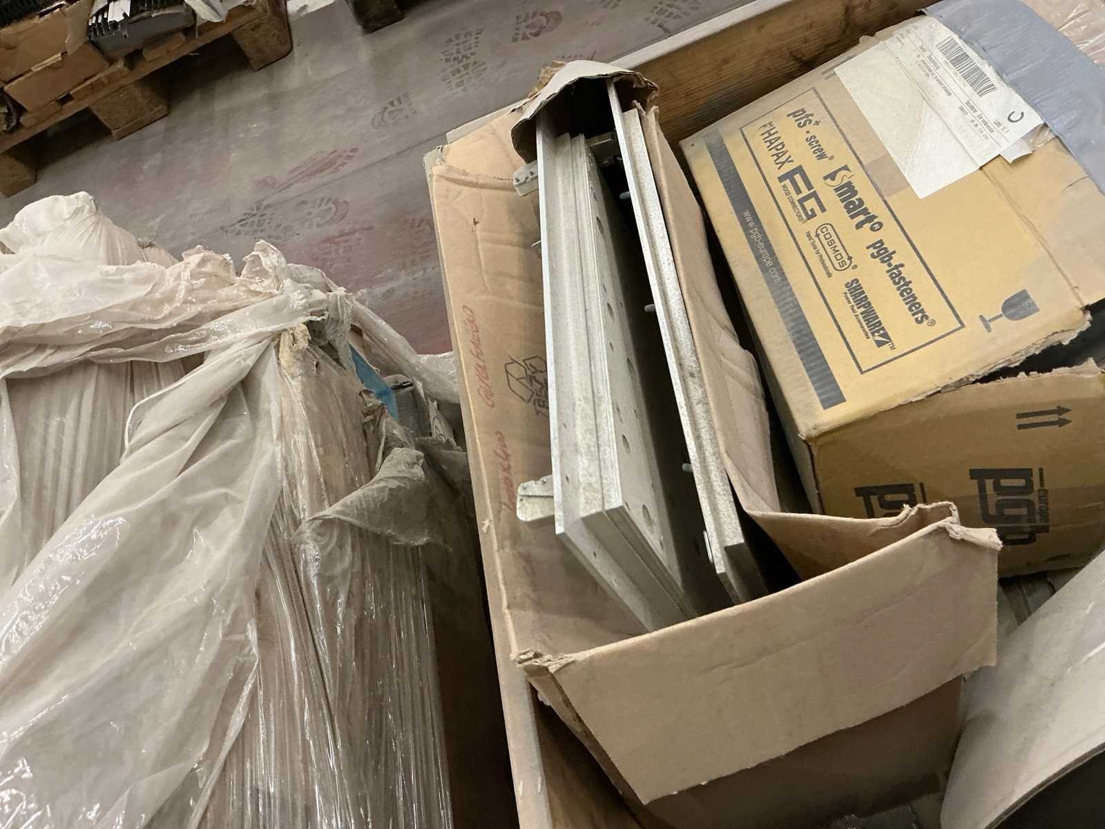 Waaronder diverse gyproc-toebehoren, diverse deurklinken, diverse deur-toebehoren, diverse rubbers, partij tegels 20 x 20cm, diverse alu profielen,… Waaronder merken zoals Rako, Quick Lock, Batimet, Hoppe, Tonic Line, Artimec,… Liggende op 12x pallet.
