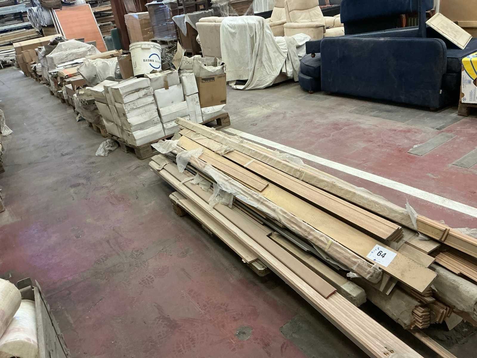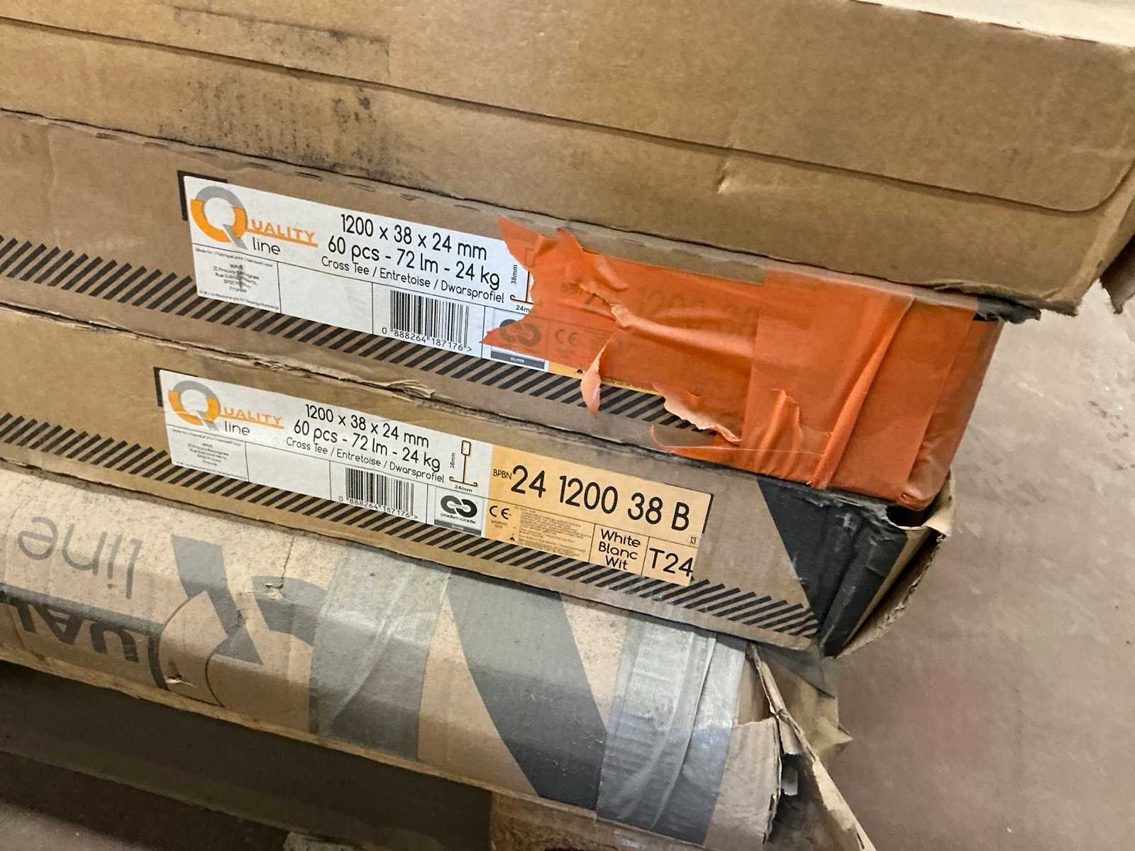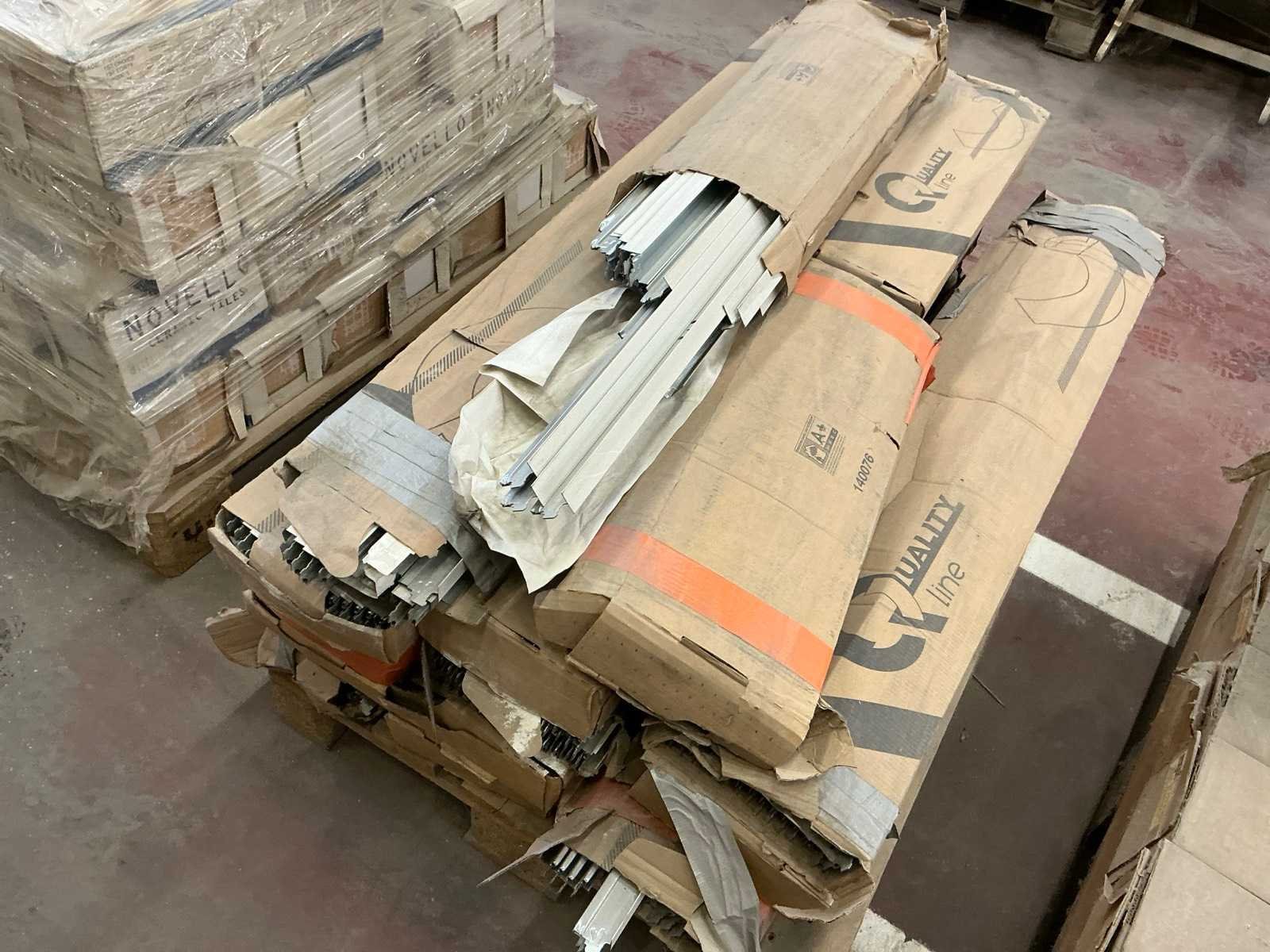 Waaronder voornamelijk diverse alu profielen en diverse houten latten met grootste lengte ca. 250/300cm. Waaronder merken zoals Quick Lock, Poujoulat, Novello, Primus, Sealfast,… Liggende op 10x pallet.