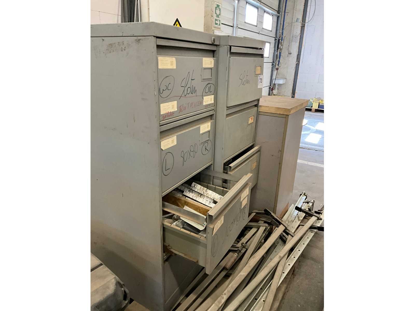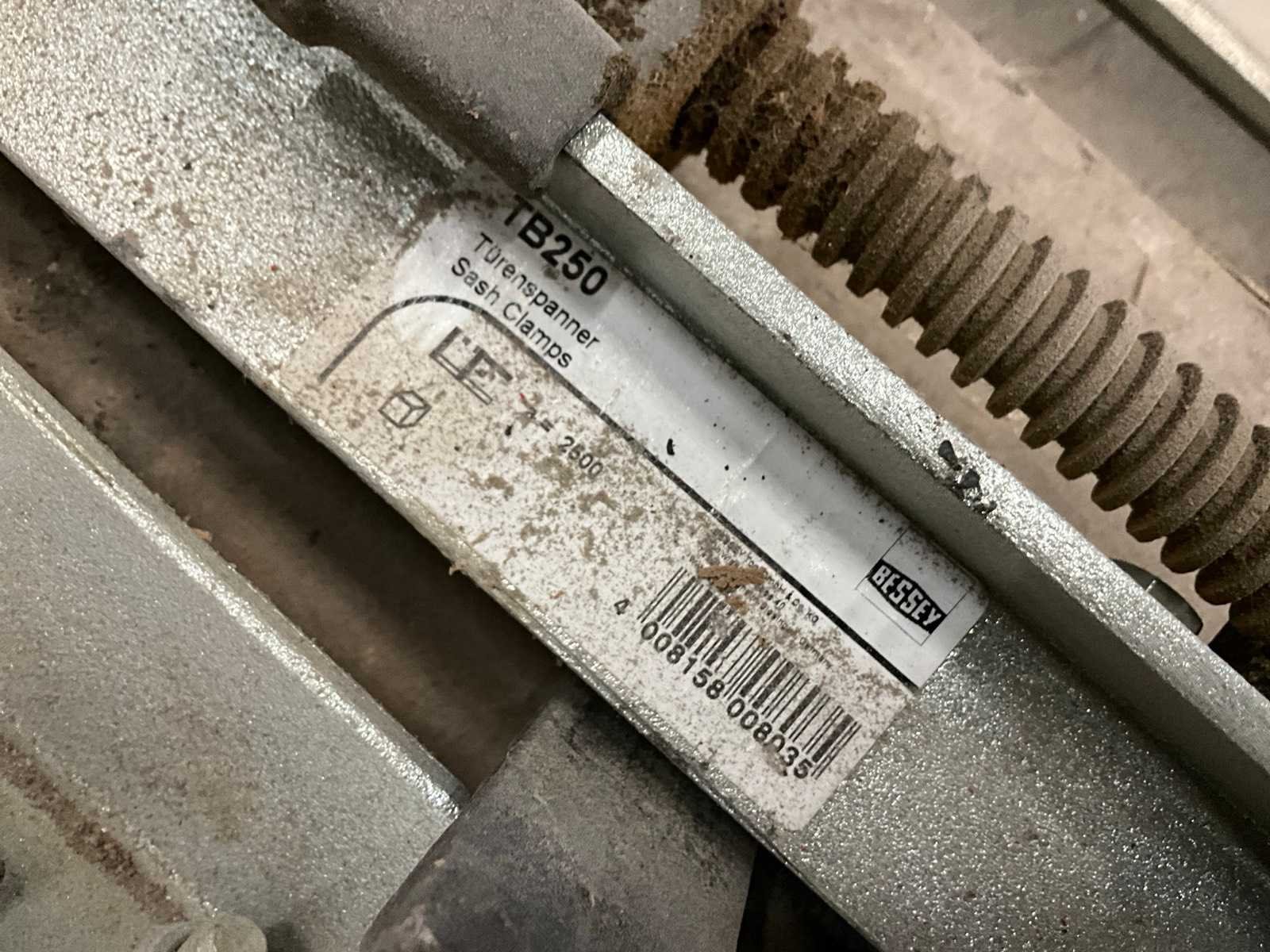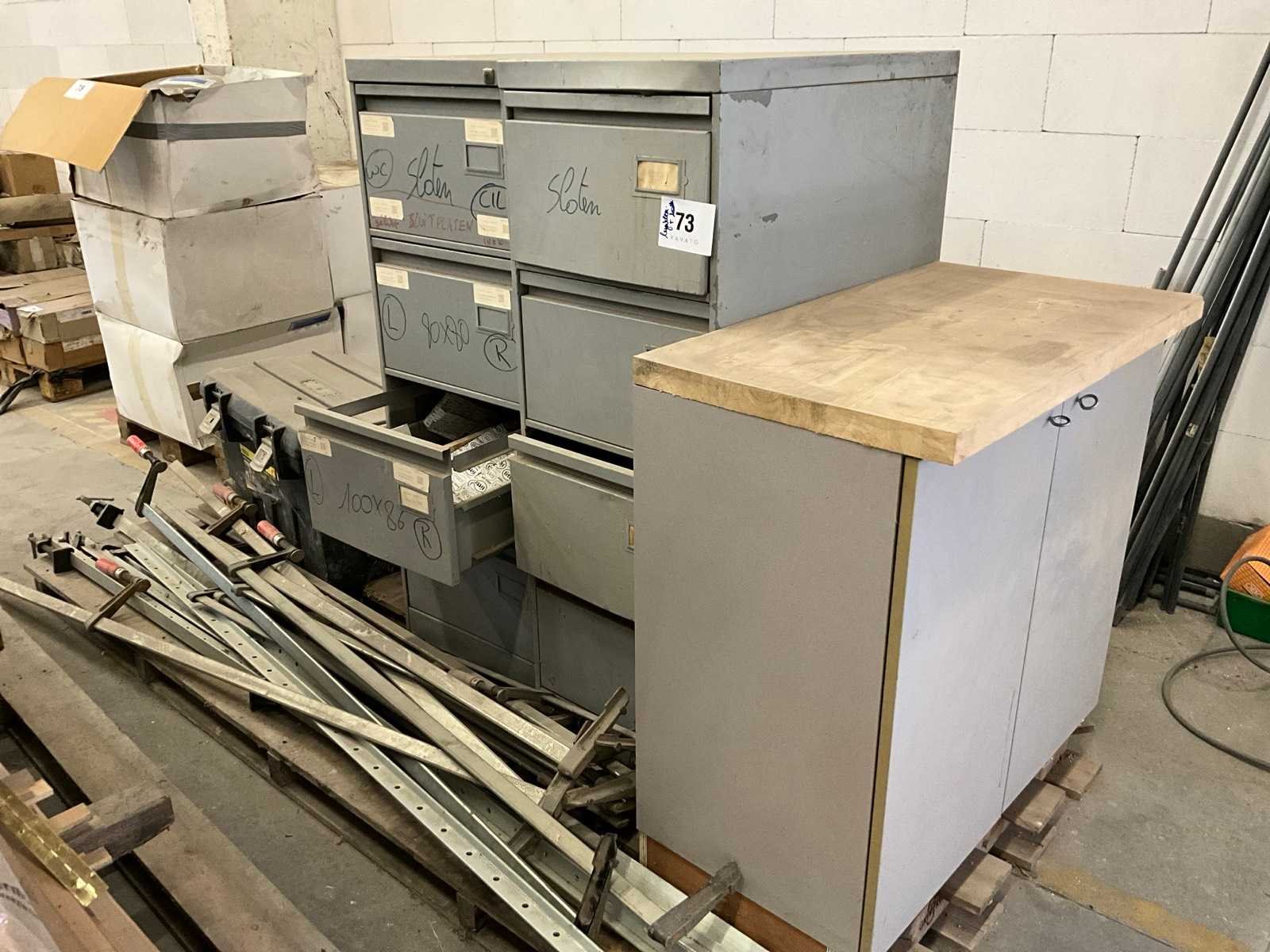 11 diverse lijmklemmen, waaronder Bessey. Compleet met gereedschapskoffer en 3 diverse werkkasten met inhoud