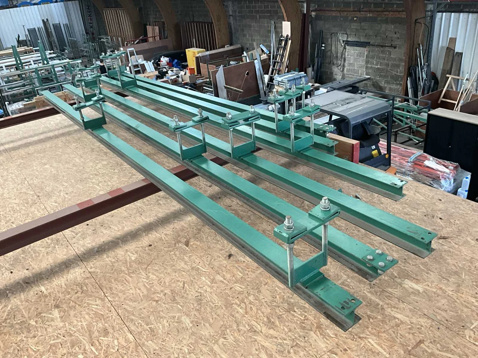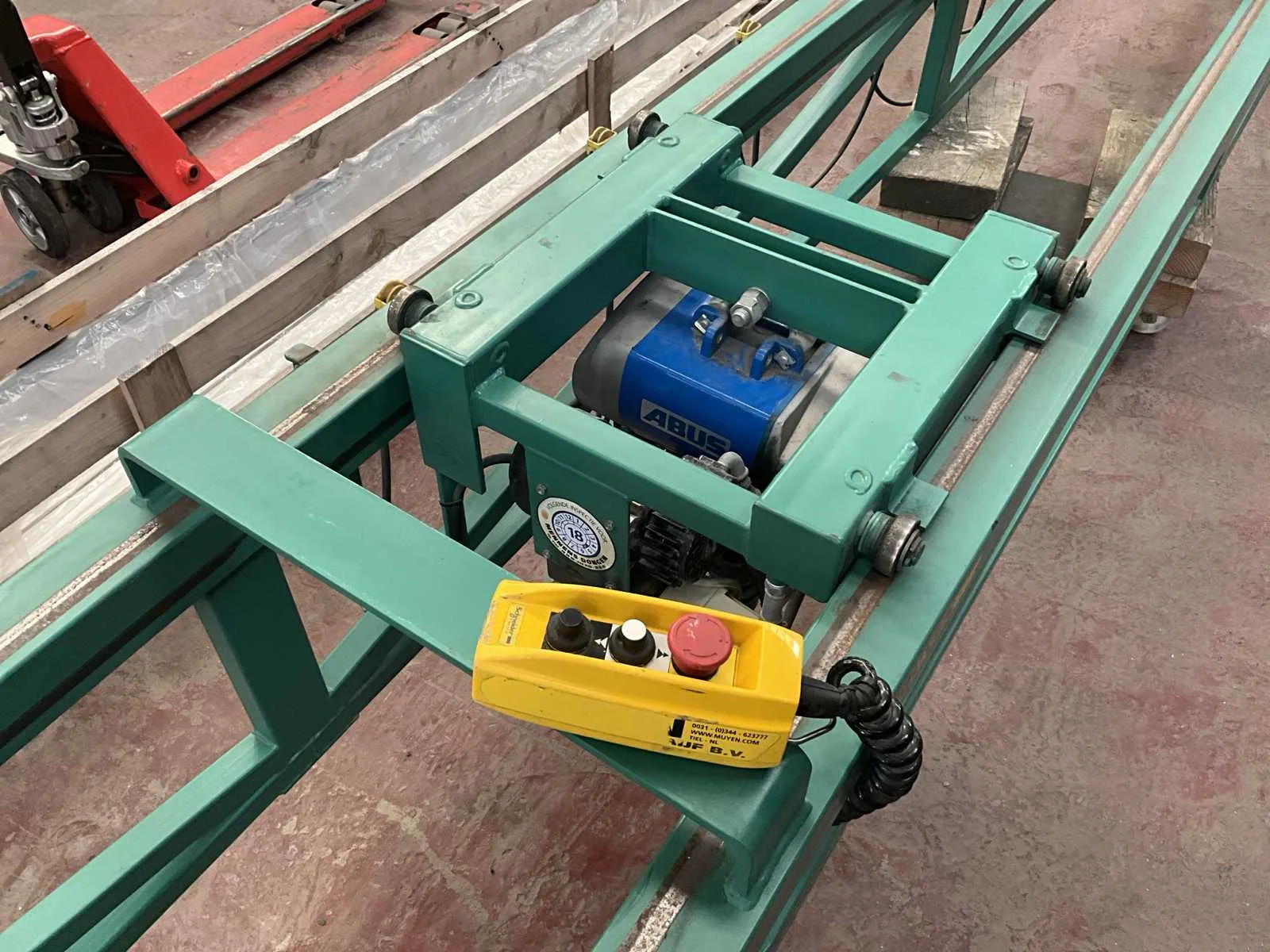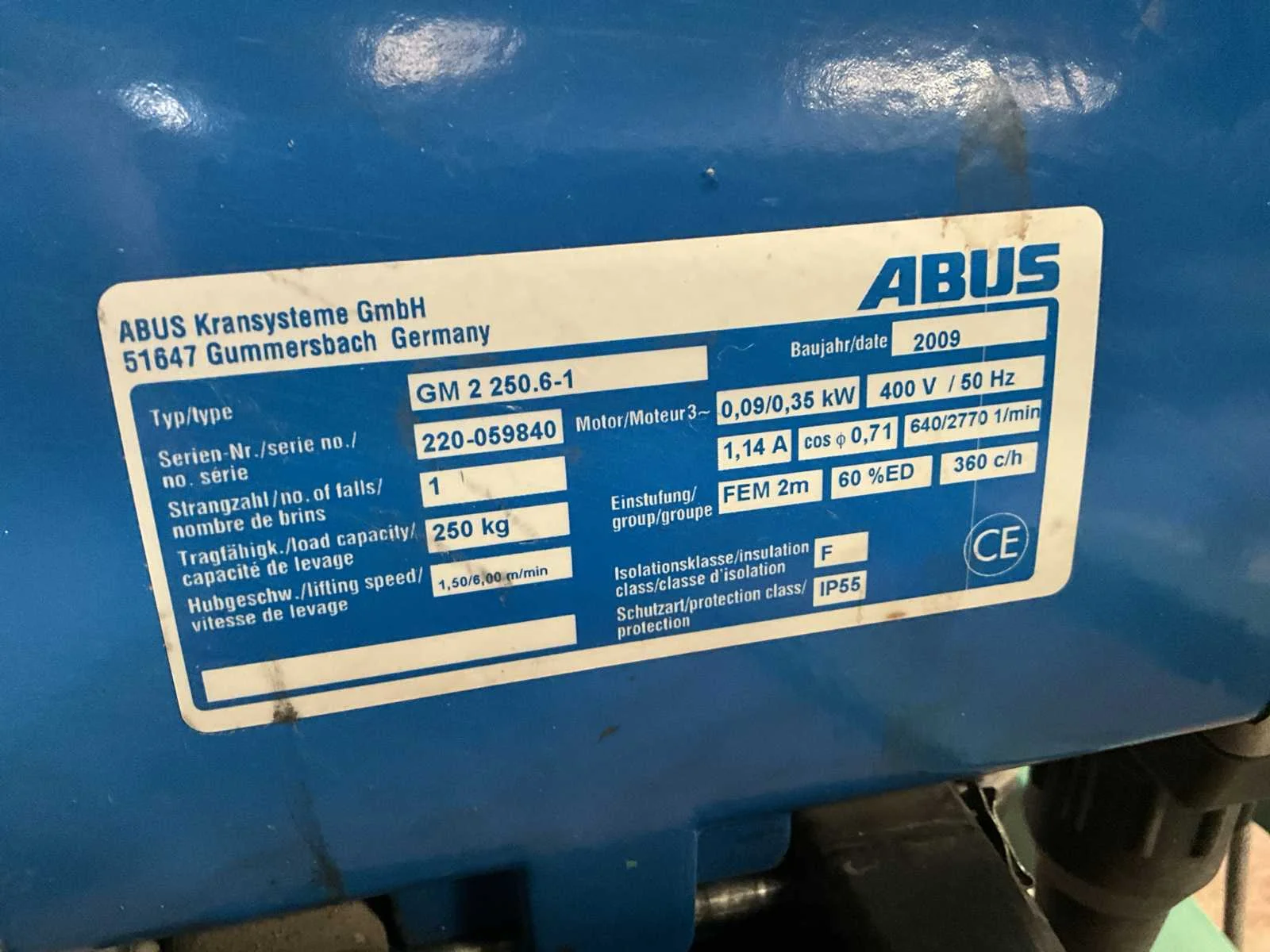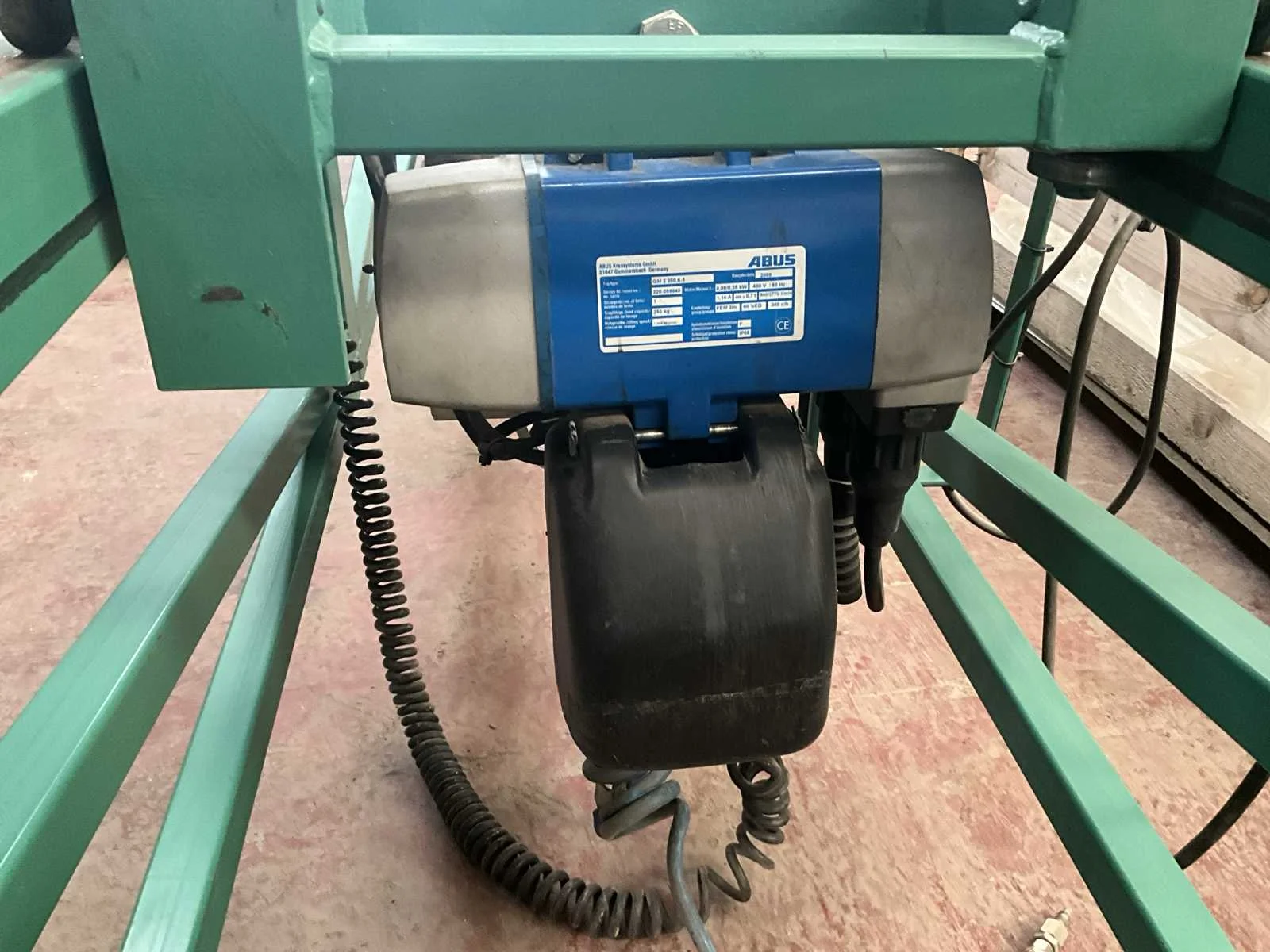 Bestaand uit 6x profielen met totaal lengte circa 30 lopende meter hang profiel met geleiders, Abus hijslier met peerbediening, 400v aansluiting Merk: Muyen Type: VA200 Bouwjaar: 2009 Serienummer: 4055-02 Overspanning: 11m Hijsvermogen: 250kg Dubbelligger: true Totale afmeting Lengte: 11200mm Totale afmeting Breedte: 1400mm Totale afmeting Hoogte: 600mm