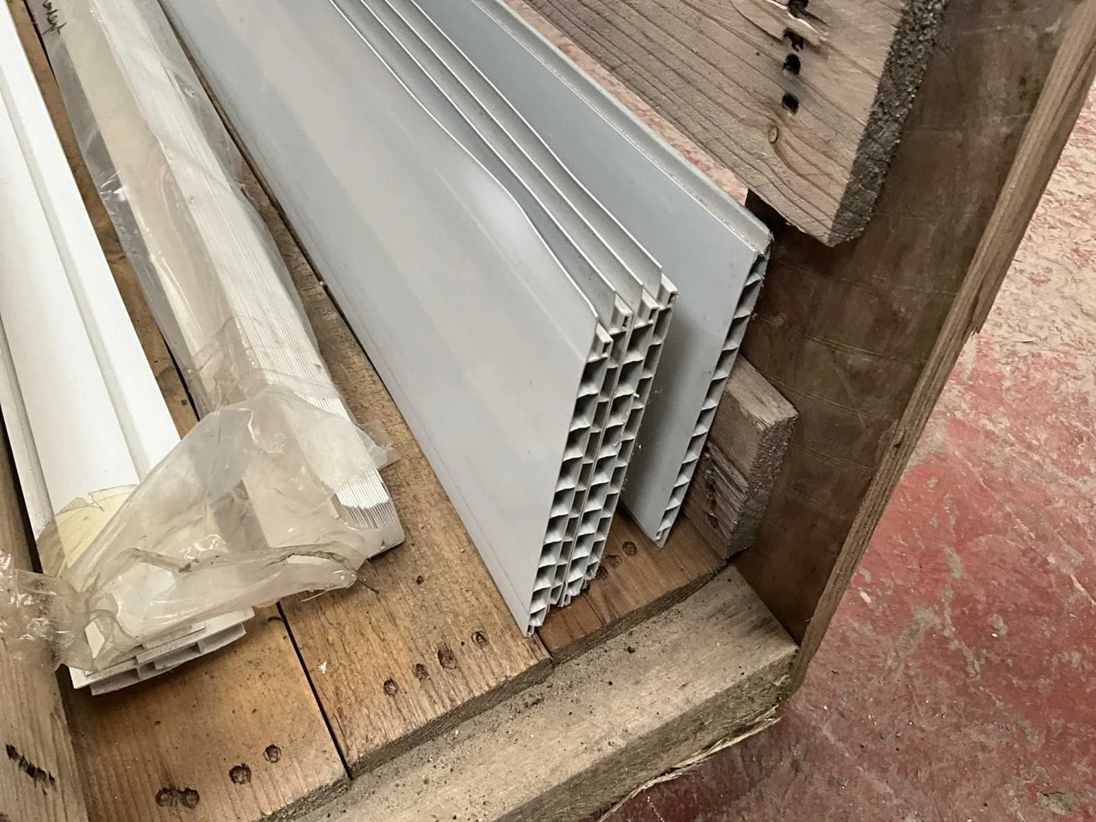 Bestaand uit circa 5 planchet lengte 5 meter, circa 10 hoek en verbindingsprofielen, enz, inclusief houten kist Afmeting l: 5000mm Afmeting b: 200mm Afmeting h: 400mm