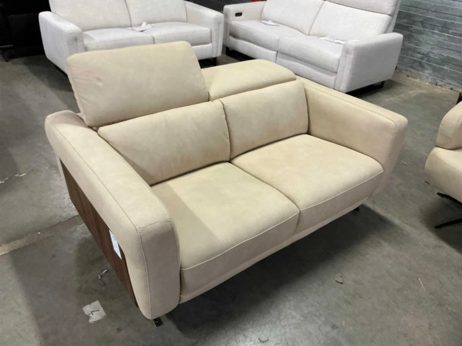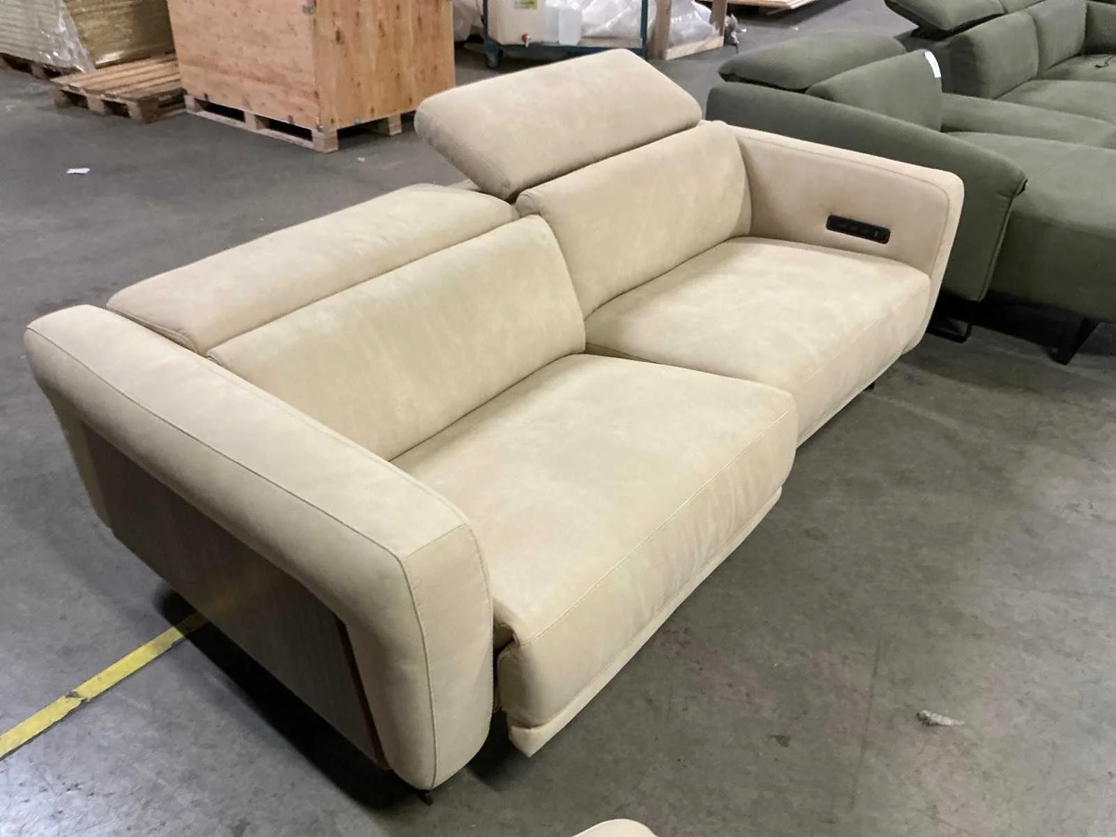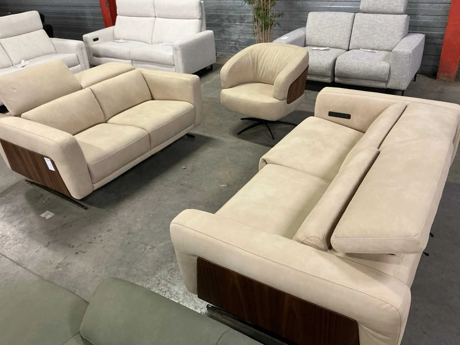 Een combinatie bestaande uit , een bankstel 160x110cm met manueel verstelbare hoofdsteunen en een bankstel 200x110cm met elektrische relaxfuncties & hoofdsteunen , incl. draaifauteuil. Alle elementen afgewerkt met walnoot finish. Merk: Recor
