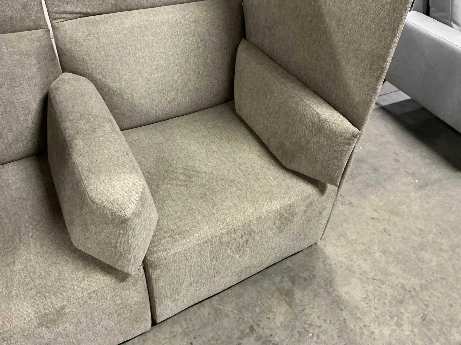 Toonzaalmodel Het element, opgebouwd uit twee delen, biedt z'n nieuwe eigenaars een gewaagd maar toch tijdloos design. Een fine afgebakende cocon met drie losse decoratieve kussentjes. Merk: Recor Home Lengte: 79cm Breedte: 155cm Hoogte: 138cm Materiaal: gestoffeerd
