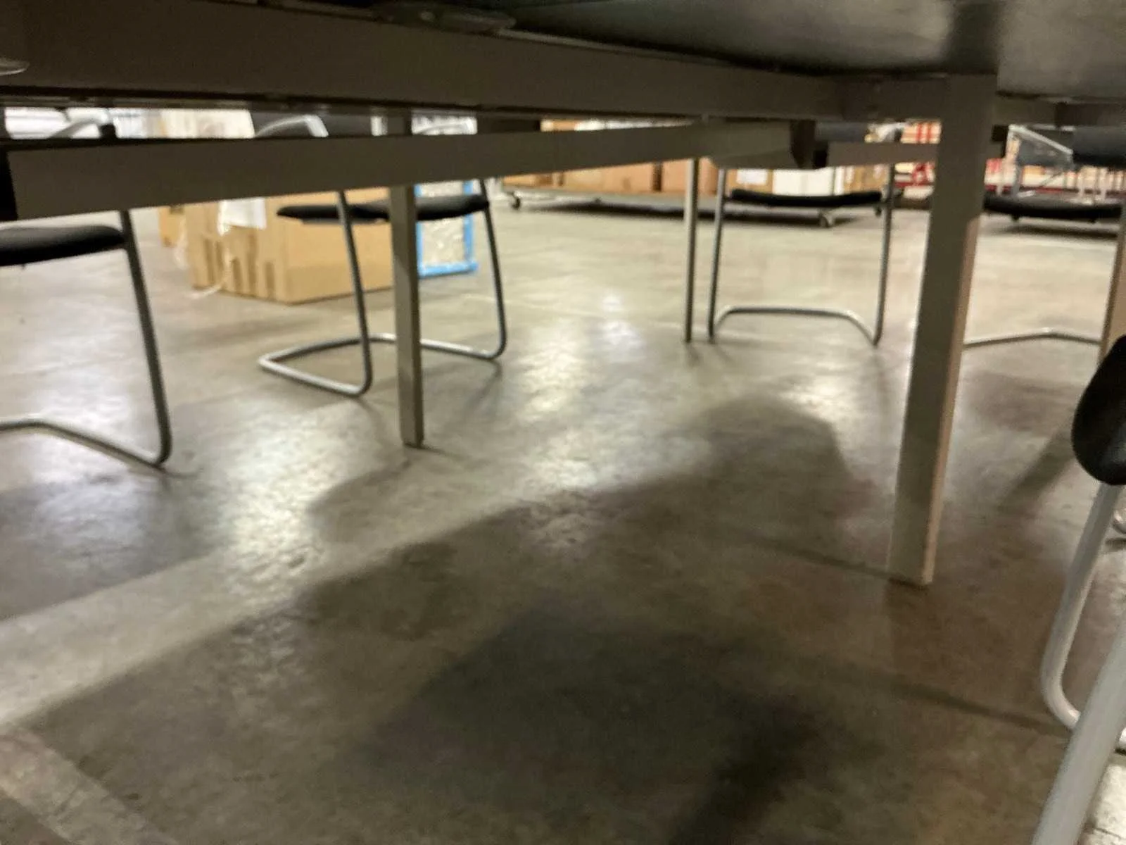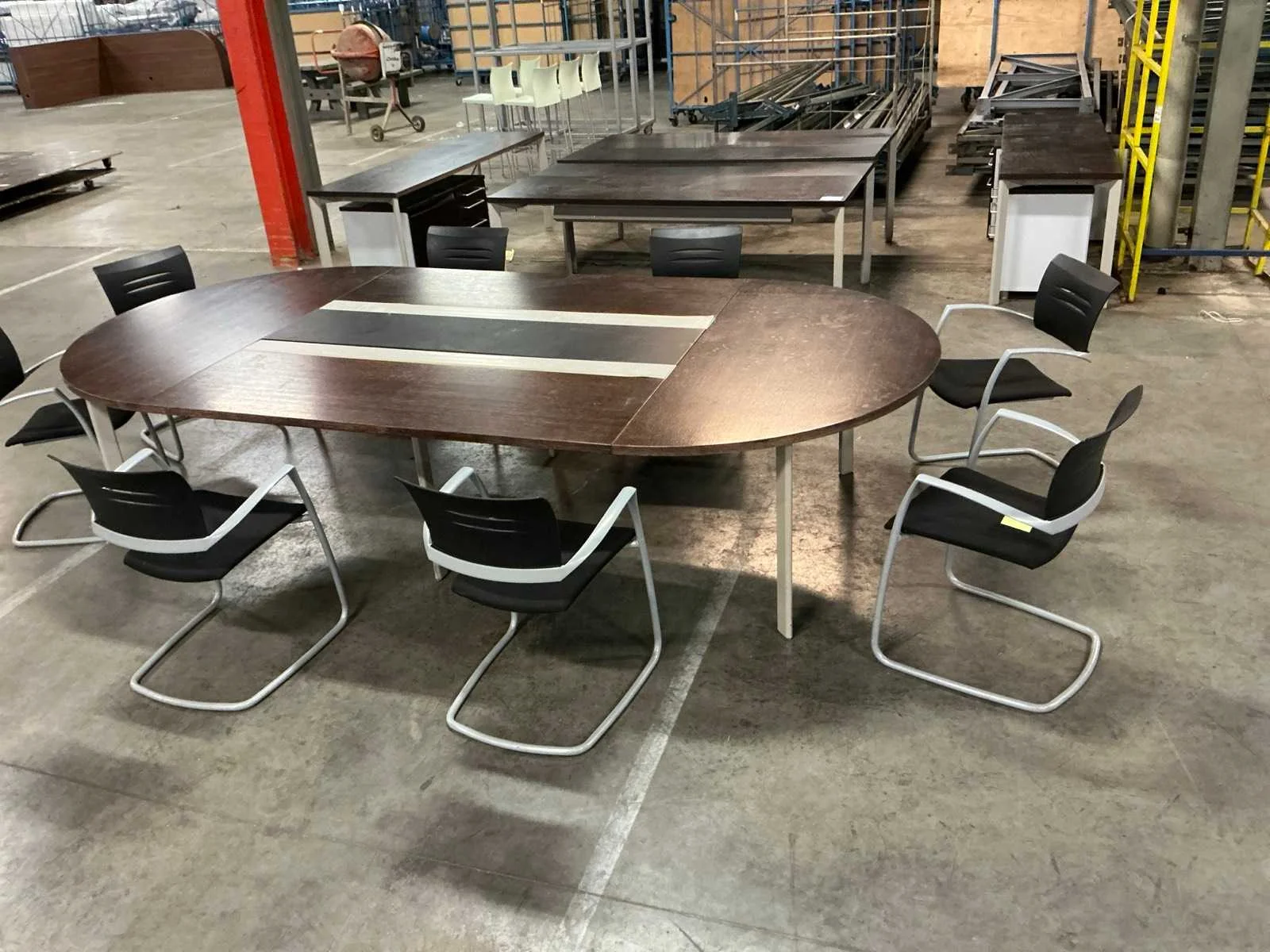 Bestaande uit 2 bureautafels 200x100cm, 3 ladenlokken, bijzettafel 200x60cm, bijzettafel 220x60cm, vergadertafel 320x160cm met 8 stoelen