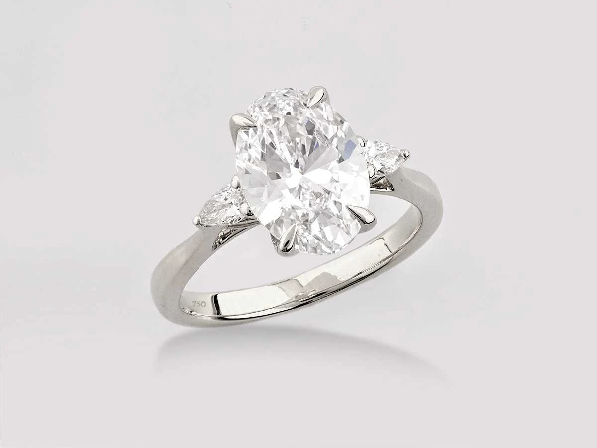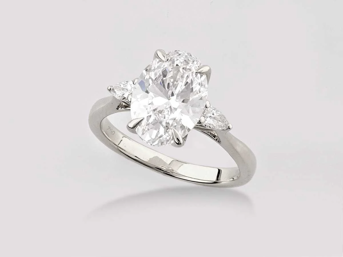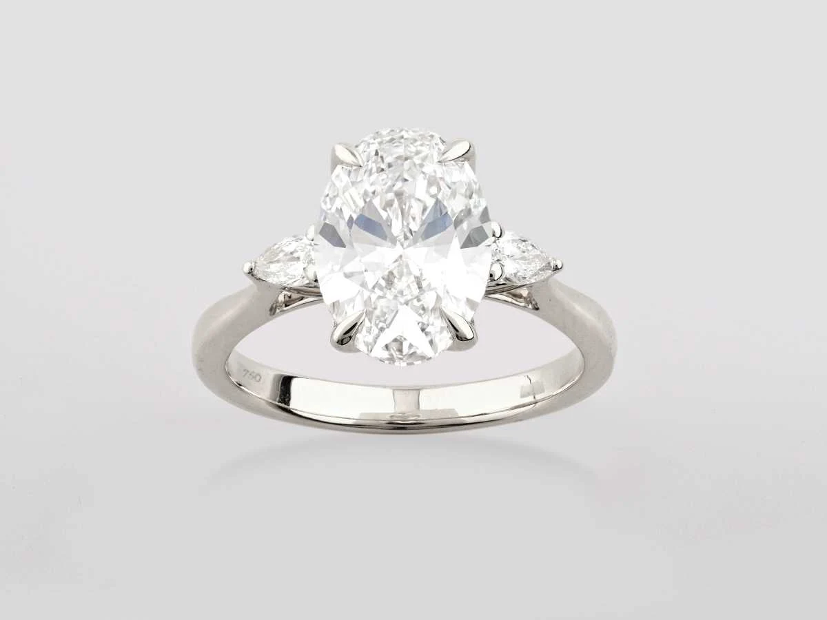 Number Of Items-1, Metal-Gold, Total Gross Weight- 3.55, Set With:Lab Grown Diamonds, Number Of Diamonds : 3, Total Carat Weight: 2.71, Diamonds Clarity: VS, Diamonds Shape/Cut : Pear/Oval Cut, Diamonds Colour: EF, Condition : New, EU-49, US-4¾, UK-J½ ( 15.29-15.61 mm), Gold Purity Hallmark On The Item Of Jewellery, Design Code : SR008327, Packaging : Jewellery Box with Certificate card, Historical Retail Price: €6995.Gold is at all time record highs. This production is new or unused jewellery. However it was made in a lower gold price then today and we do not increase the prices - retail recommended prices or estimated prices are based on HISTORIAL gold prices. It means the gold is discounted if you reflect todays cost .All our lots are shipped in Fedex boxes by high priority. You will receive a tracking code soon after you have paid for the auction lots. It is despatched in 7-14 days usually and delivery is done in 24-48 hours thereafter. The lots are insured and prepaid by the seller. Within 14 days Materiaal: Gold Kleur: White Voornaamste diamant: Lab Grown Diamonds Gewicht diamant: 2.71ct Totaal gewicht: 3.55g Kleur diamant: EF Zuiverheidsgraad diamant: VS