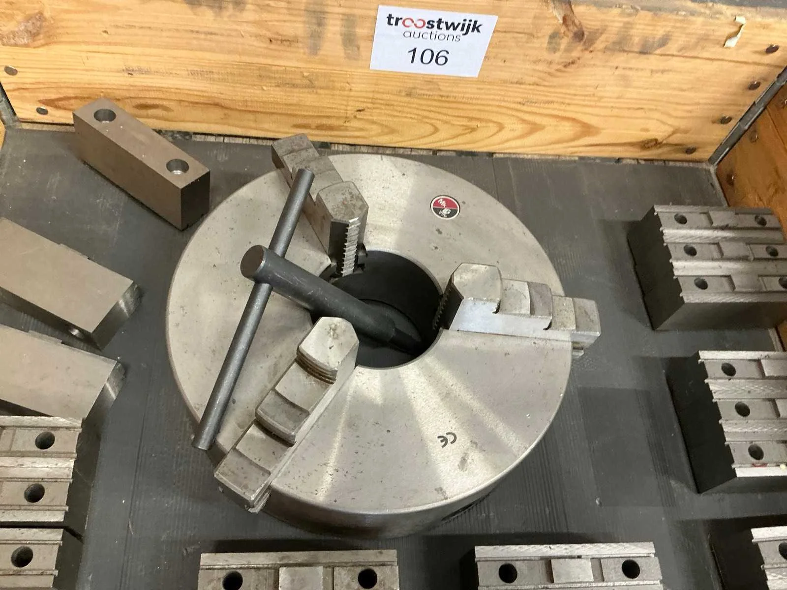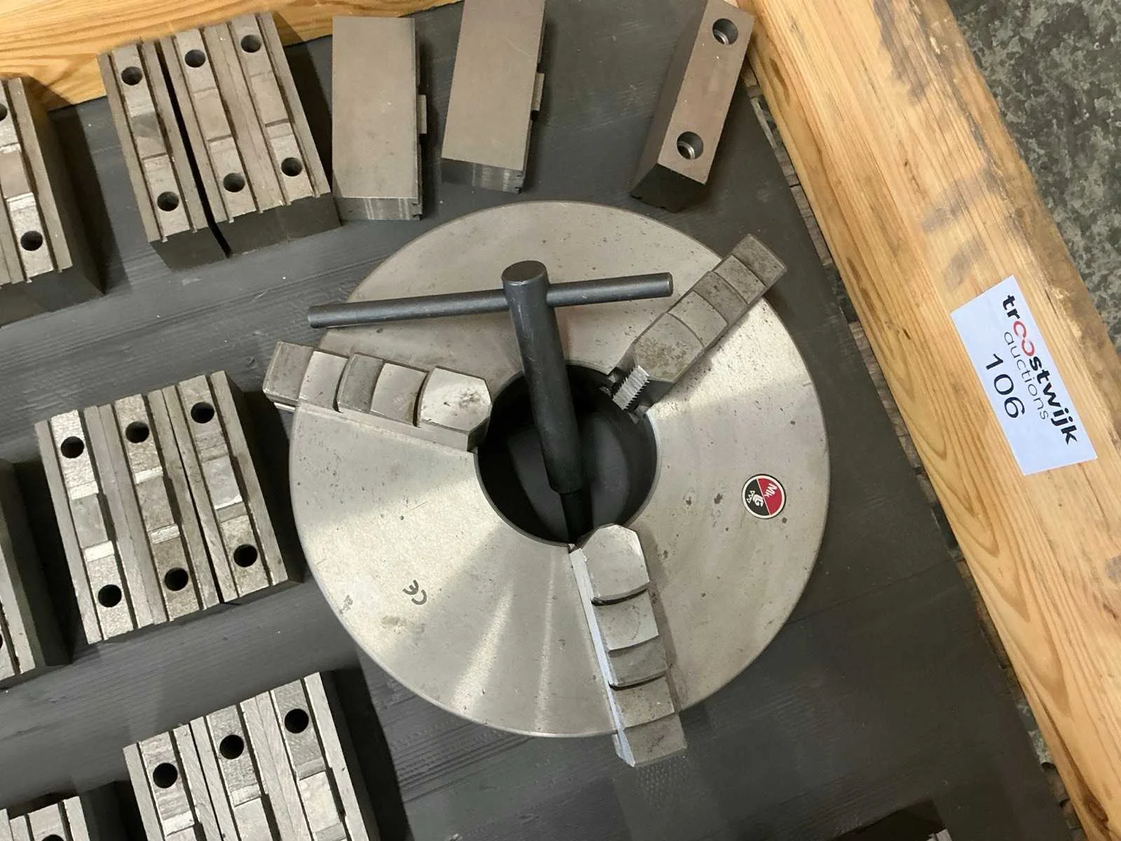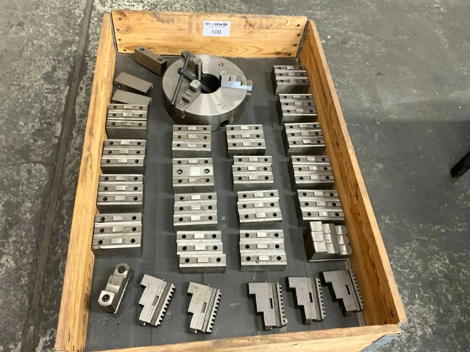 Doorlaat 105mm/ inclusief: groot assortiment grond en zachte klauwen/ ongebruikt/ gestapeld in palletbox 3-klauw: true Diameter circa: 315mm