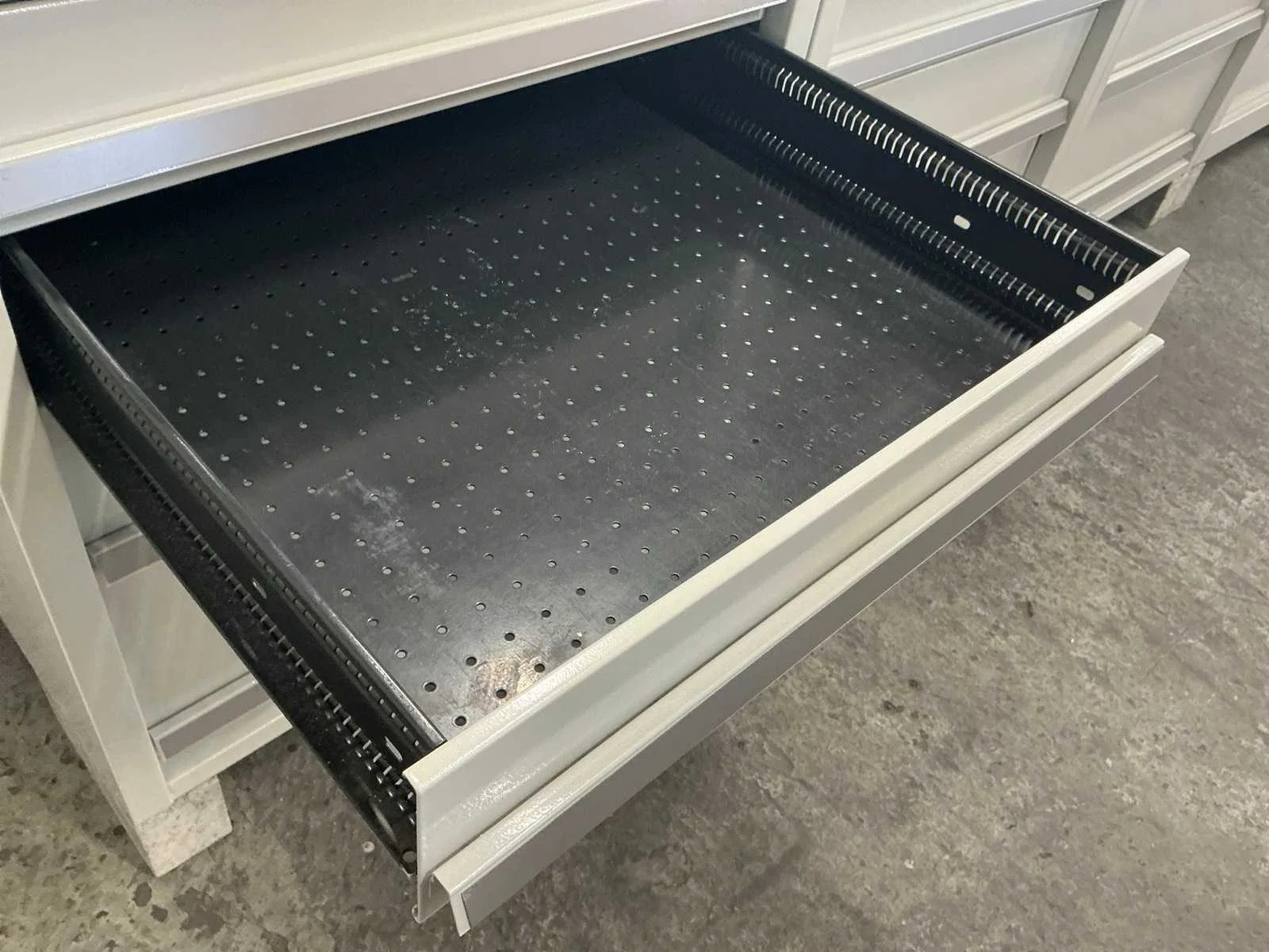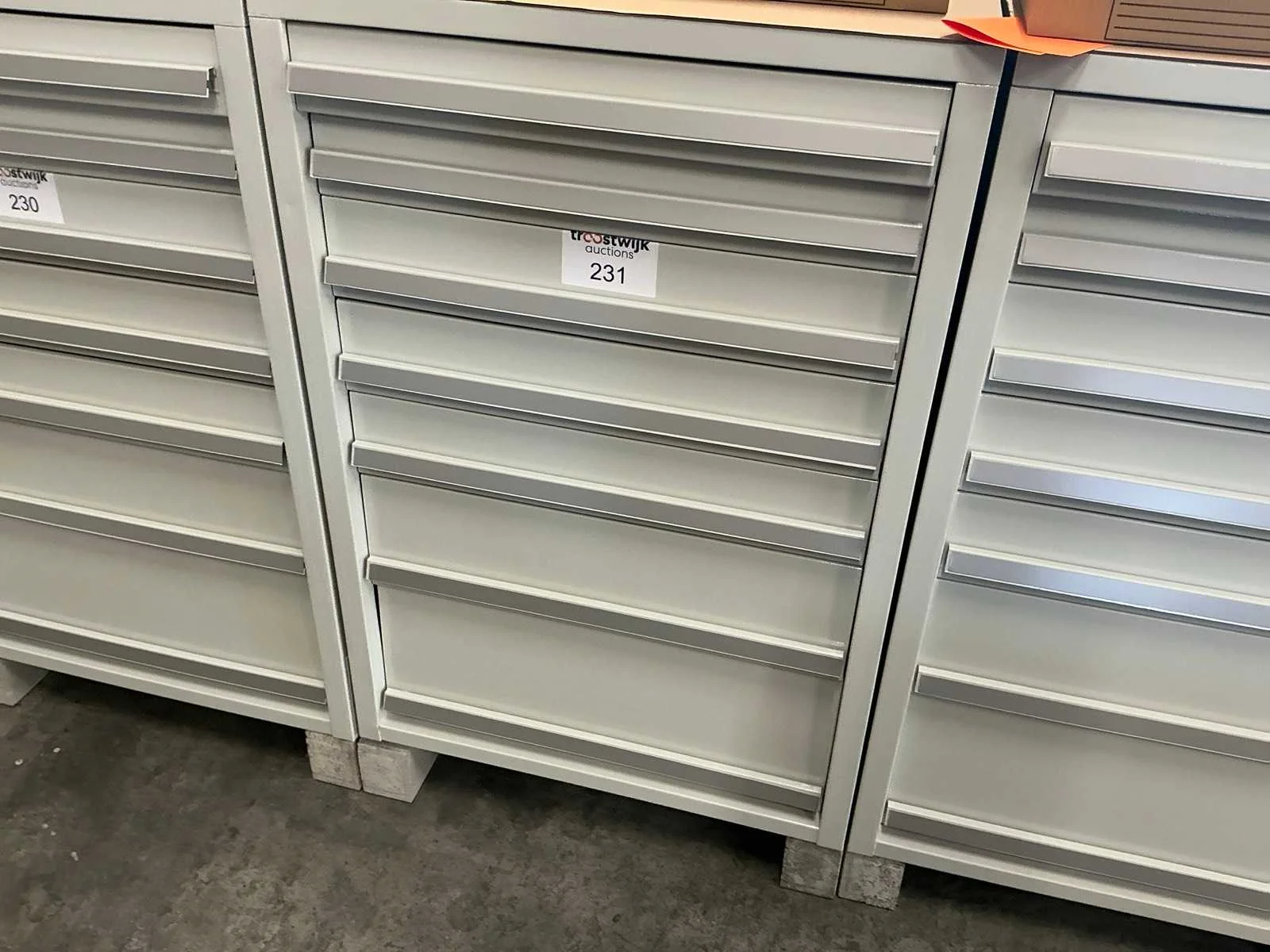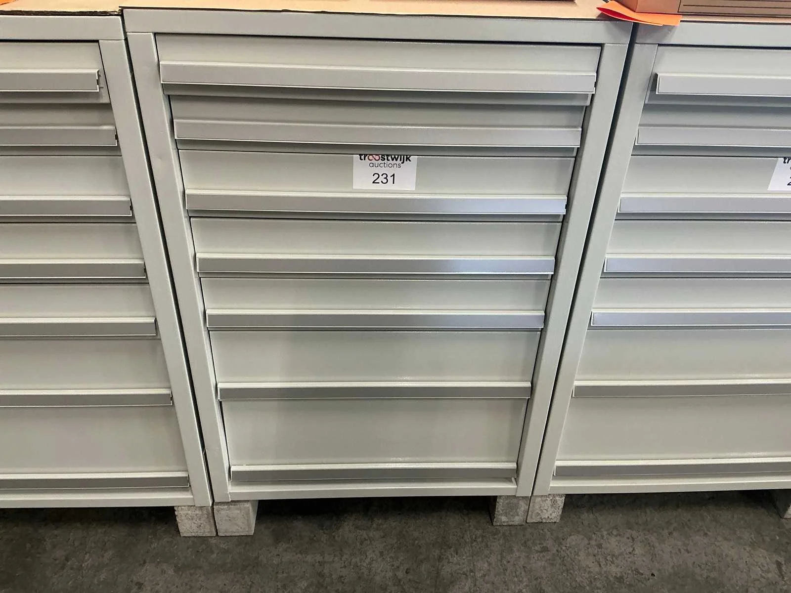 Fronthoogte lades: 2 lades met fronthoogte 85 mm/ 3 lades met fronthoogte 115 mm/ 1 lade met fronthoogte 175 mm/ 1 lade met fronthoogte 235 mm Kleur: RAL 7035 Lengte: 80 Breedte: 71.5cm Hoogte: 102.5cm