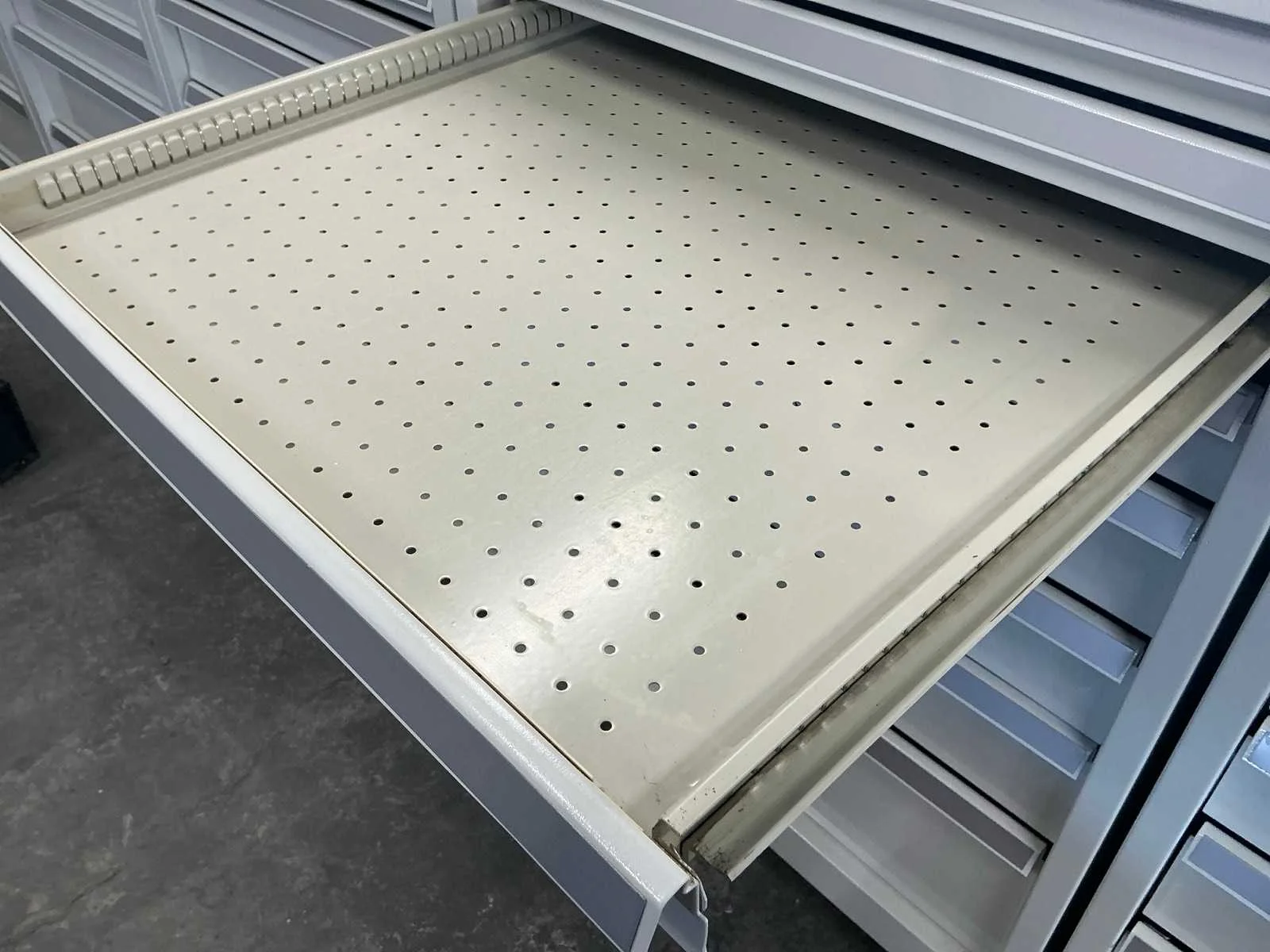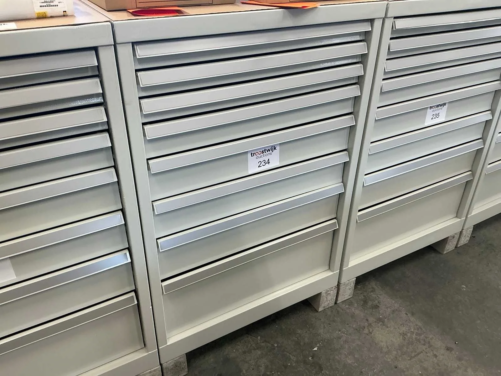 Fronthoogte lades: 3 lades met fronthoogte 55 mm/ 1 lade met fronthoogte 85 mm/ 2 lades met fronthoogte 115 mm/ 1 lade met fronthoogte 145 mm/ 1 lade met fronthoogte 240mm Merk: KIND Kleur: RAL 7035 Lengte: 76 Breedte: 71.5cm Hoogte: 102cm