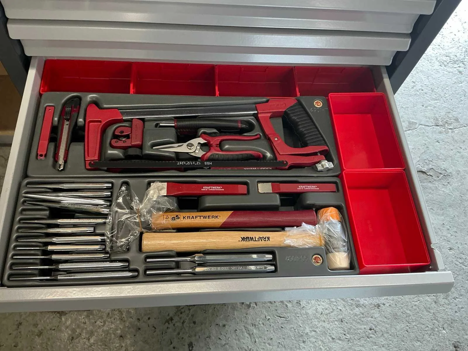 Inhoud bestaande uit 266 delig gereedschapsassortiment/ voorzien van inlegtrays en sorteerbakjes Merk: Kraftwerk Type: BT700S Aantal laden: 7 Met inhoud: true Totale afmeting L: 475mm Totale afmeting Breedte: 800mm Totale afmeting Hoogte: 1000mm