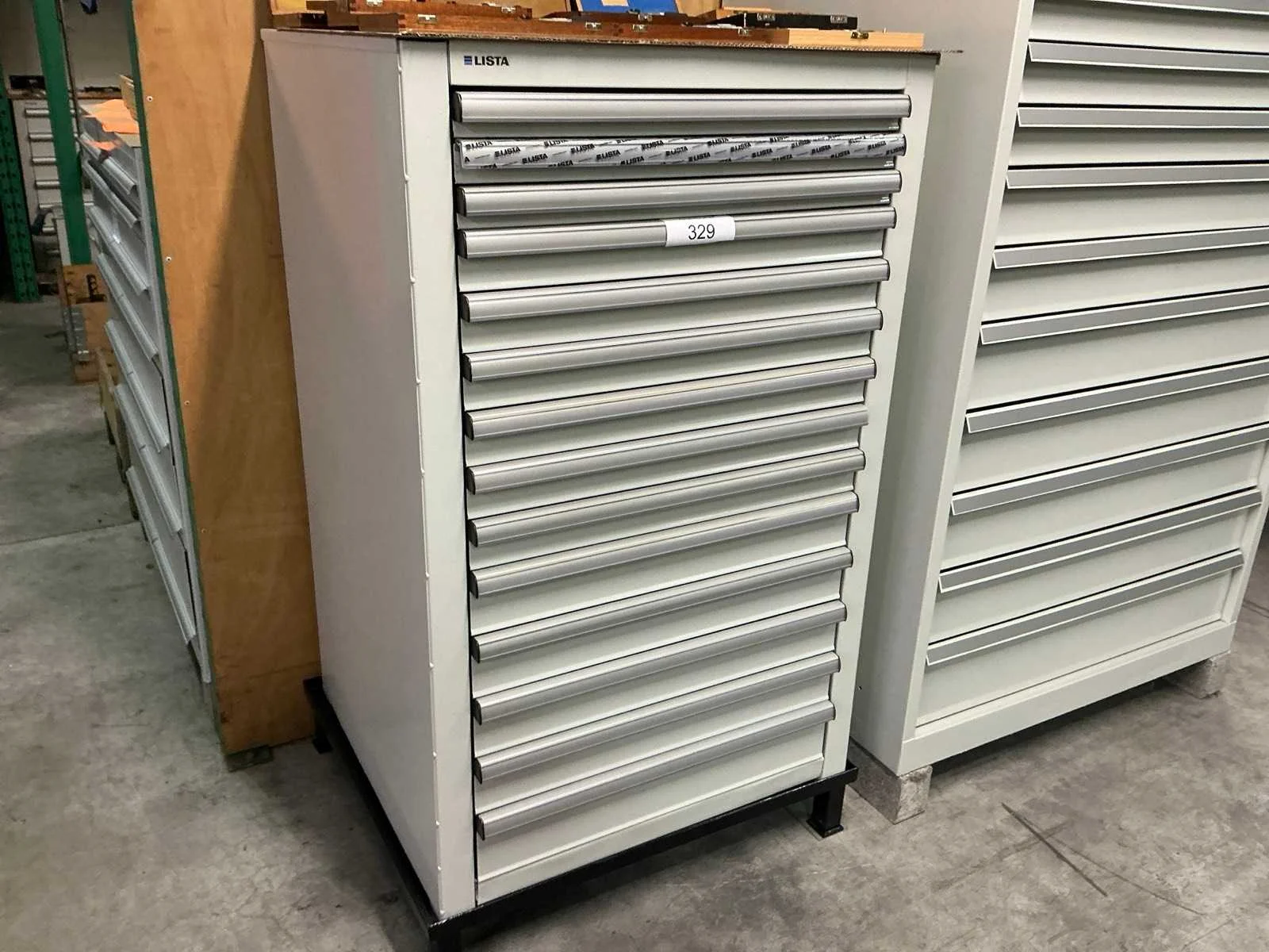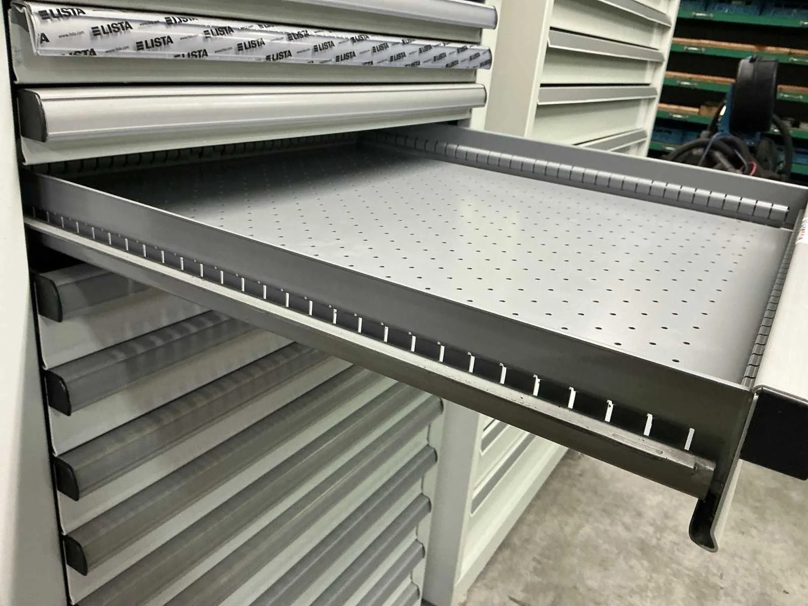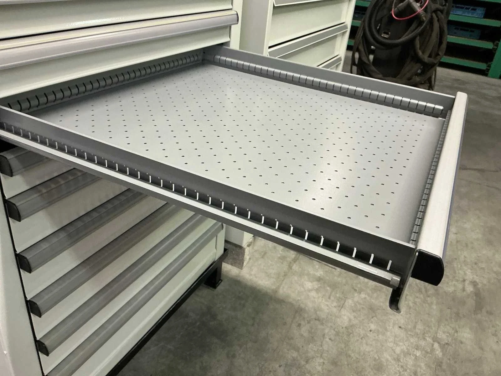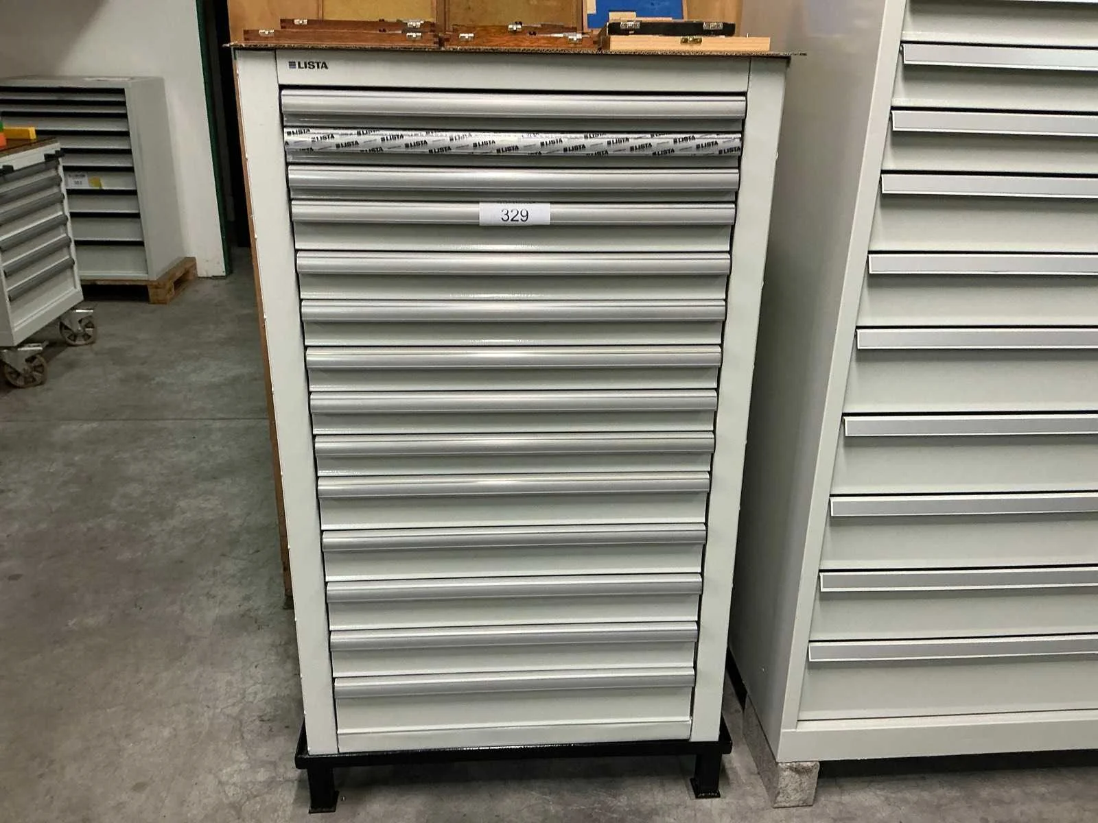 Fronthoogte lades: 3 lades met fronthoogte 50 mm/ 6 lades met fronthoogte 75 mm/ 4 lades met fronthoogte 100 mm/ 1 lade met fronthoogte 125 mm/ inclusief bijhorende metalen sokkel met hoogte 150mm Merk: Lista Kleur: RAL7035 Lengte: 70.5 Breedte: 77cm Hoogte: 125cm