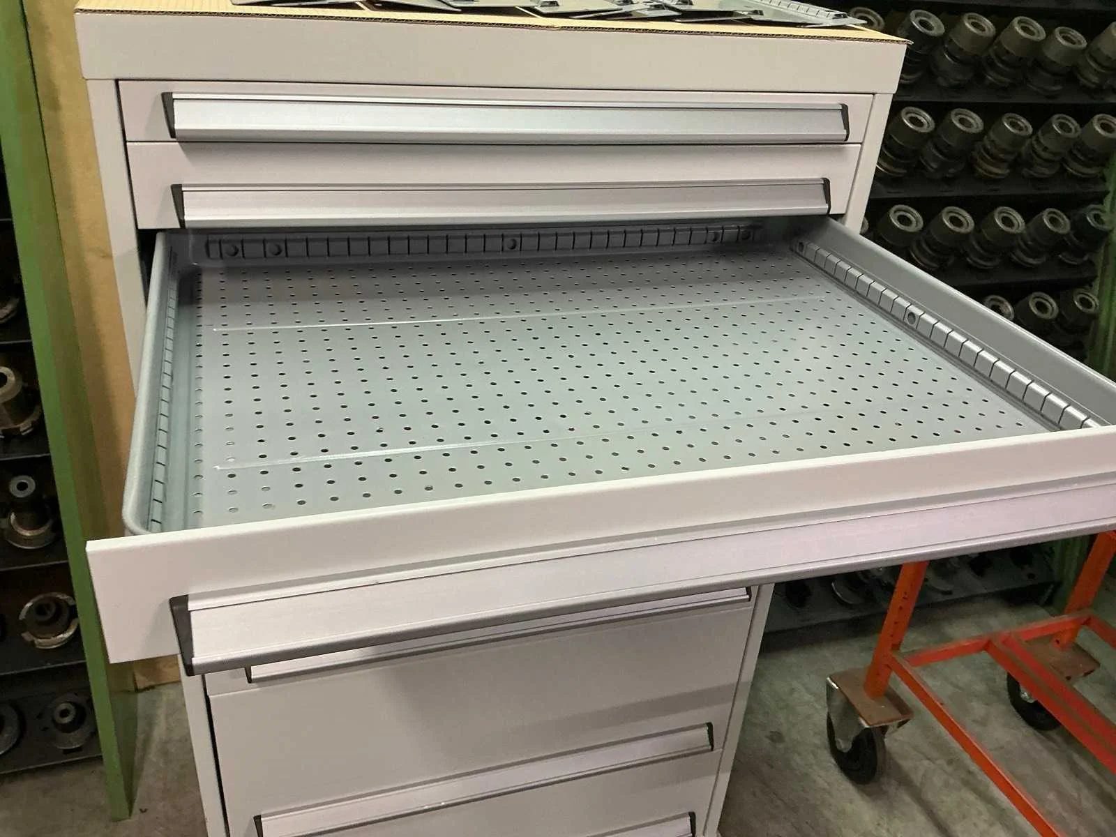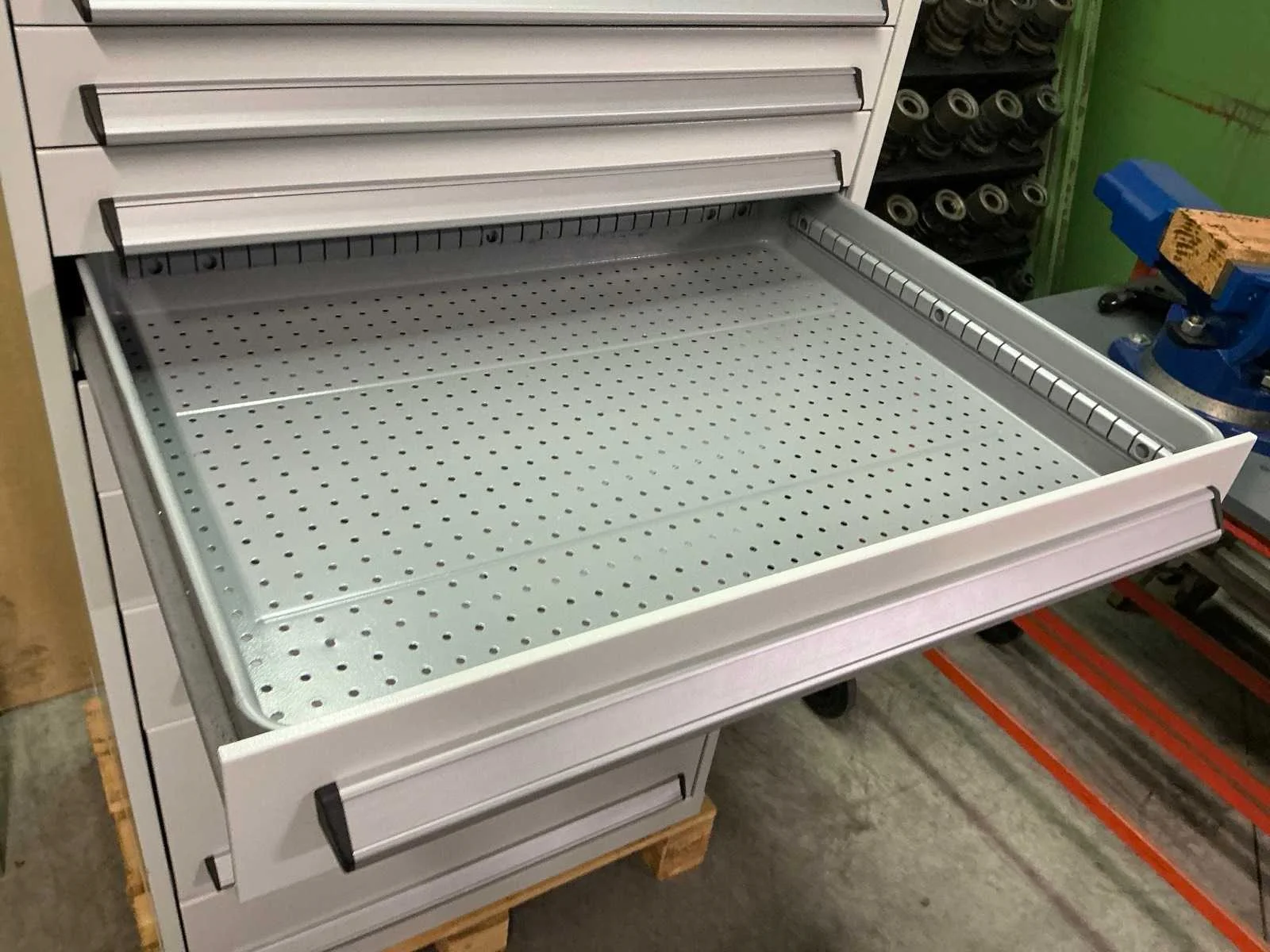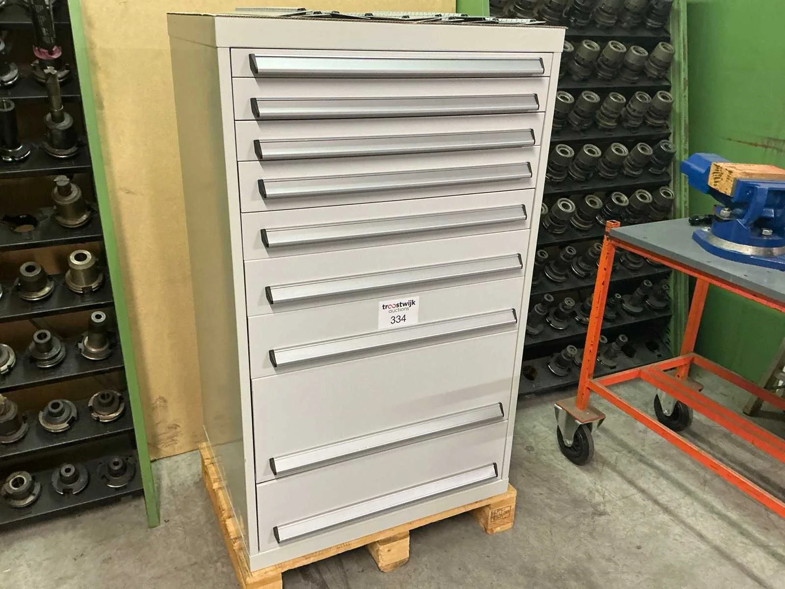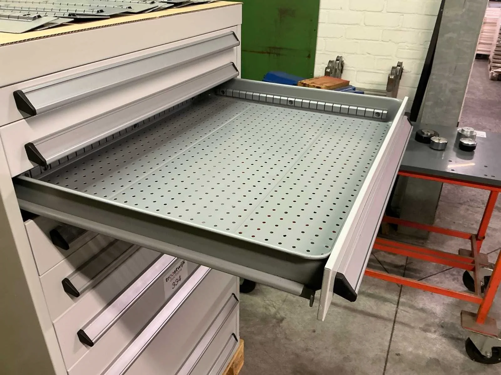 Fronthoogte lades: 1 lade met fronthoogte 50 mm/ 2 lades met fronthoogte 75 mm/ 2 lades met fronthoogte 100 mm/ 1 lade met fronthoogte 125 mm/ 1 lade met fronthoogte 150 mm/ 1 lade met fronthoogte 275 mm/ 1 lade met fronthoogte 200 mm/ voorzien van indeling Merk: Bott Kleur: RAL7035 Lengte: 60 Breedte: 75cm Hoogte: 125cm