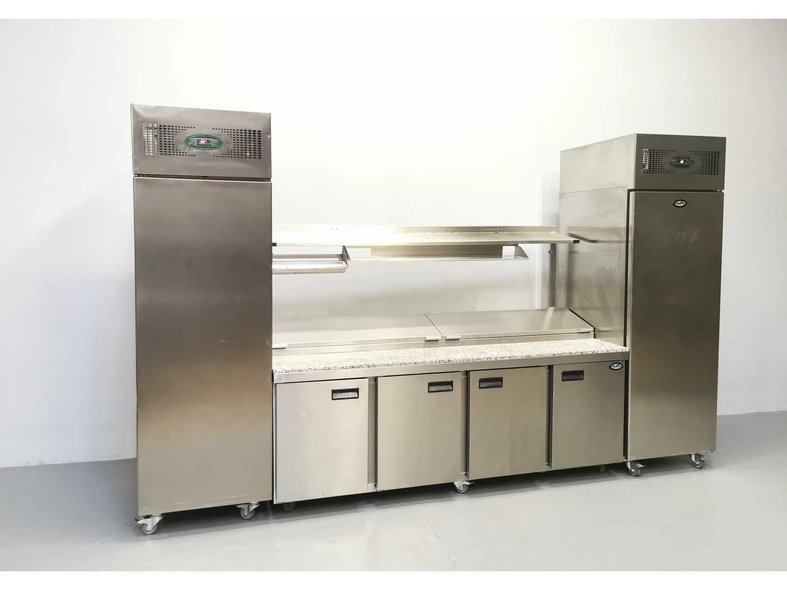 Combinatie koelkast, vriezer en gekoelde tafel voorzien van RVS dienbladen, marmeren werkblad, bovenste plank en bovenste opbergruimte. Koelkast en vriezer zijn EXTRA HOOG 228CM! MET ZEER GROTE CAPACITEIT, MET INKLAPBARE VOEDSELOPSLAGDOZEN Merk: Foster Type: FPS4GR/EPRO26BS Totale afmeting L: 370cm Totale afmeting Breedte: 85cm Totale afmeting Hoogte: 228cm Digitale uitlezing: true Ingebouwde koelcompressor: true Rvs: true Aansluiting: 230V Mobiel: true