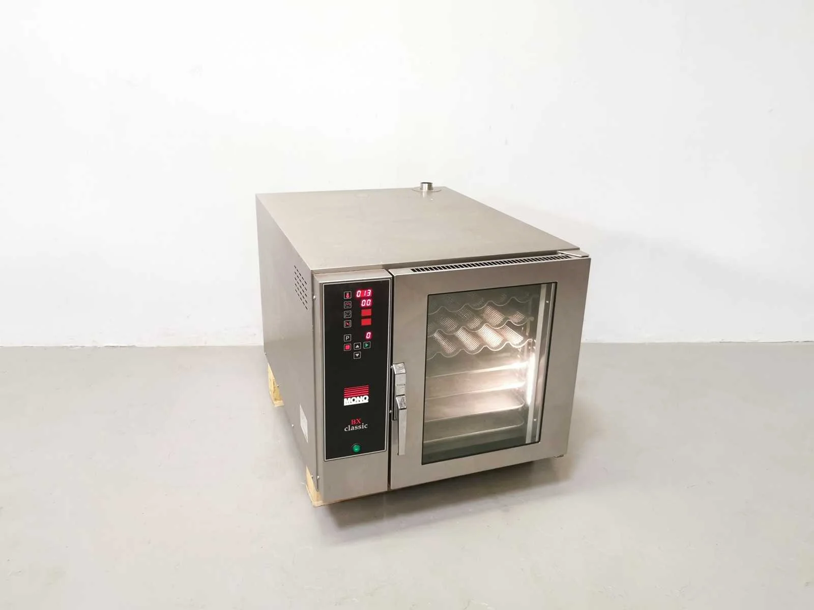 Voorzien van dienbladen. Merk: Mono Type: BX CLASSIC Aantal niveau's: 7 Aansluiting: 380V Touchscreen bediening: true Digitale besturing: true Elektrisch: true Rvs: true Totale afmeting L: 77cm Totale afmeting Breedte: 106cm Totale afmeting Hoogte: 70cm