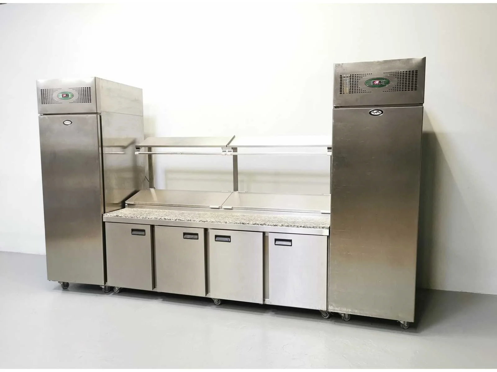Combinatie koelkast, vriezer en gekoelde tafel voorzien van RVS dienbladen, marmeren werkblad, bovenste plank en bovenste opbergruimte. Koelkast en vriezer zijn EXTRA HOOG 228CM! MET ZEER GROTE CAPACITEIT. Merk: Foster Type: FPS4GR/EPRO26BS Totale afmeting L: 370cm Totale afmeting Breedte: 85cm Totale afmeting Hoogte: 228cm Digitale uitlezing: true Ingebouwde koelcompressor: true Rvs: true Aansluiting: 230V Mobiel: true