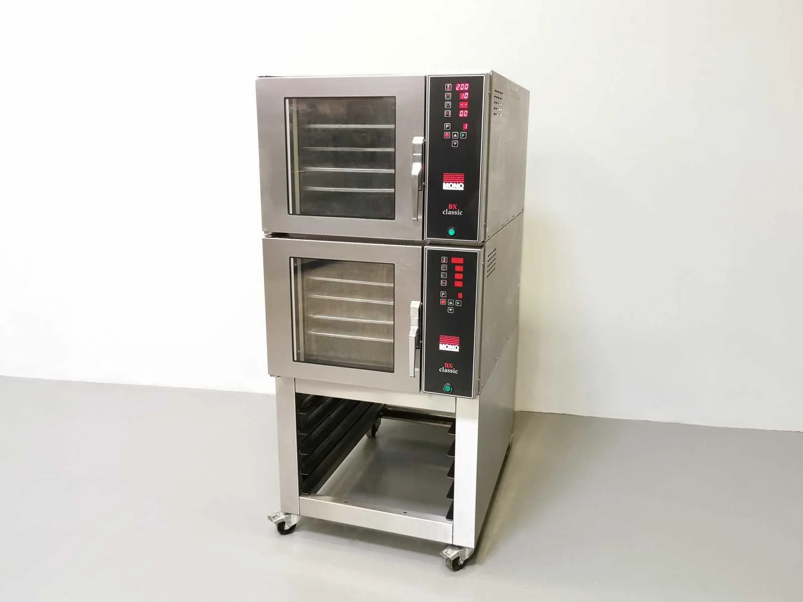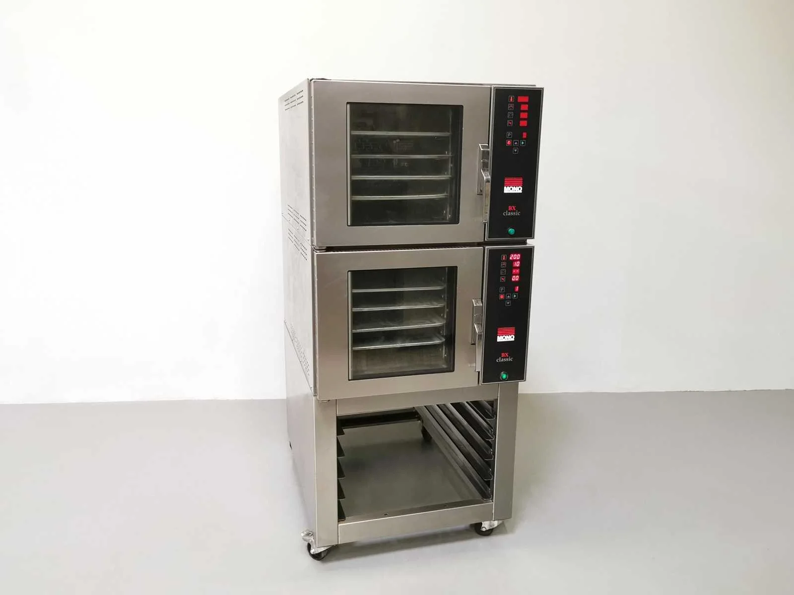 Dubbele stapel op verrijdbare trolley, voorzien van bakplaten, extra lange capaciteit, 3 FASE Merk: Mono Type: BX Classic Aantal niveau's: 8 Aansluiting: 380V Digitale besturing: true Elektrisch: true Rvs: true Totale afmeting L: 77cm Totale afmeting Breedte: 106cm Totale afmeting Hoogte: 176cm