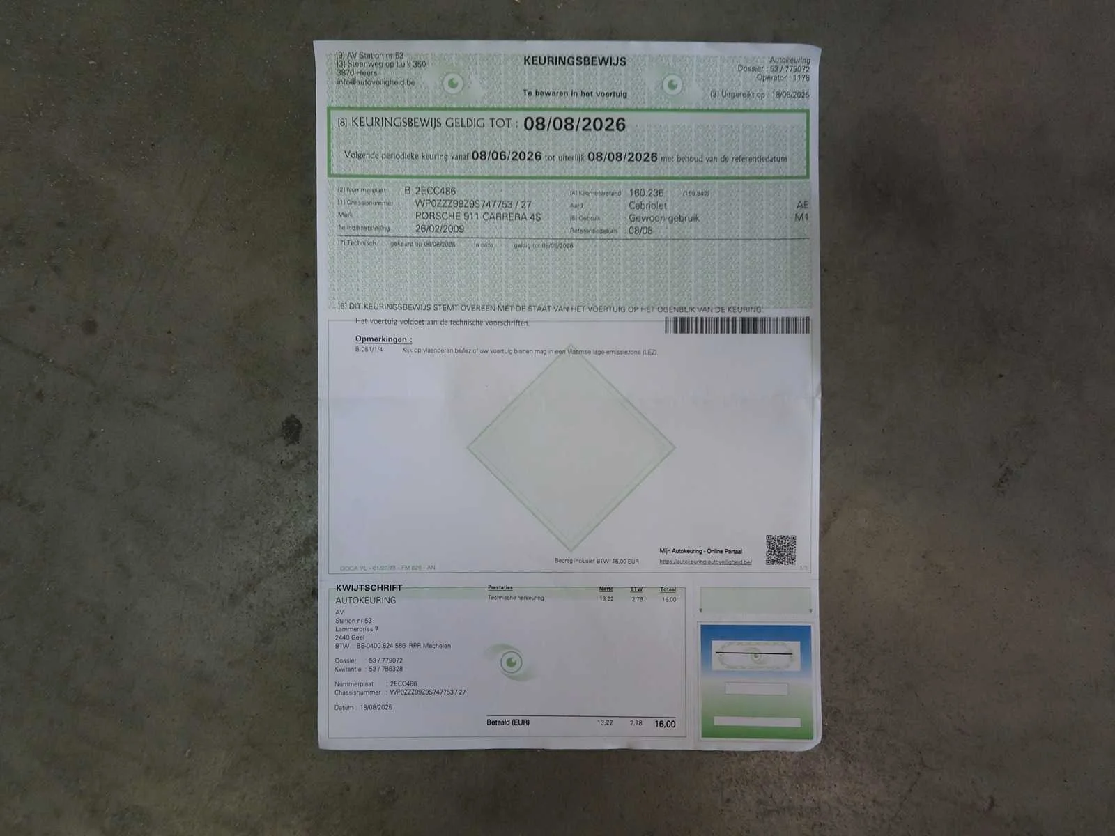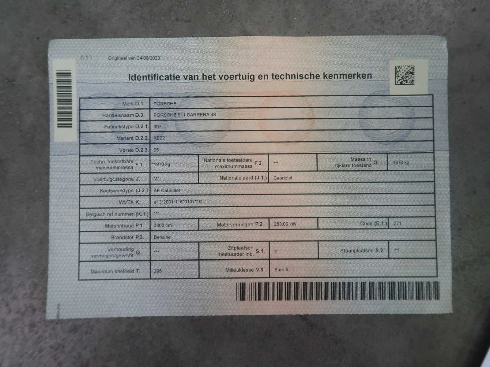 Chassisnummer: WP0ZZZ99Z9S747753 Merk: Porsche Model: 911 Carrera 4S Type: 997 Afgelezen kilometerstand: 160337km Brandstof: Benzine Datum eerste toelating: 26/02/2009 Boorddocumenten aanwezig?: true Nationaliteit documenten: BE Kentekenpapieren compleet?: true Carrosserie: Cabriolet Aandrijving: Achter Transmissie: Automaat Vermogen (kW): 283 Aantal deuren: 2 Aantal zitplaatsen: 4 Stuurwiel: Links Startinformatie: Start, rijd, remt Kleur: Licht grijs Cilinderinhoud: 3800 Aantal cilinders: 6 APK vervaldatum: 08/08/2026 Ledig gewicht: 1670