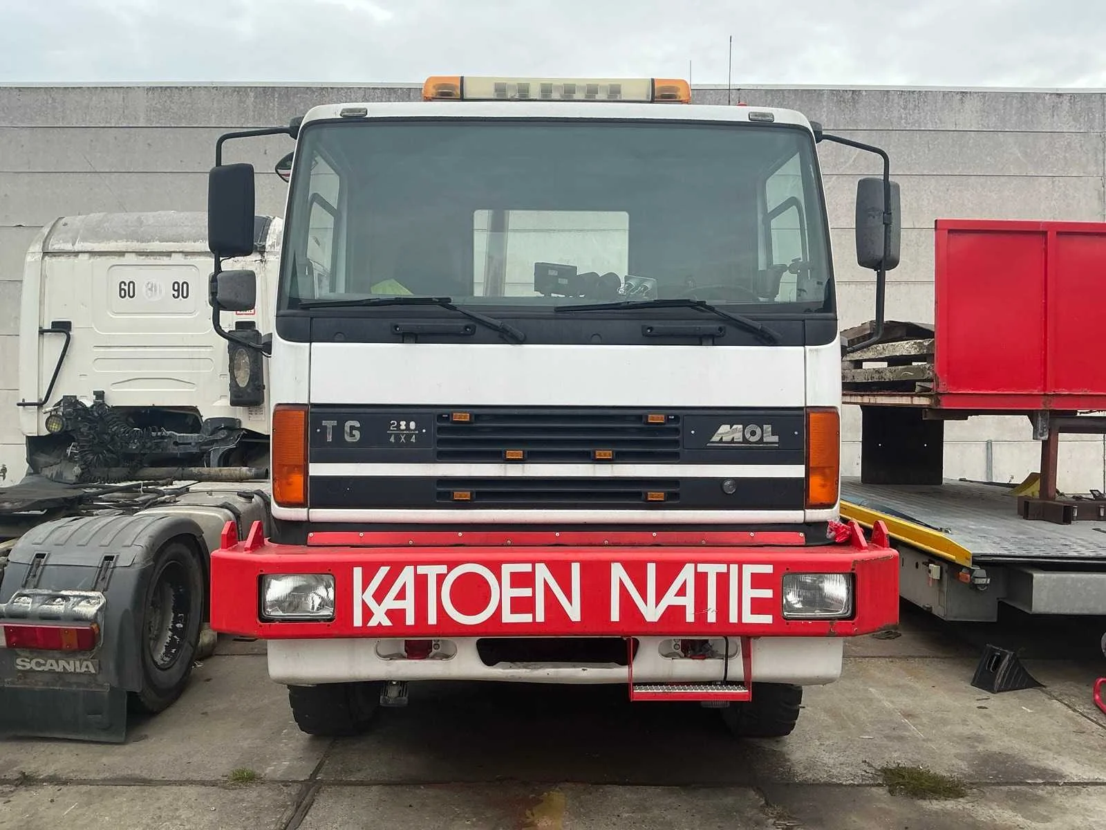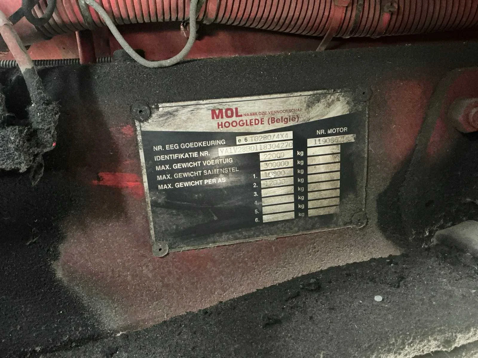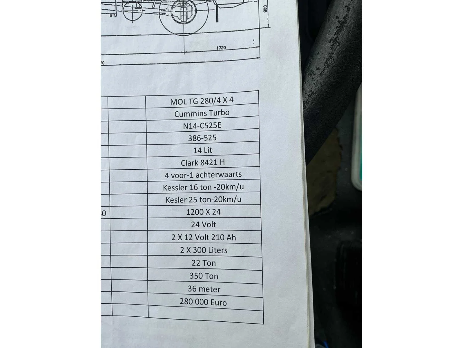 Motorvermogen: 525pk. Maximale sleep 350 ton. Afgelezen urenstand: 3937 uren. Voorzien van Cummins Turbo N14-C525E motor. Gebouwd op DAF cabine. Bandenmaat 12.00R24. Merk: MOL Type: TG 280 4x4 Chassisnummer VIN: YA1V28B0118304270 Cilinderinhoud: 14000cc Aantal assen: 2 Asconfiguratie: 4x4 Fuel Type: Diesel Aantal sleutels: 1 Gesloten opbouw: true Eigen gewicht: 22000kg Totale afmeting L: 7370mm Totale afmeting Breedte: 2560mm Totale afmeting Hoogte: 3000mm Nationaliteit documenten: Geen Aantal zitplaatsen: 2 Automaat: true