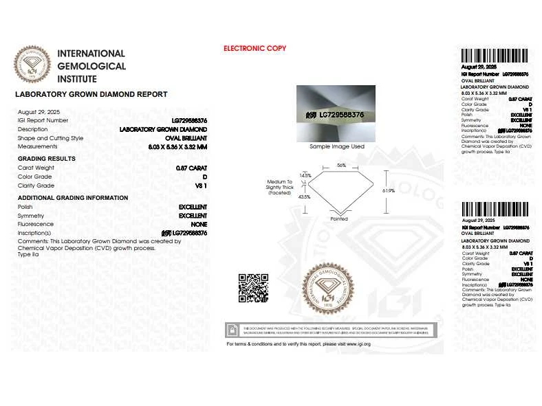 Alle diamanten hebben een gegraveerde laser-inscriptie. De kwaliteit is overgenomen uit het bijhorende certificaat. Bezorgtermijn 7 dagen Karaat: 0.87 Certificaat: 729588376 Voornaamste diamant: Labgrown Diamant (CVD) Kleur diamant: D Zuiverheidsgraad diamant: VS1