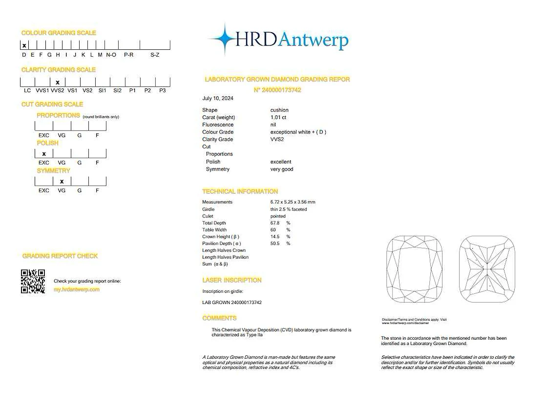 Alle diamanten hebben een gegraveerde laser-inscriptie. De kwaliteit is overgenomen uit het bijhorende certificaat. Bezorgtermijn 7 dagen Karaat: 1.01 Certificaat: 240000173742 Voornaamste diamant: Labgrown Diamant (CVD) Kleur diamant: D Zuiverheidsgraad diamant: VVS2