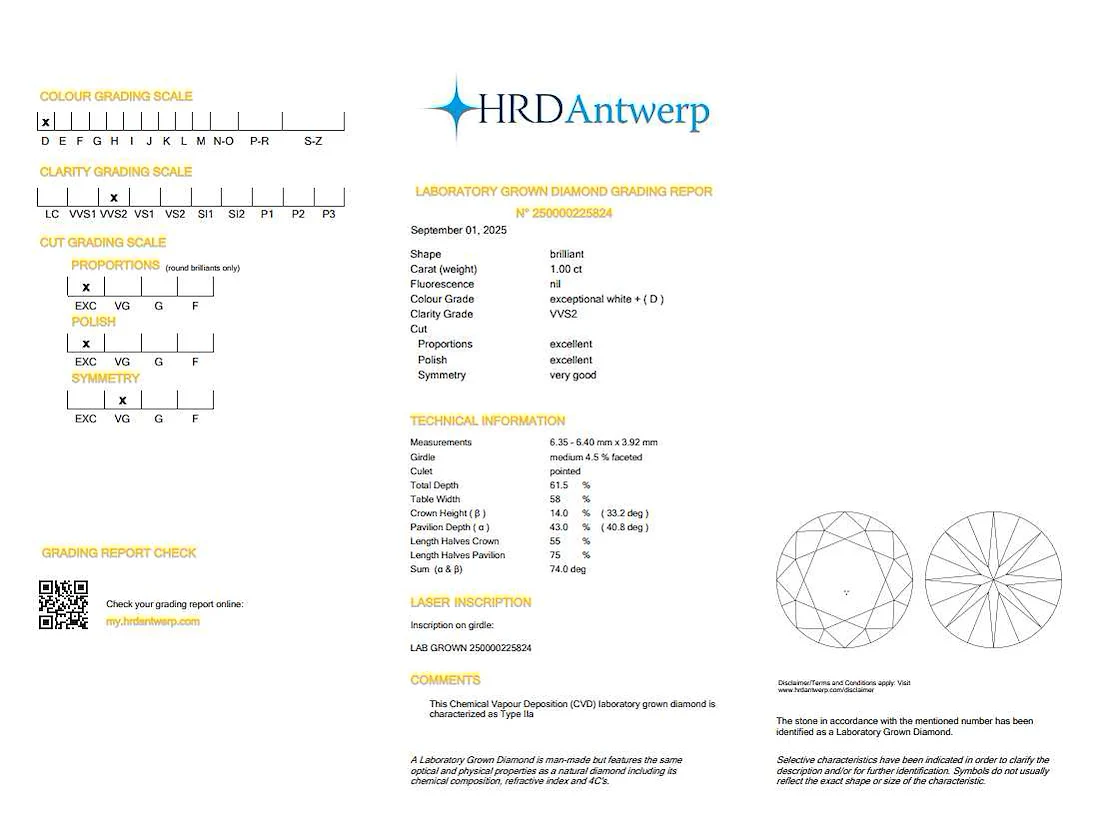 Alle diamanten hebben een gegraveerde laser-inscriptie. De kwaliteit is overgenomen uit het bijhorende certificaat. Bezorgtermijn 7 dagen Karaat: 1.00 Certificaat: 250000225824 Voornaamste diamant: Labgrown Diamant (CVD) Kleur diamant: D Zuiverheidsgraad diamant: VVS2
