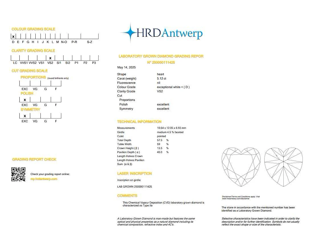 Alle diamanten hebben een gegraveerde laser-inscriptie. De kwaliteit is overgenomen uit het bijhorende certificaat. Bezorgtermijn 7 dagen Karaat: 5.12 Certificaat: 250000111425 Voornaamste diamant: Labgrown Diamant (CVD) Kleur diamant: D Zuiverheidsgraad diamant: VS2