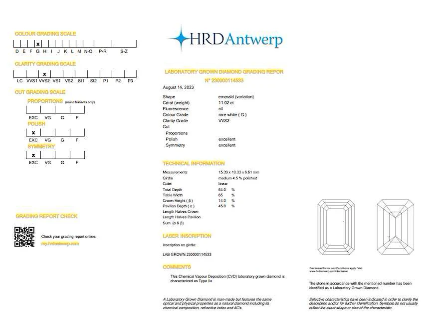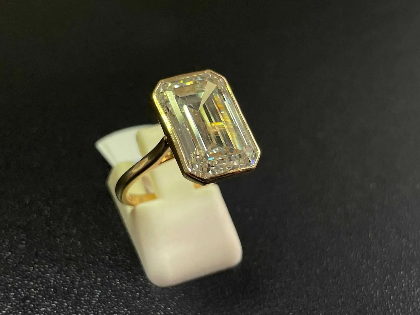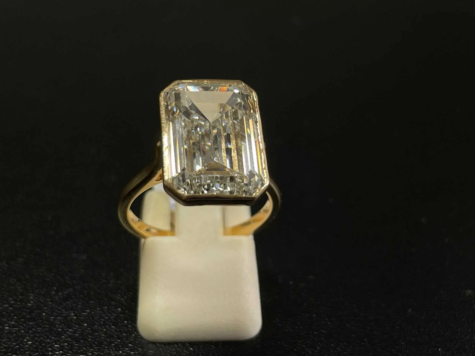 De ringmaat kan aangepast worden naar wens, hiervoor zal contact opgenomen worden met de klant binnen de 2 dagen na het sluiten van de veiling. het vermelde gewicht betreft enkel het goud, exclusief de ingezette diamant Bezorgtermijn 7 dagen Product type: 18k geelgoud Voornaamste diamant: Labgrown diamant (CVD) Kleur diamant: G Gewicht diamant: 11.02ct Zuiverheidsgraad diamant: VVS2 Gewicht: 4.15g