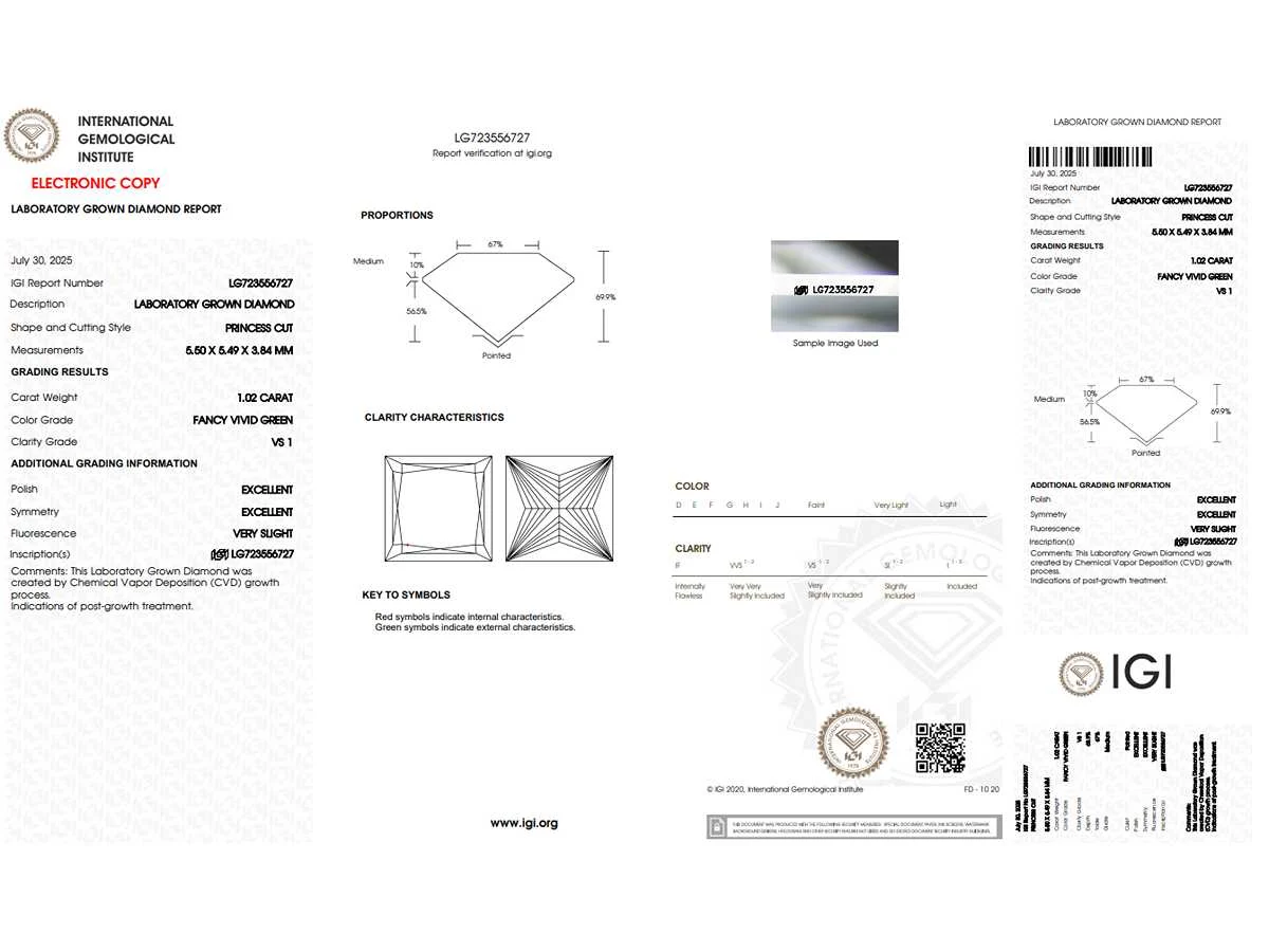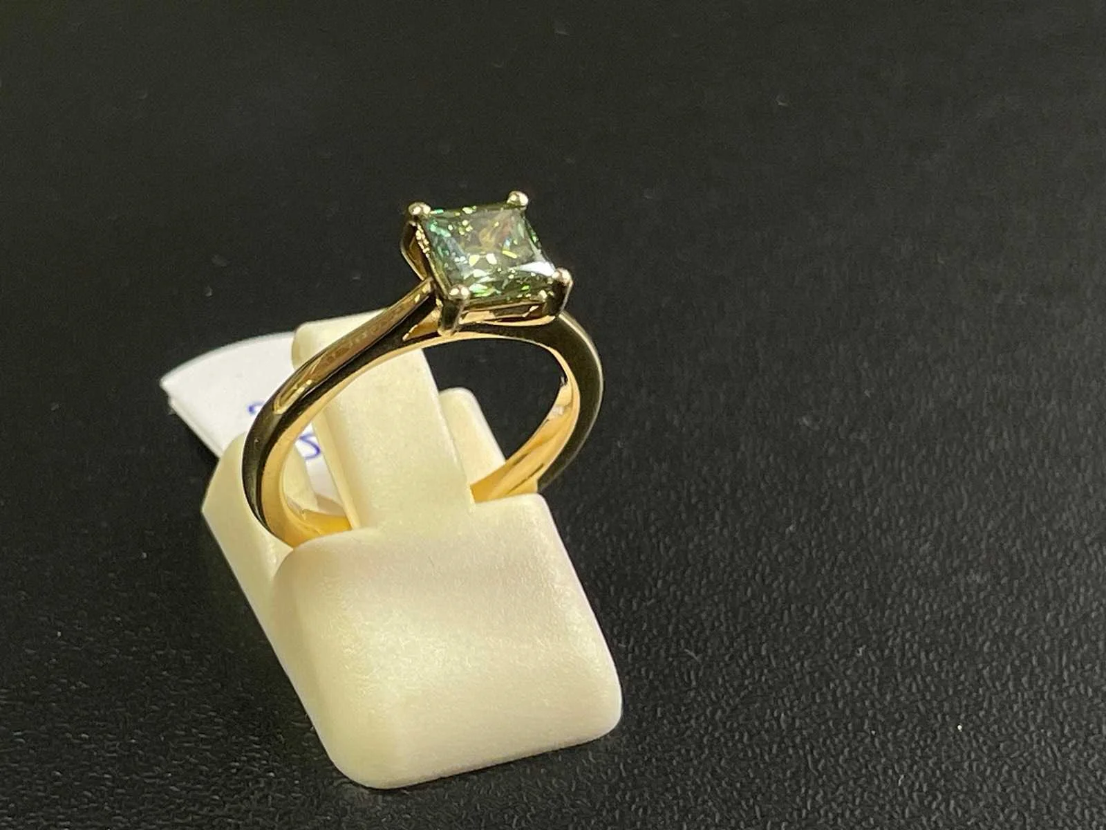 De ringmaat kan op wens van de klant worden aangepast. Binnen twee werkdagen na ontvangst van de betaling wordt contact opgenomen om de gewenste maat te bevestigen. Het vermelde gewicht betreft het gewicht van het goud (in gram). Bezorgtermijn 7 dagen Product type: 18k geelgoud Voornaamste diamant: Labgrown diamant (CVD) Kleur diamant: Fancy Vivid green Gewicht diamant: 1.02ct Slijpvorm diamant: princess cut Zuiverheidsgraad diamant: VS1 Certificaat: 723556727 Gewicht: 3.67g