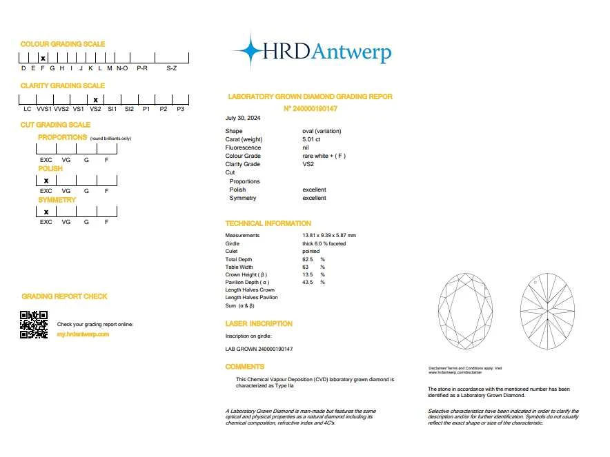 De ringmaat kan aangepast worden naar wens, hiervoor zal contact opgenomen worden met de klant binnen de 2 dagen na het sluiten van de veiling. het vermelde gewicht betreft enkel het goud, exclusief de ingezette diamant Bezorgtermijn 7 dagen Product type: 18k geelgoud Voornaamste diamant: Labgrown diamant (CVD) Kleur diamant: F Gewicht diamant: 5.01ct Zuiverheidsgraad diamant: VS2 Gewicht: 4.46g