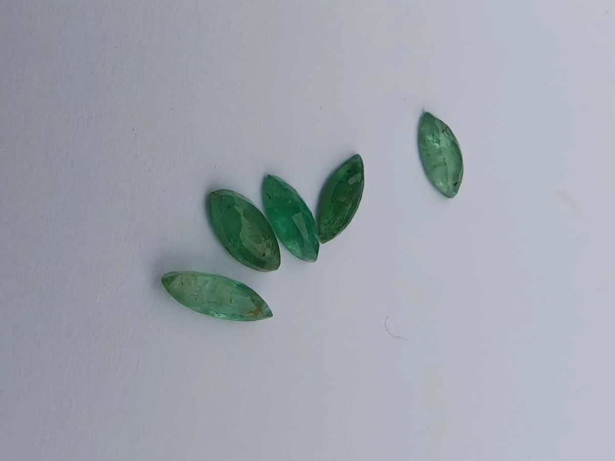 5 Gepolijste natuurlijke smaragd. 1.2Cts, Opruiming kavel. Dit zijn natuurlijke, onbehandelde groene smaragden! Marquise gesneden vormig. Historische verkoopprijs: €600. Al onze kavels worden verzonden in Fedex-dozen met hoge prioriteit. U ontvangt een trackingcode kort nadat u de veilingkavels heeft betaald. Het wordt meestal binnen 7-14 dagen verzonden en de levering vindt plaats in 24-48 uur daarna. De kavels zijn verzekerd en vooruitbetaald door de verkoper. Geen certificaat inbegrepen, wordt verpakt in een verzegelde of edelstenen doos. Edelsteen: emerald Kleur edelsteen: Natural green Gewicht edelsteen: 1.2 Slijpvorm edelsteen: Marquise cut