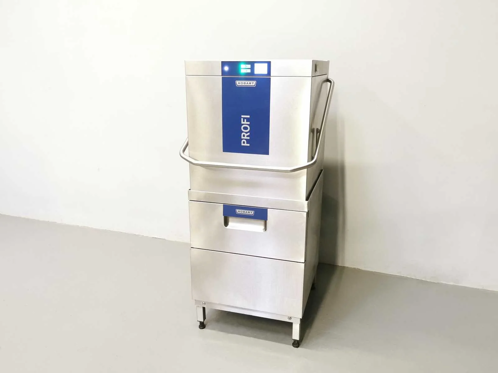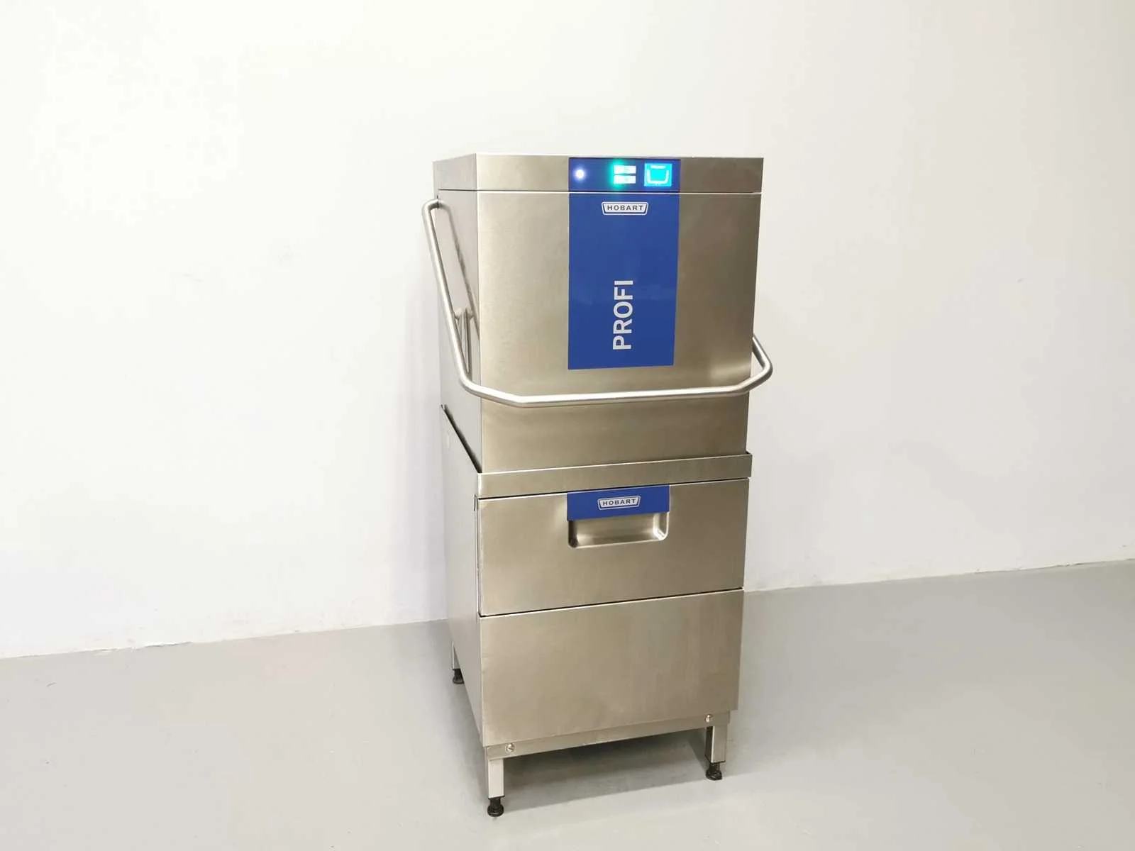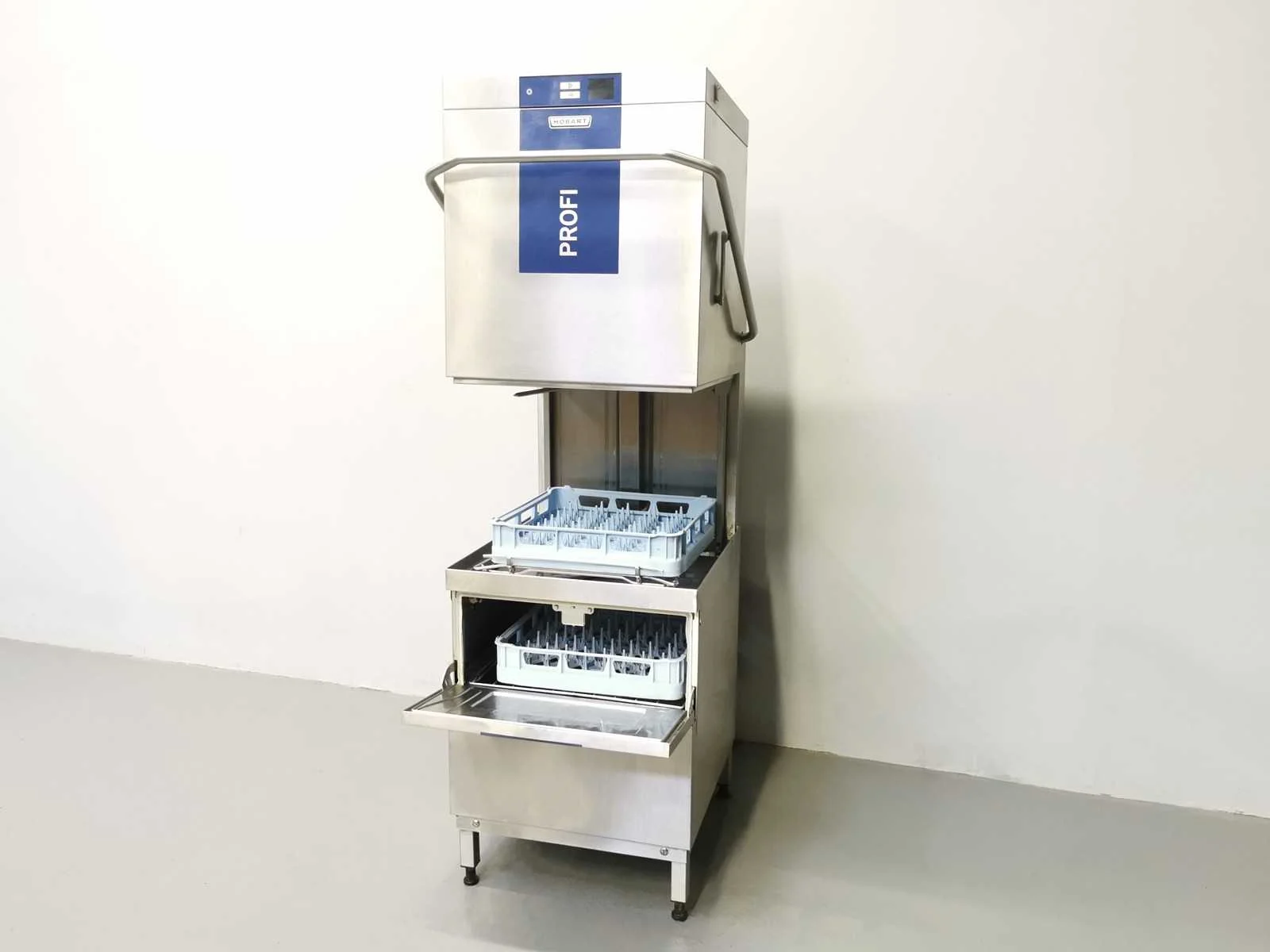 Hobart Profi doorschuifvaatwasser op twee niveaus Merk: Hobart Model: TLWW-10A Spanning: 380V Lengte: 80cm Breedte: 80cm Hoogte: 153cm