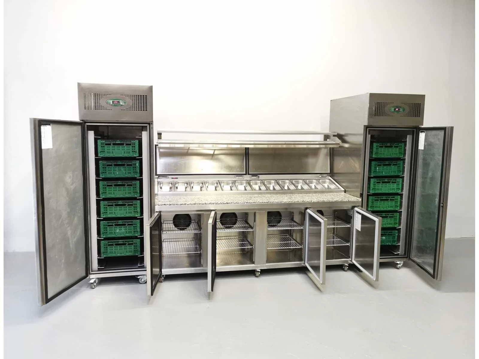 Combinatie koelkast, vriezer en gekoelde tafel voorzien van RVS dienbladen, marmeren werkblad, bovenste plank en bovenste opbergruimte. MET ZEER GROTE CAPACITEIT, MET INKLAPBARE VOEDSELOPSLAGDOZEN Merk: Foster Type: FPS4GR/EPRO20BS Totale afmeting L: 370cm Totale afmeting Breedte: 85cm Totale afmeting Hoogte: 208cm Digitale uitlezing: true Ingebouwde koelcompressor: true Rvs: true Aansluiting: 230V Mobiel: true