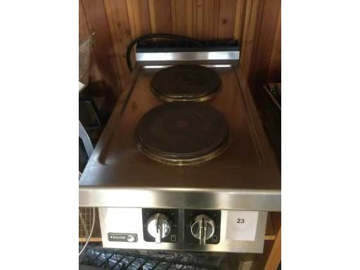 Elektrisch fornuis; opzetmodel; bouwjaar 09/2019; Merk: Fagor Model: CE7-20 Kookzones: 2 Vermogen: 5200W Spanning: 400V Gewicht: 25kg Lengte: 40mm Breedte: 75mm Hoogte: 27mm